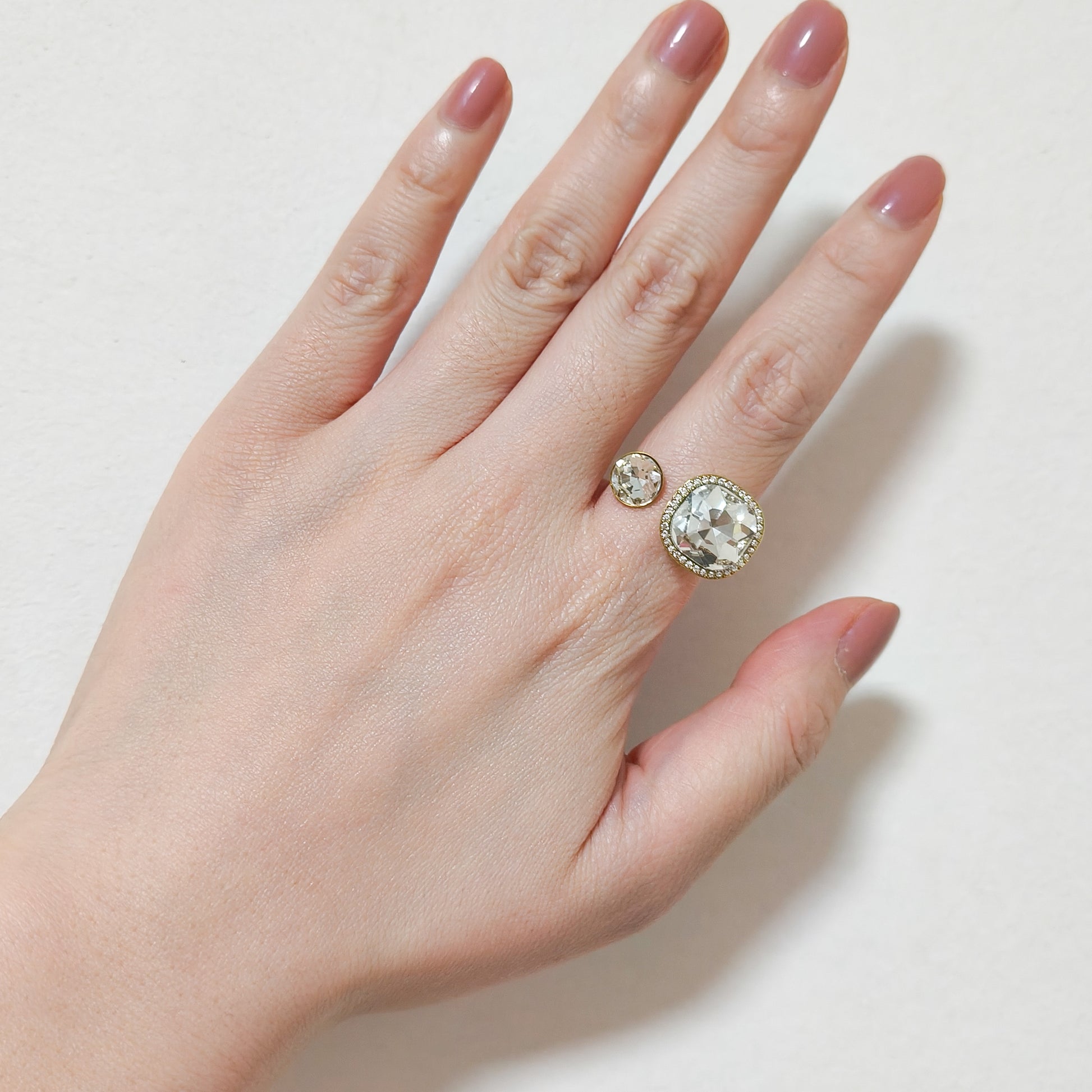 Anillo abierto con dos piezas de cristal transparente, una grande y otra más pequeña, que captan la luz de forma espectacular.