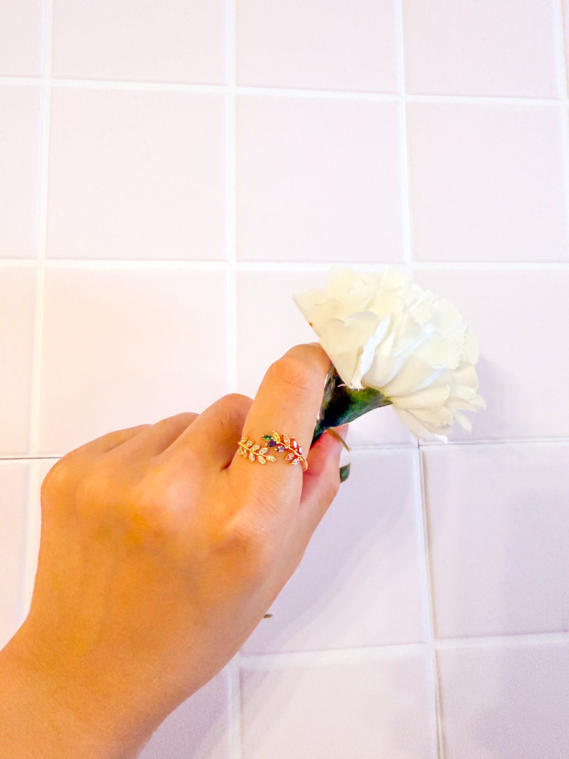 Anillo con diseño de hojas decoradas con piedras de colores. Elaborado con material hipoalergénico, cómodo y seguro para pieles sensibles.