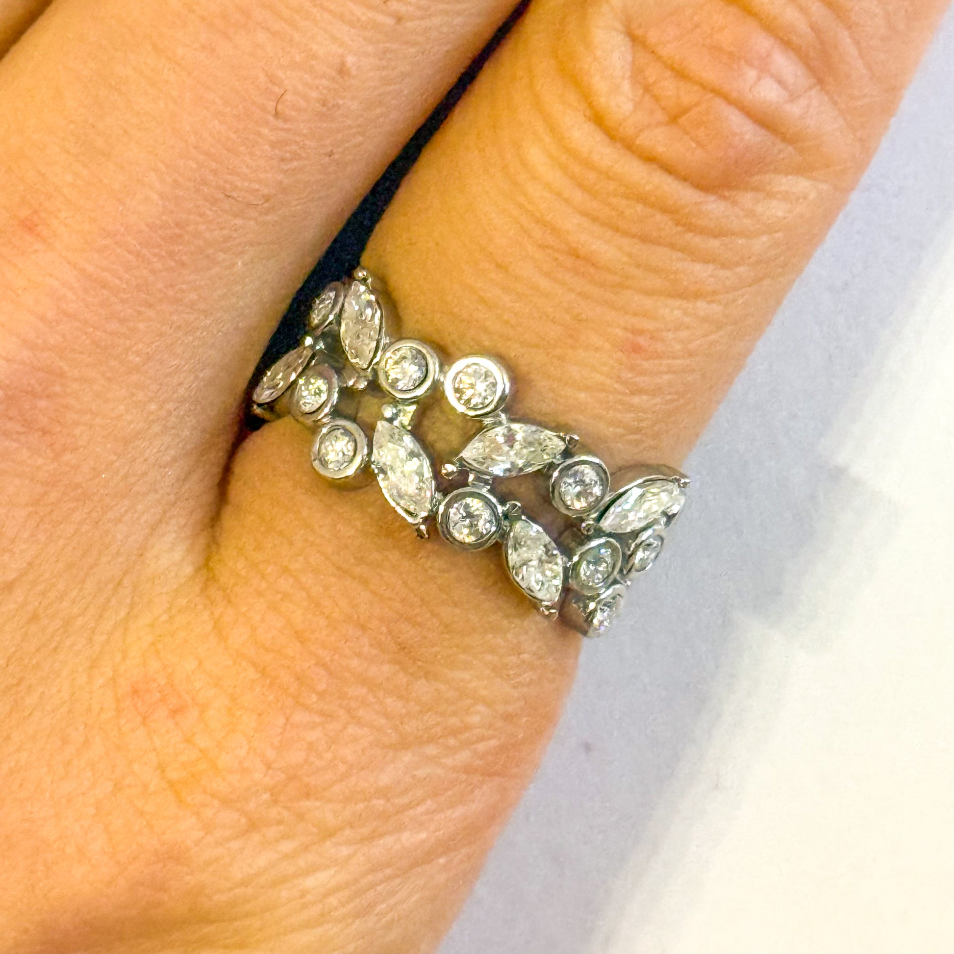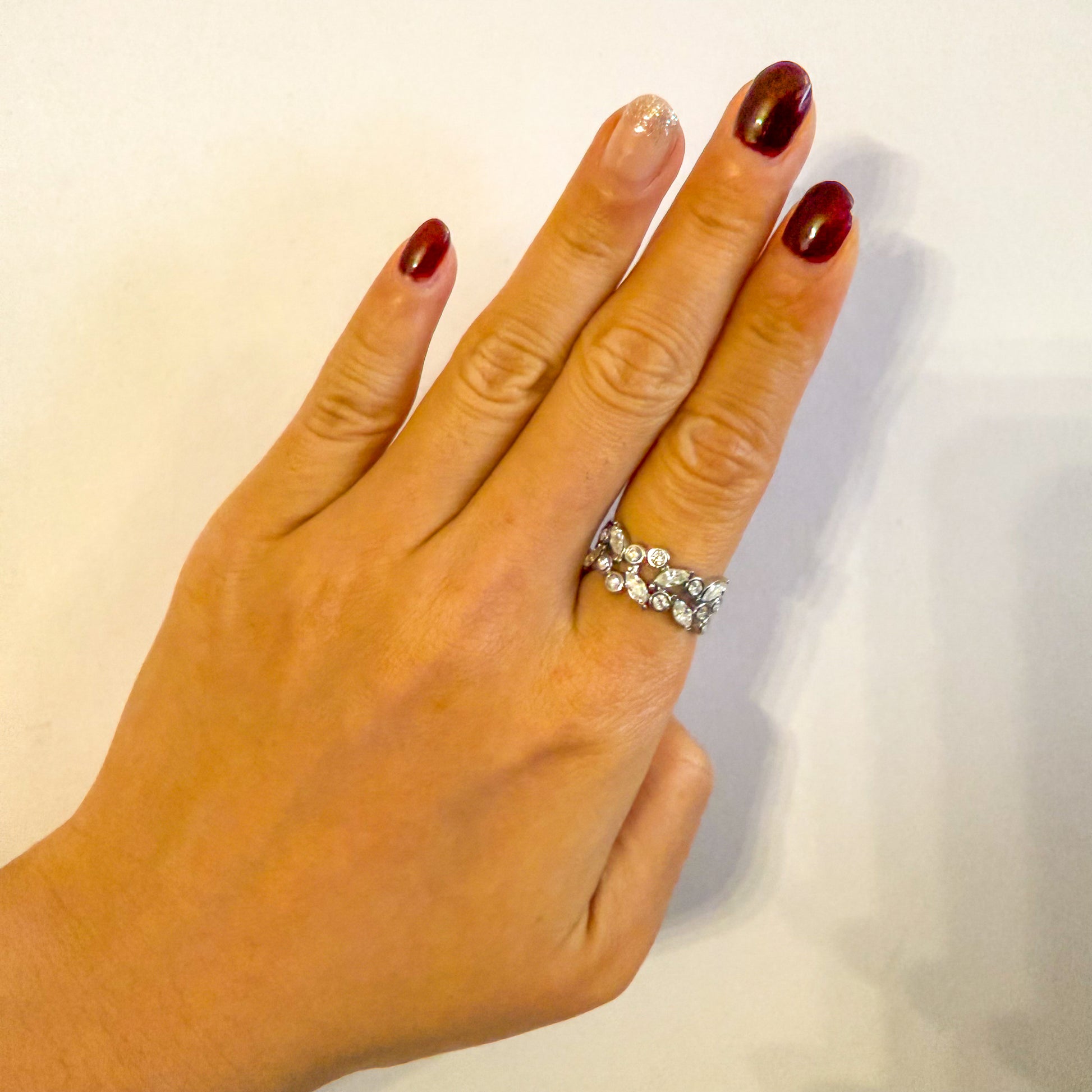 El anillo Bruma de Hielo destaca por su estructura abierta y su composición de circonitas en diferentes cortes, creando un efecto cristalino que recuerda al brillo del amanecer sobre el hielo.