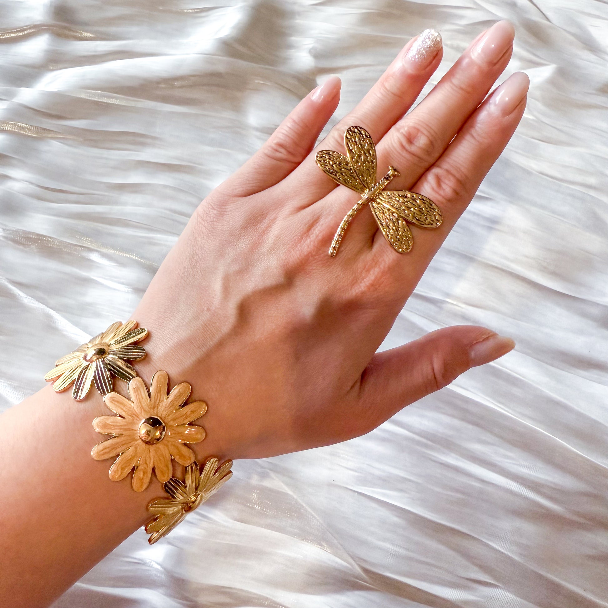 Inspirado en la ligereza y el movimiento. Este anillo en forma de libélula transmite libertad y delicadeza, con un acabado dorado que aporta un brillo cálido y elegante.