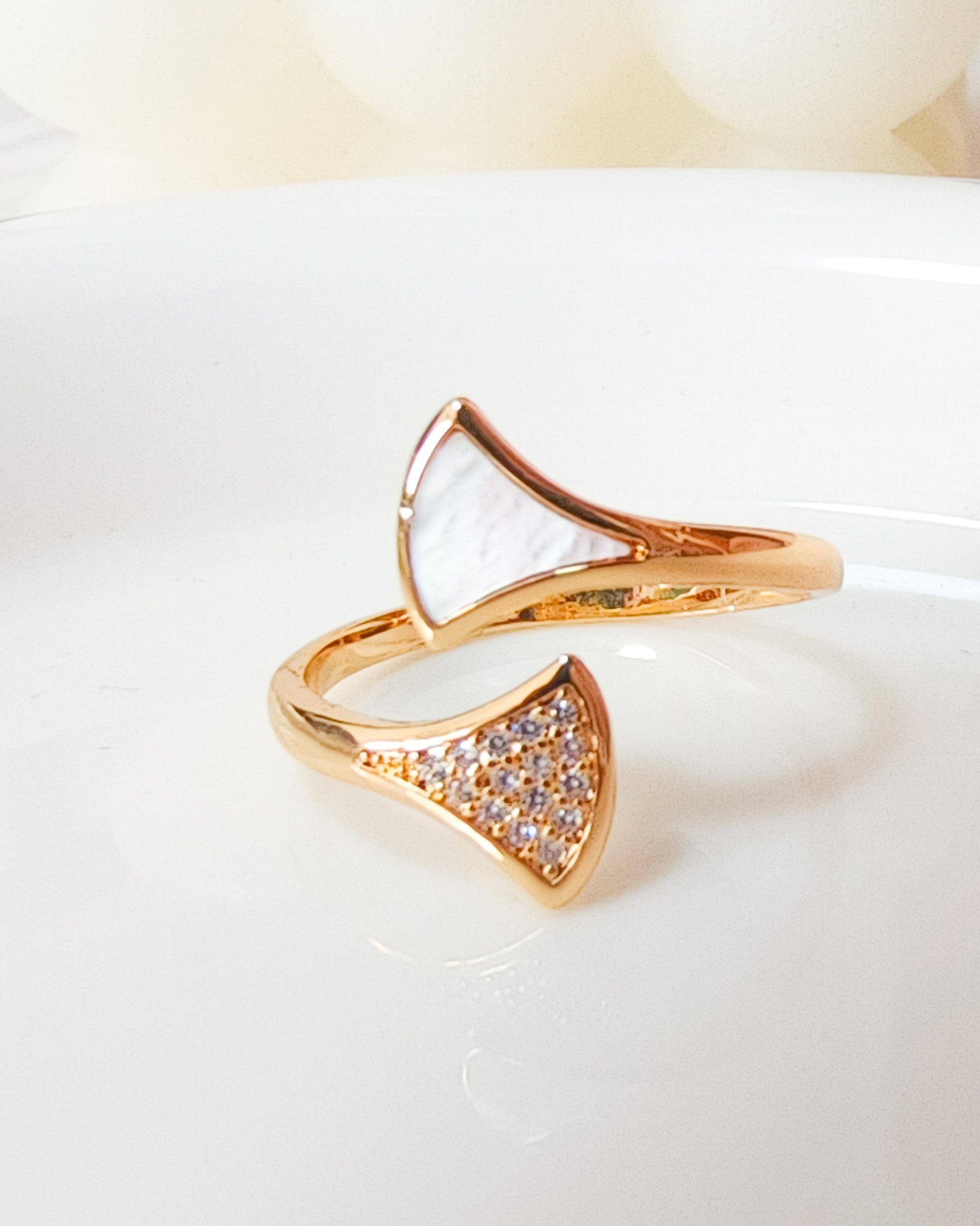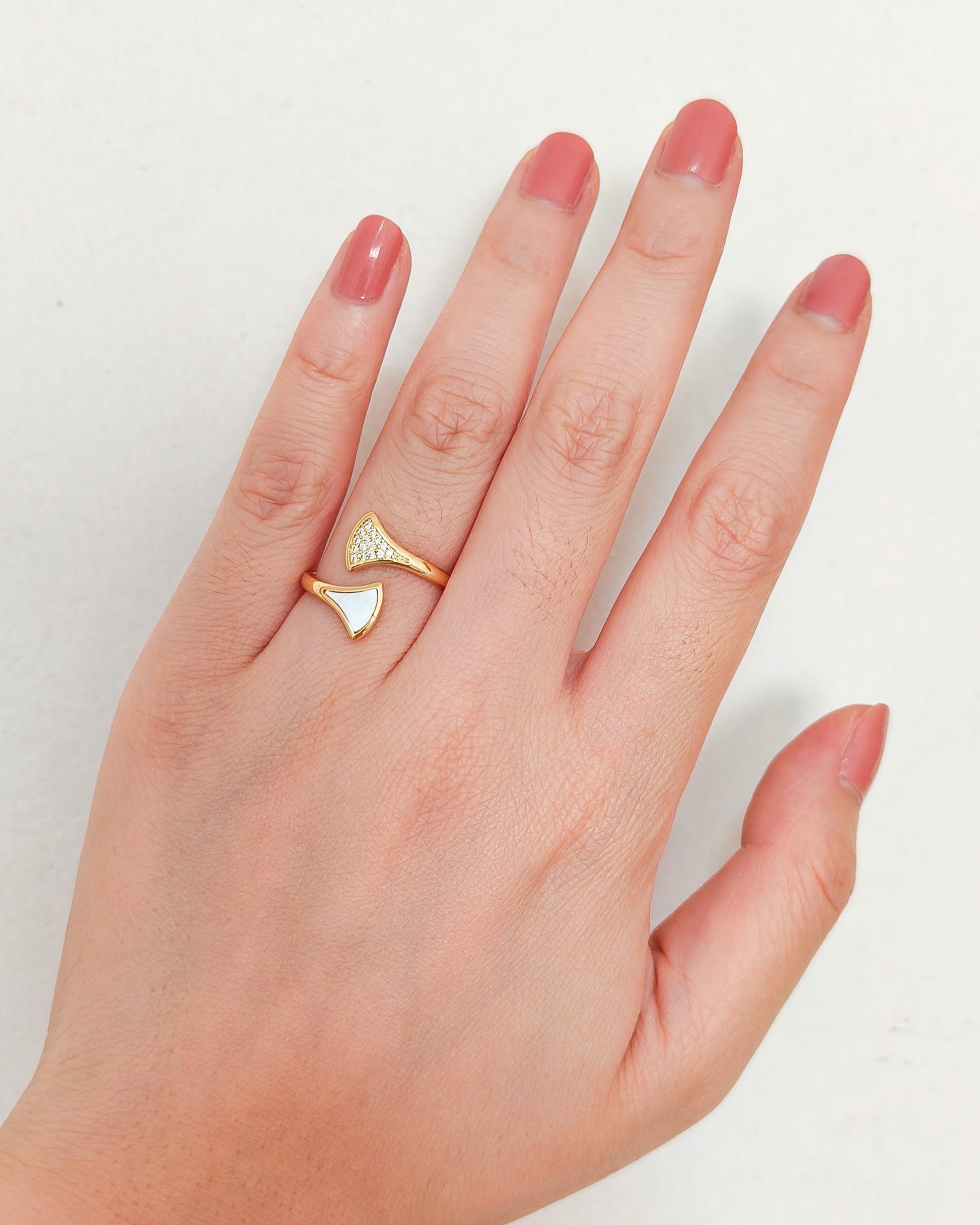 Anillo ajustable de dos triángulos de madreperla y circonitas se entrelazan en un diseño elegante y moderno. Una joya ligera que aporta frescura y sofisticación.