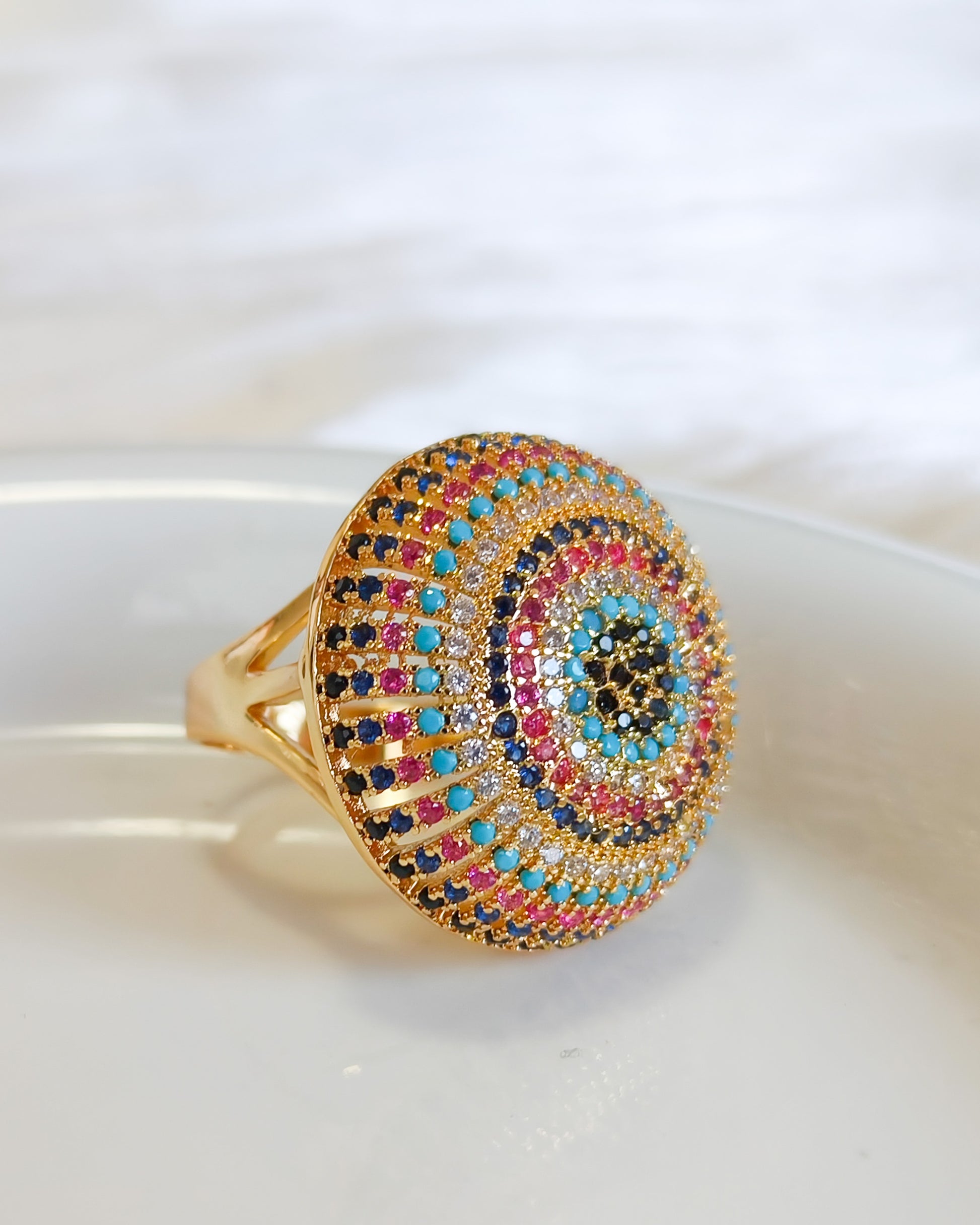 Descripción: Anillo dorado con medallón pavé multicolor de gama alta; brillante y precioso. Diseño tipo vintage que destaca desde lejos.