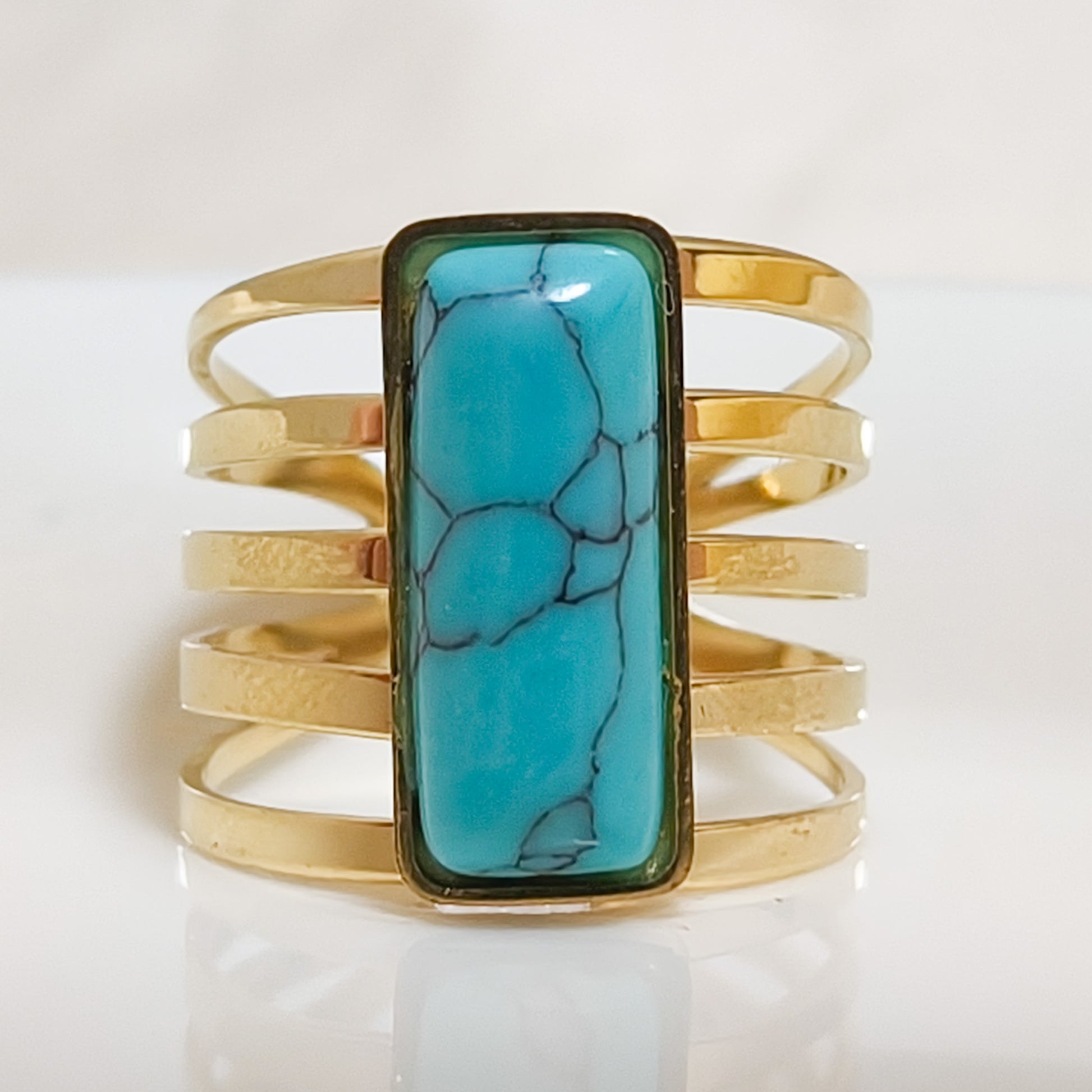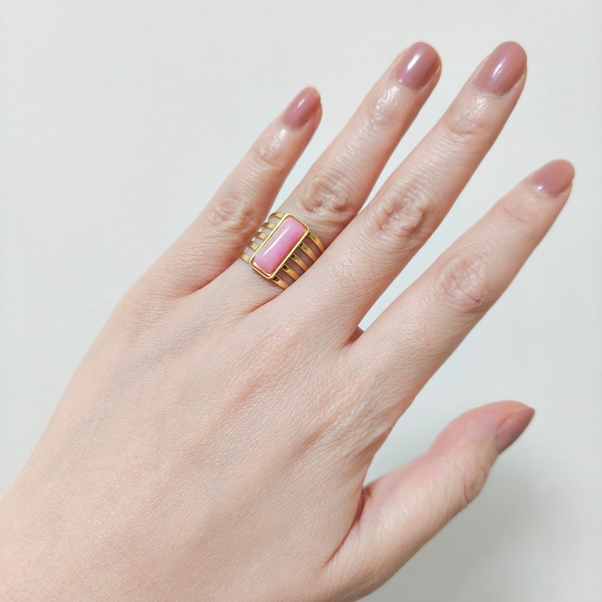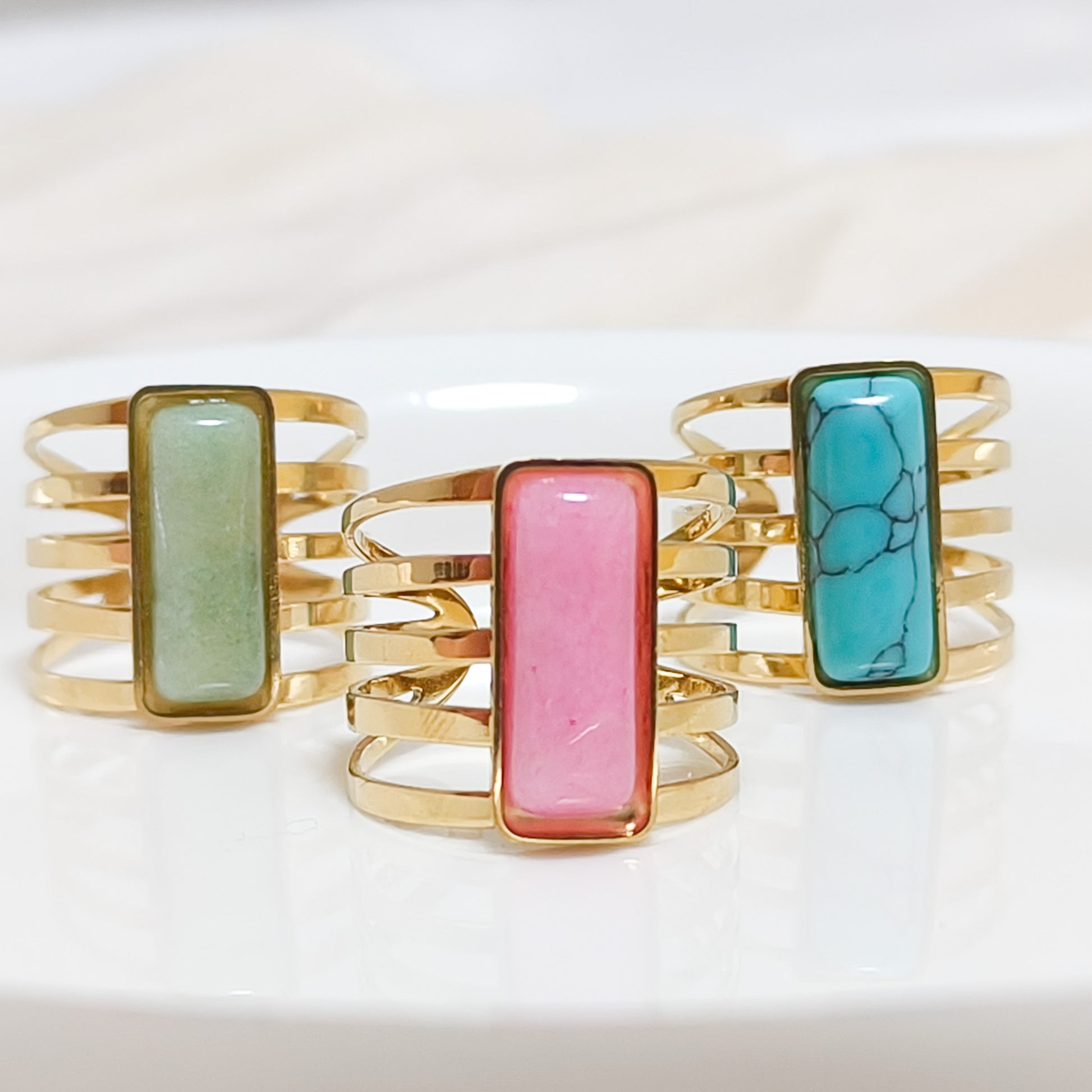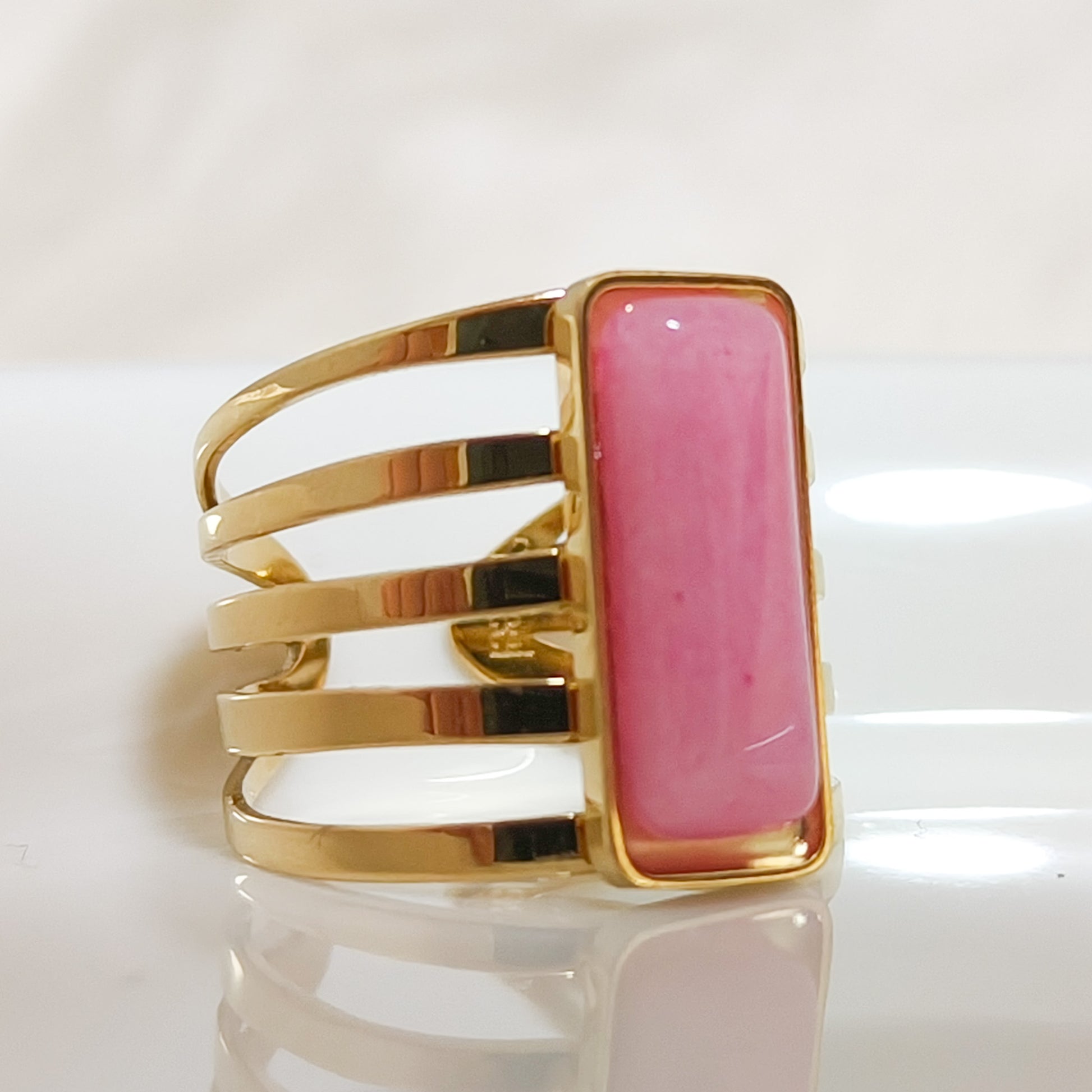 Anillo de varias bandas doradas con un rectángulo de color suave en el centro, disponible en diferentes tonos. El diseño alargado estiliza los dedos y se ve muy elegante. Es un anillo moderno, llamativo y lleno de vida, perfecto para quienes aman los accesorios con carácter.