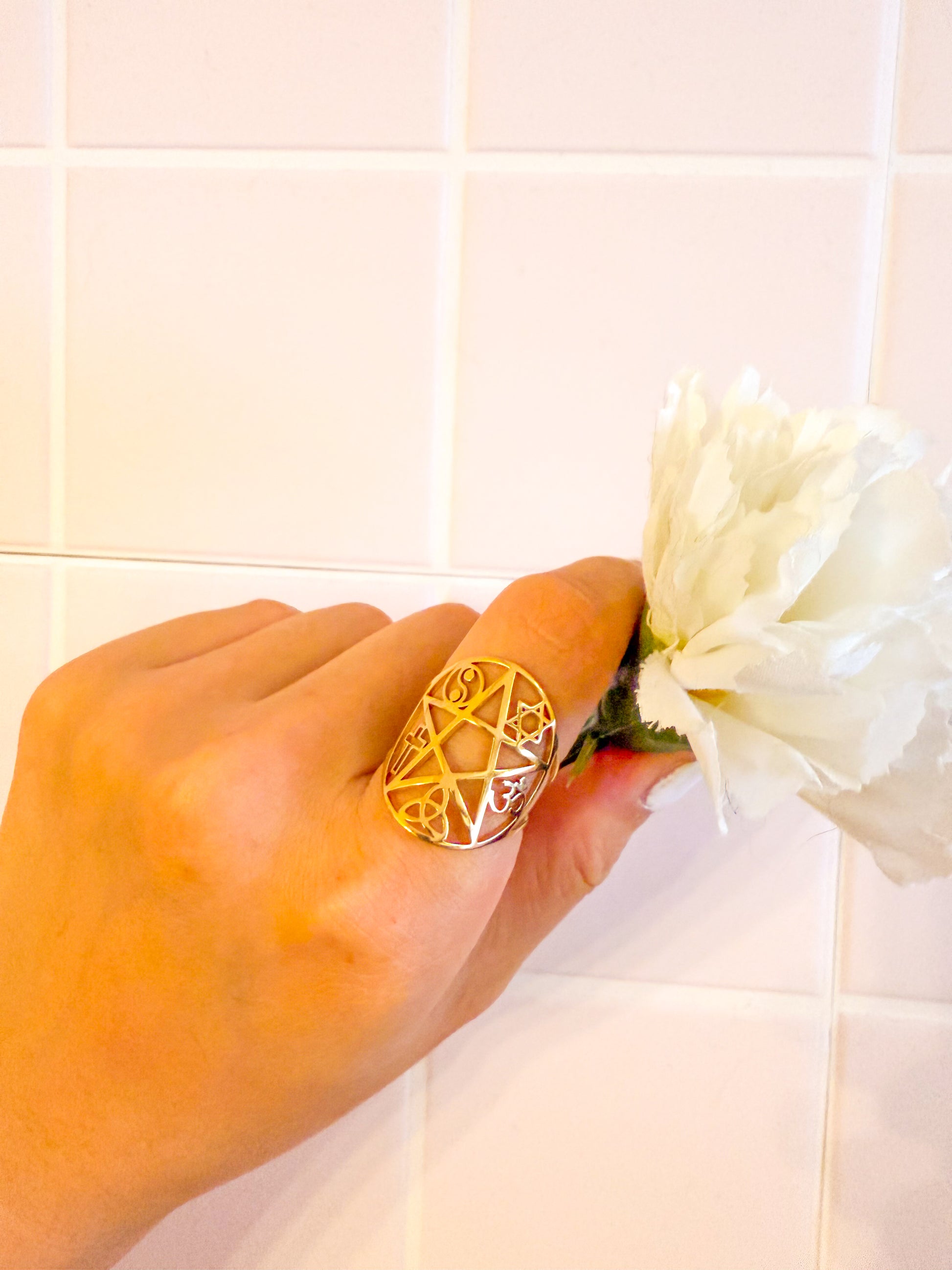 Anillo ajustable de acero inoxidable, hipoalergénico y cómodo para el uso diario. Su diseño geométrico con detalles calados aporta modernidad y un estilo único. Fácil de combinar y perfecto como regalo especial.