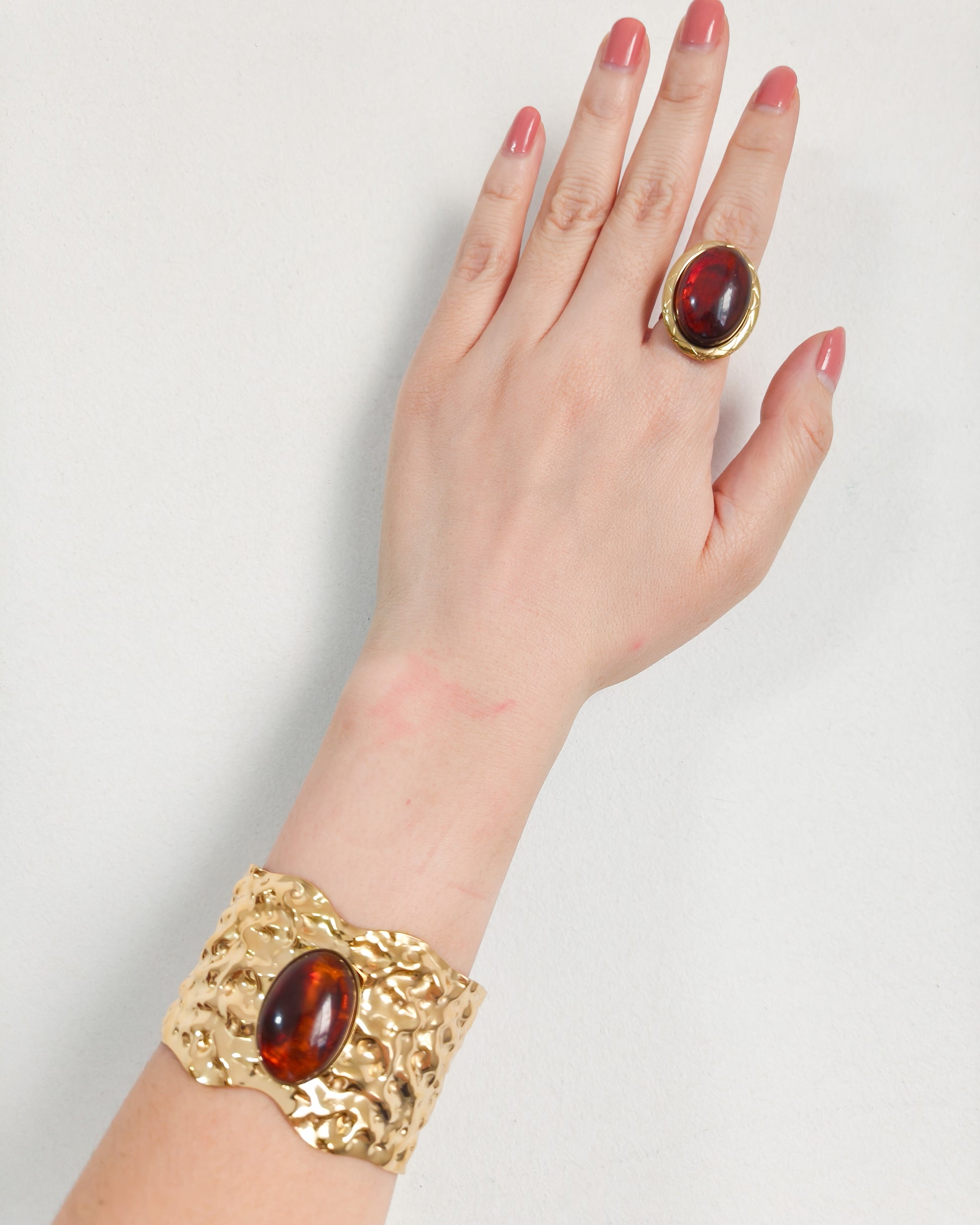 - Diseño escultural con textura martillada y cabujón color marrón que ilumina la piel.