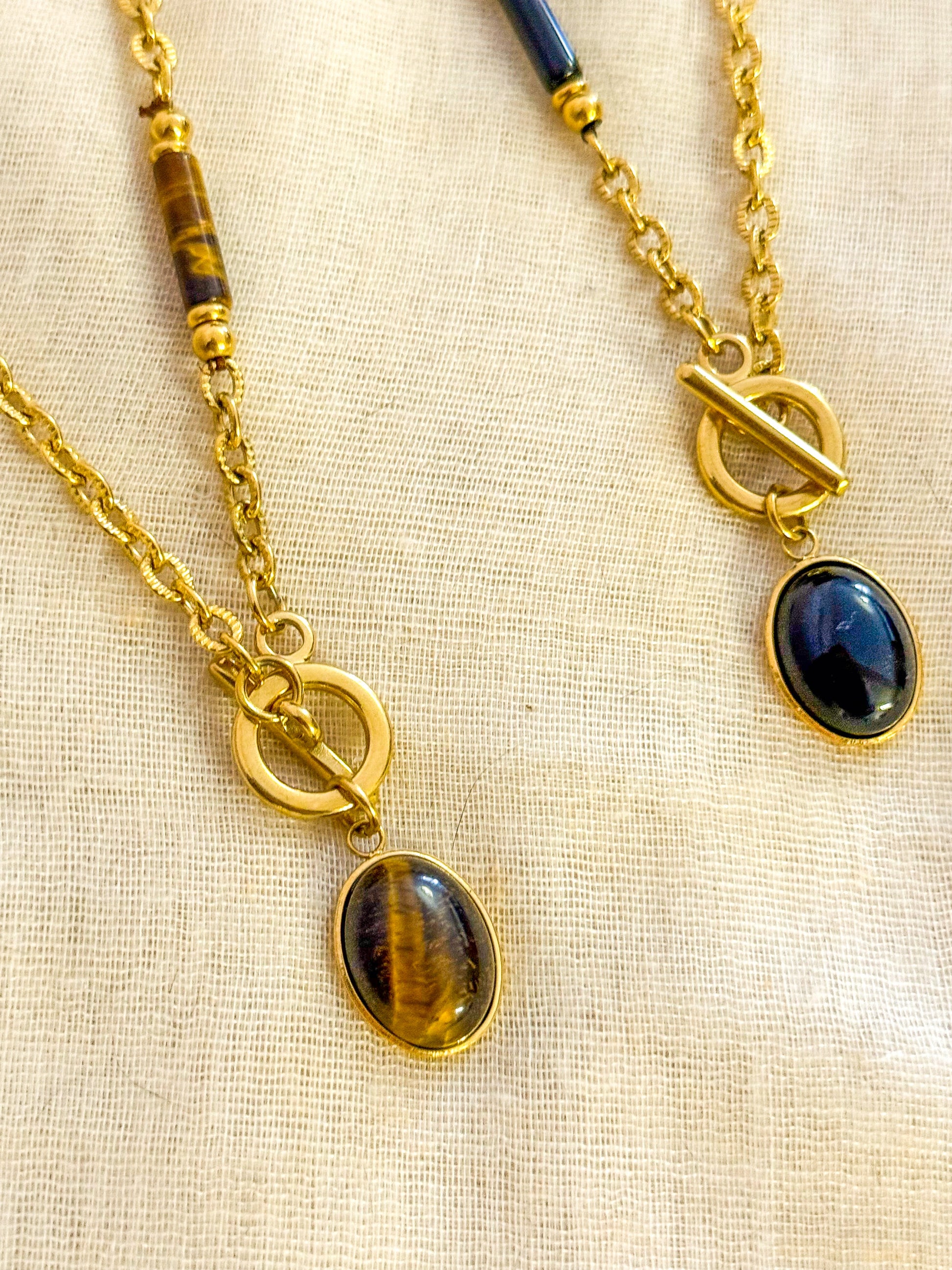 Collar de acero inoxidable, hipoalergénico y cómodo para uso diario. Su diseño con cadena dorada y colgante ovalado en tonos profundos transmite elegancia y fuerza. Una pieza versátil que realza cualquier look y un regalo ideal.