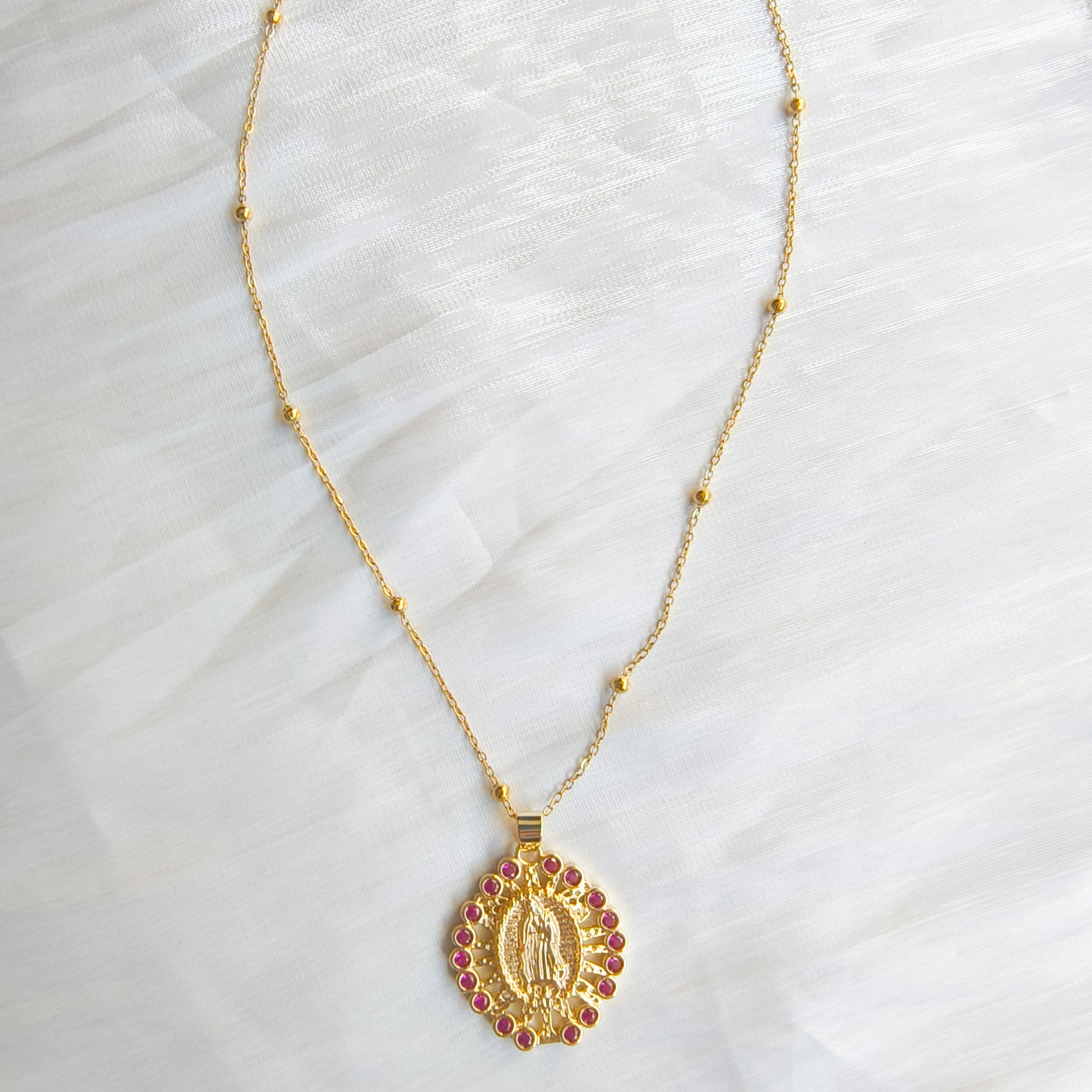 Collar elegante con medalla tipo Guadalupe enmarcada por pequeñas circonitas rosas que iluminan el rostro.