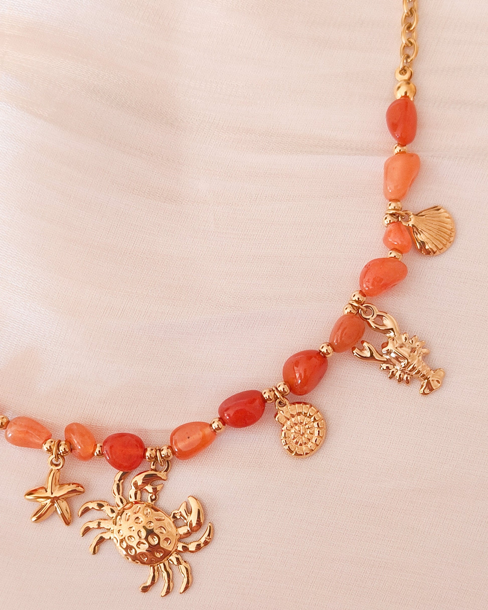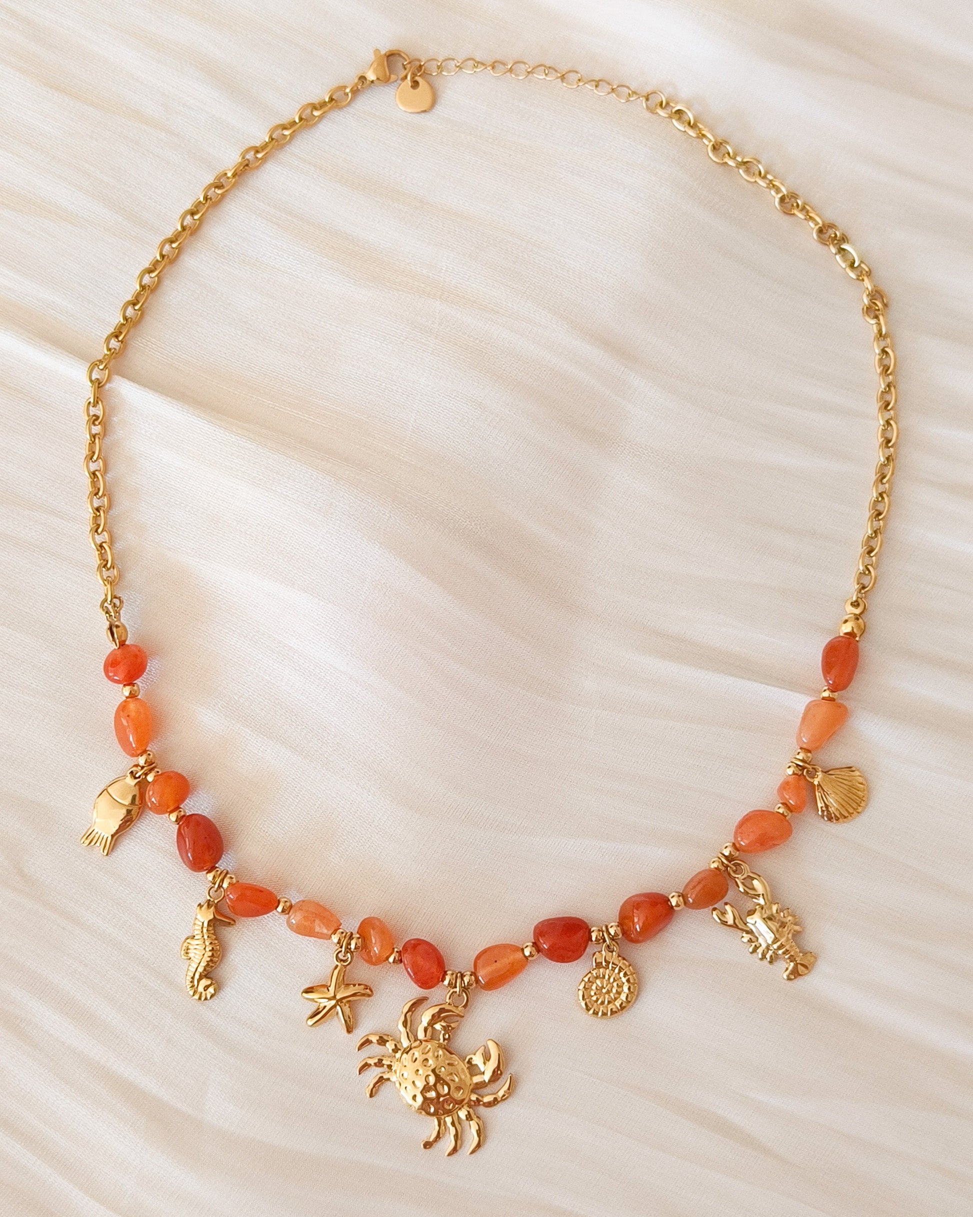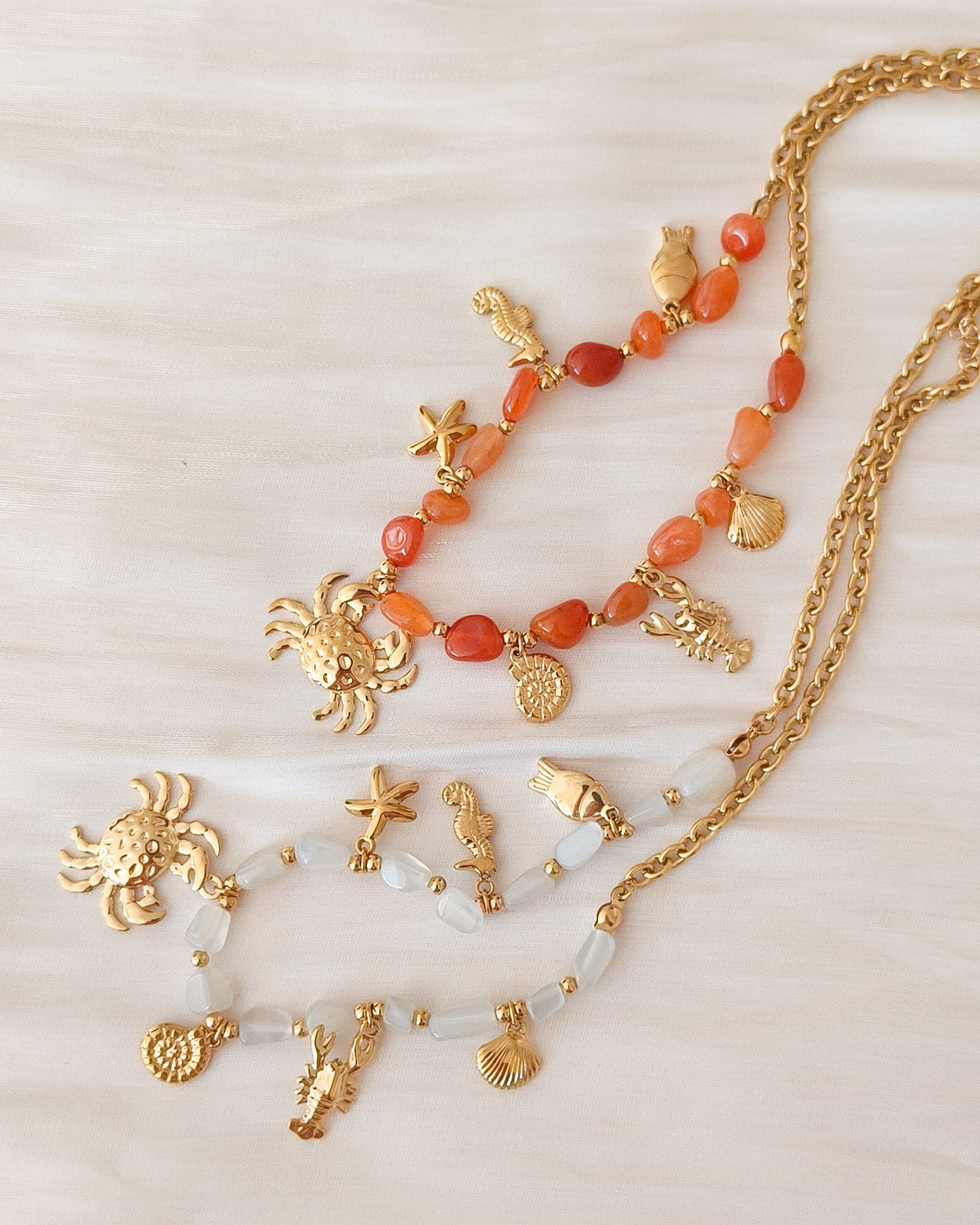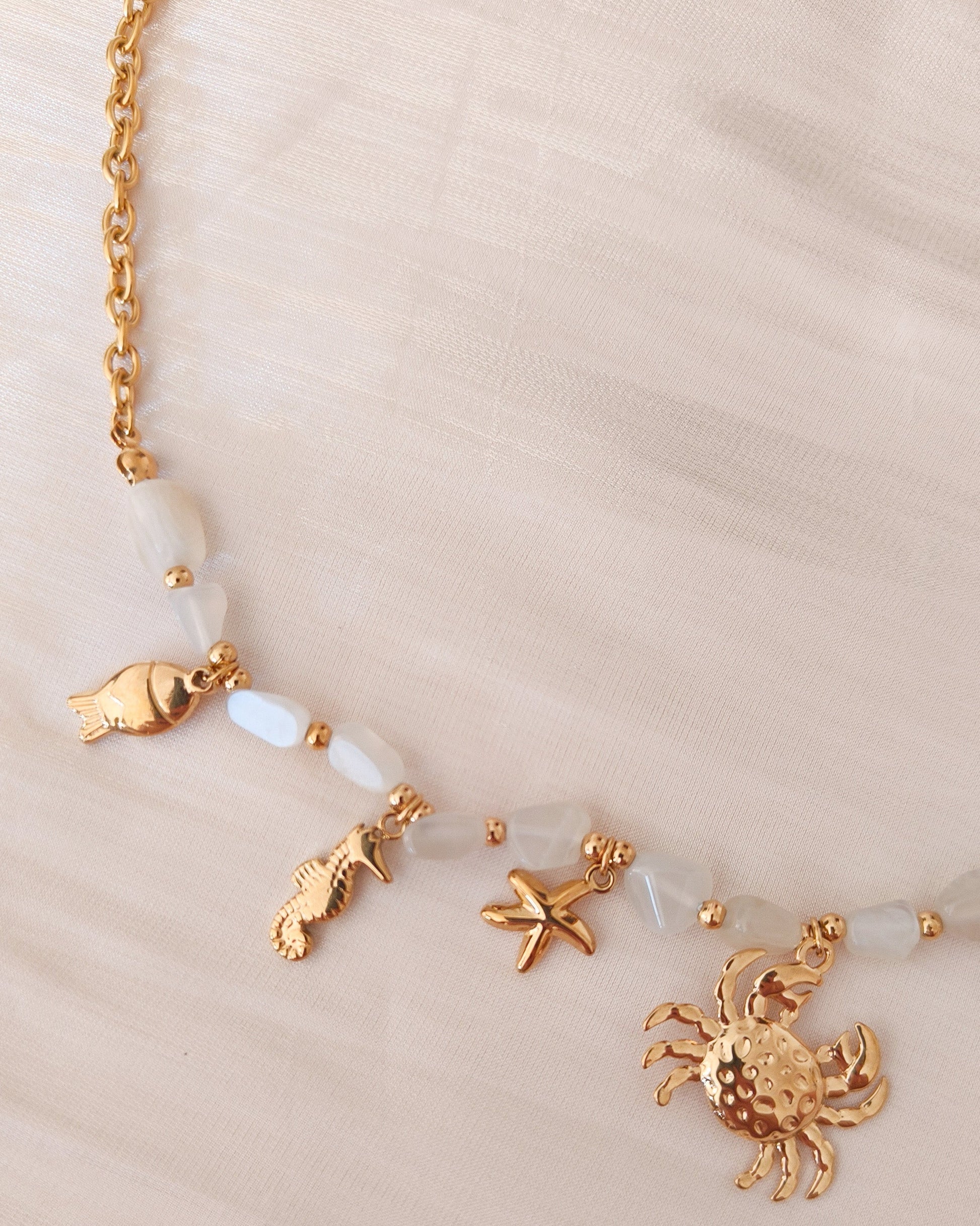 Colgantes dorados con motivos marinos de alta calidad de acero inoxidable (cangrejo, estrella de mar, caballito de mar y concha) que aportan un estilo veraniego y elegante.