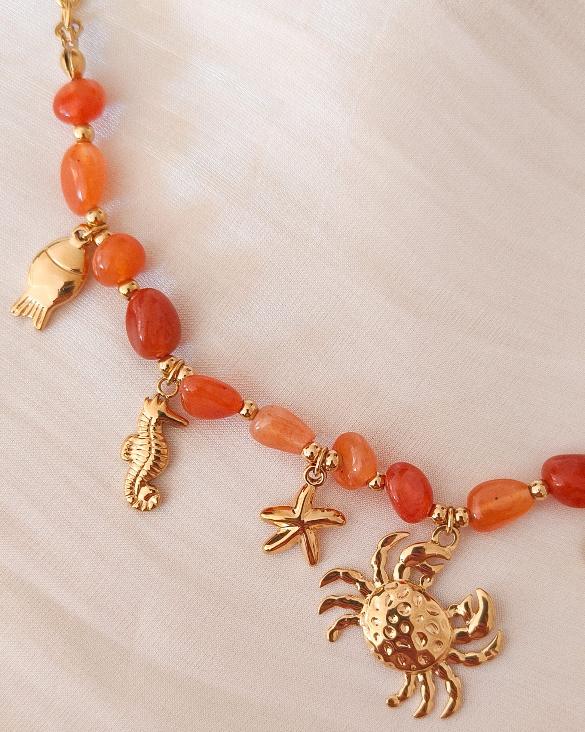 Collar artesanal con cuentas de piedra natural en tonos coral y blanco, evocando la magia de la orilla.