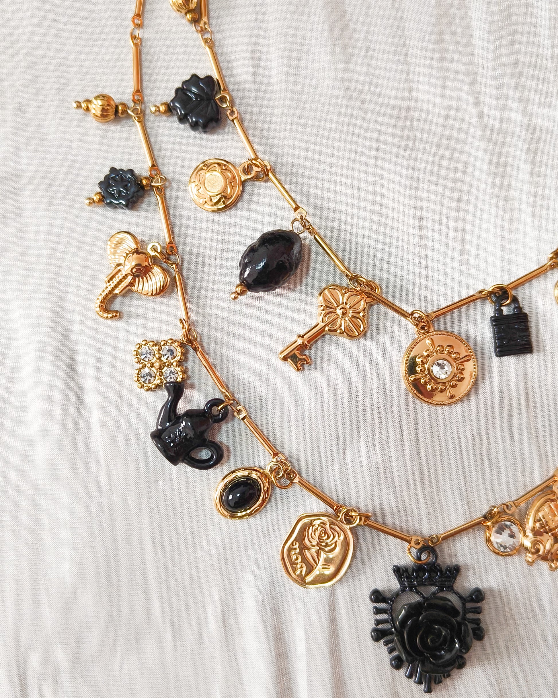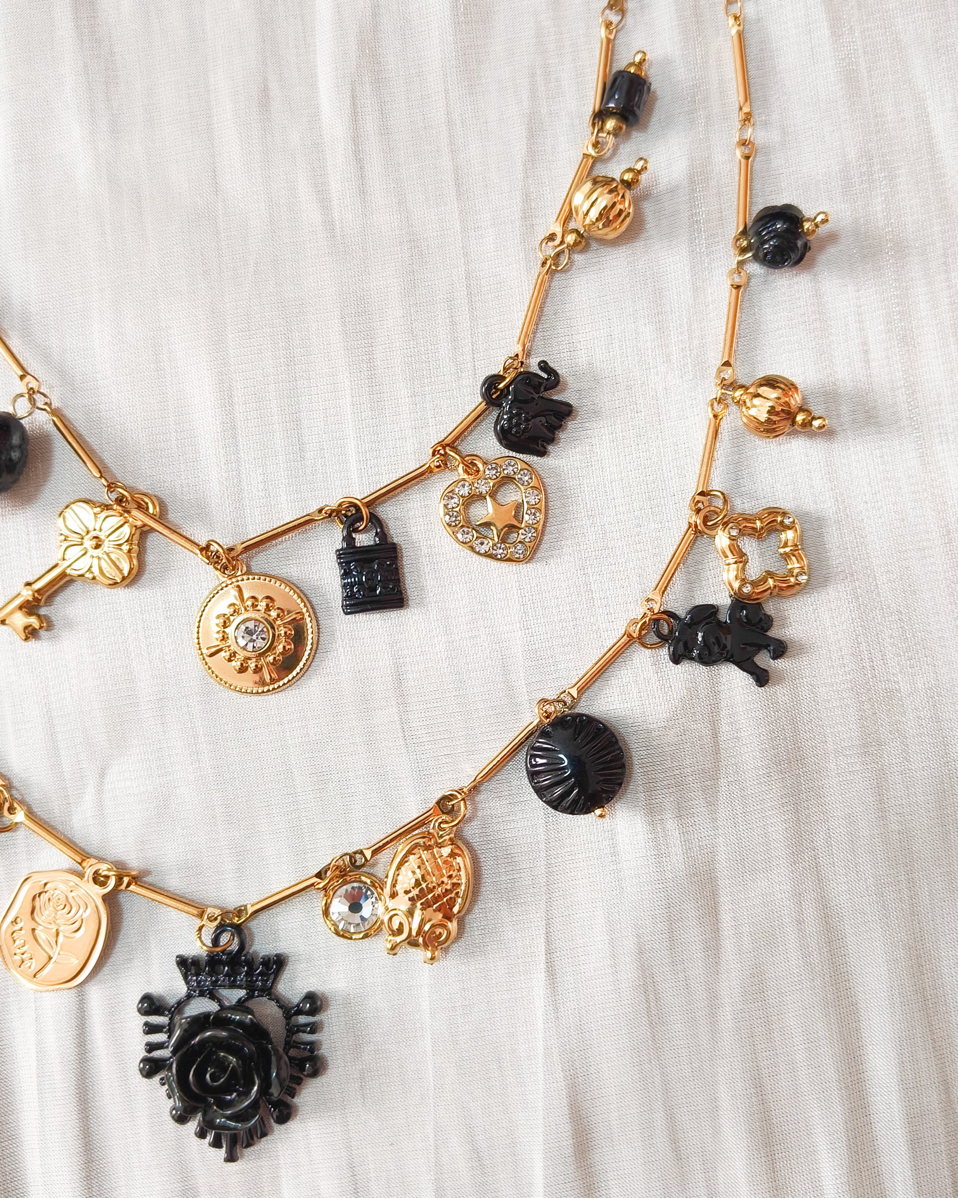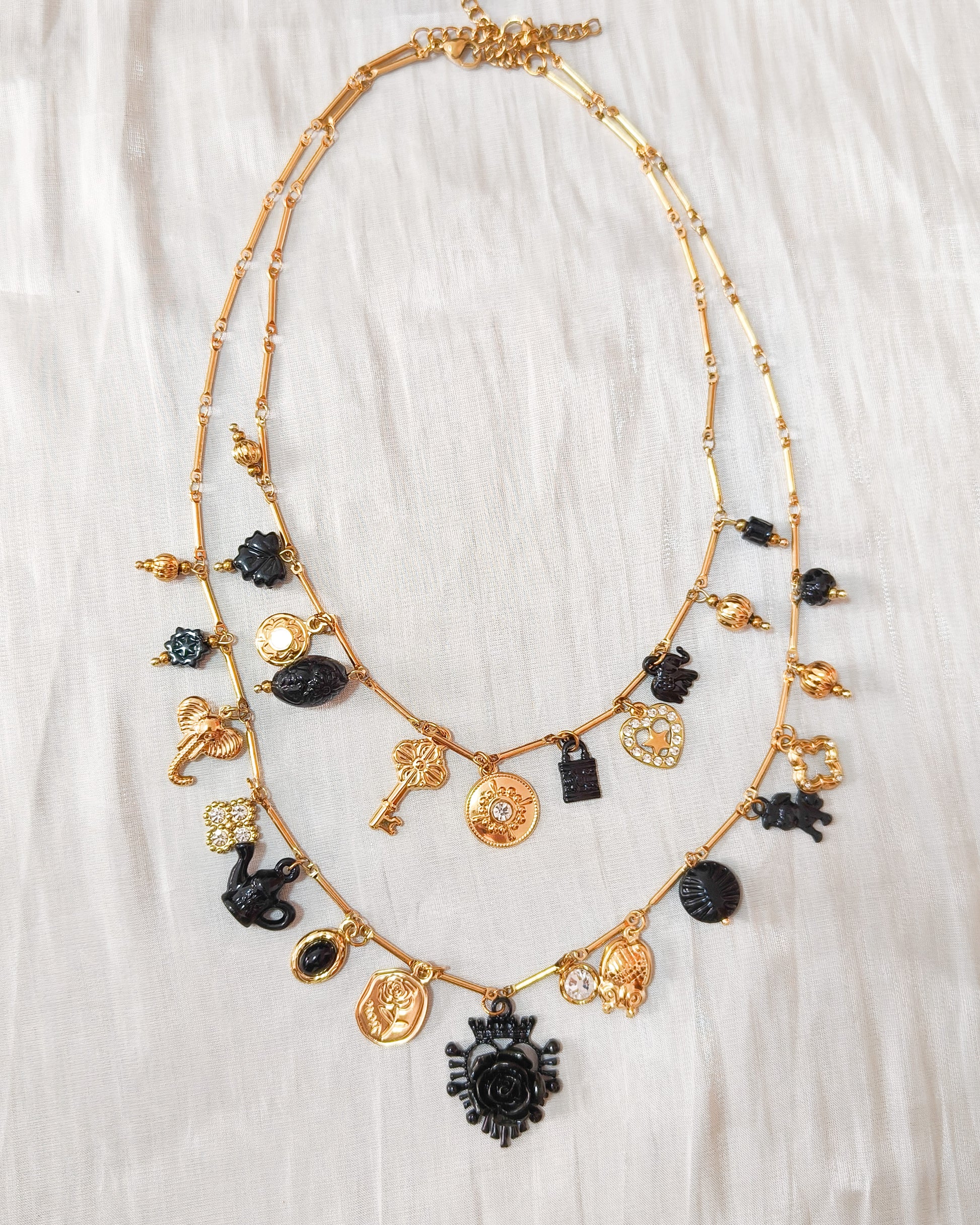• Pack de dos collares con charms en dorado y negro: llaves, flores y soles.