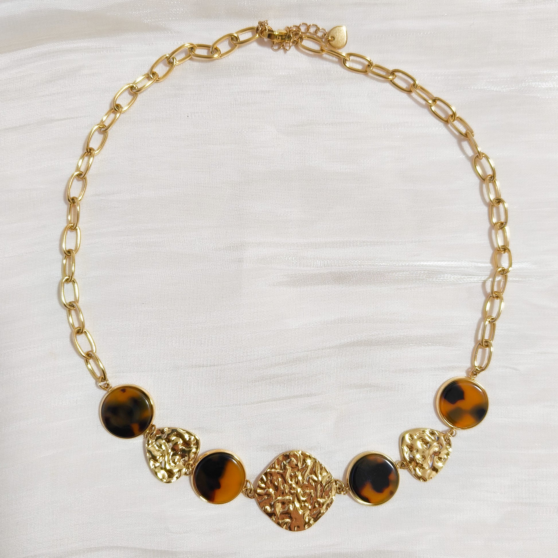 - Cadena dorada con piezas texturizadas y detalles en tonos carey para un toque cálido y moderno.