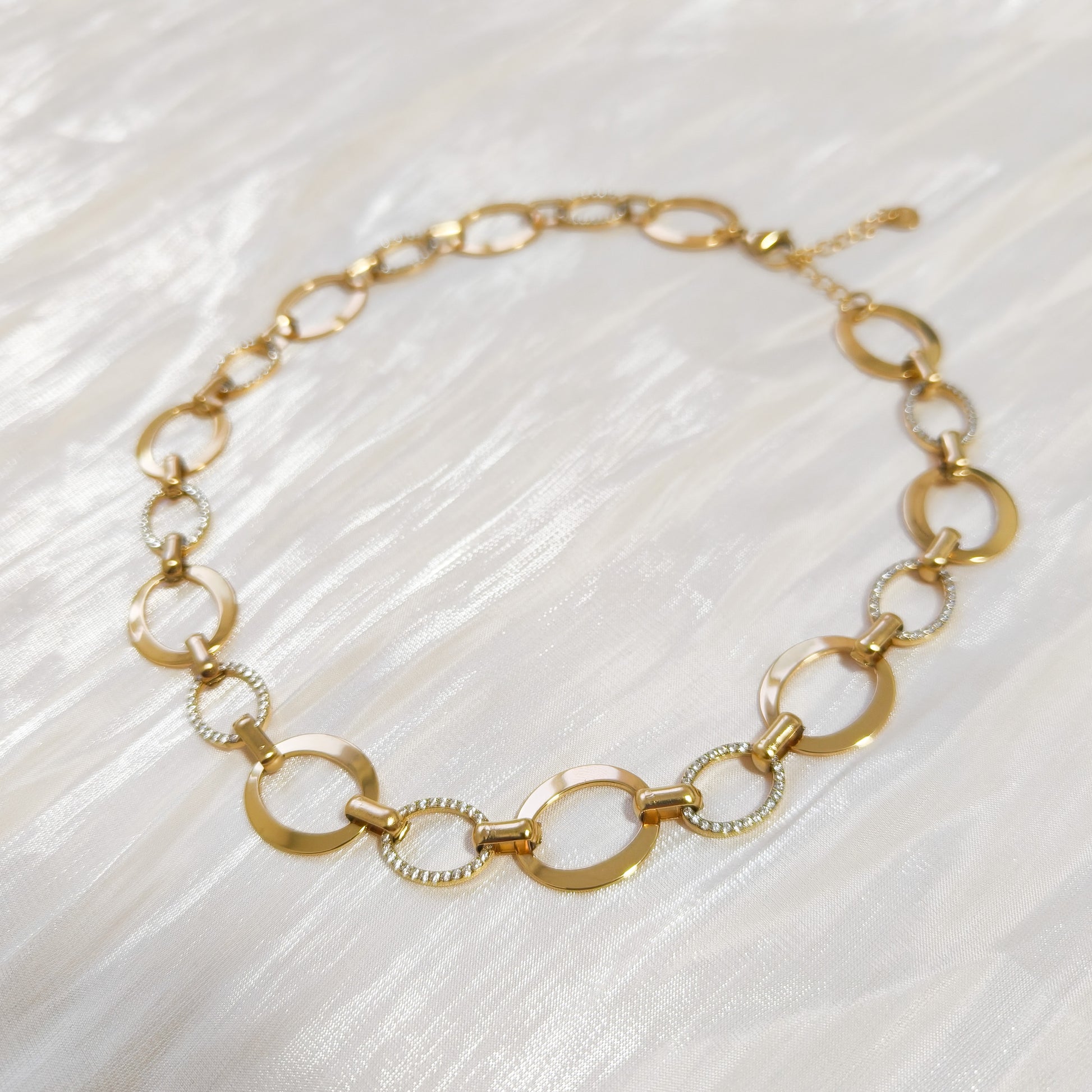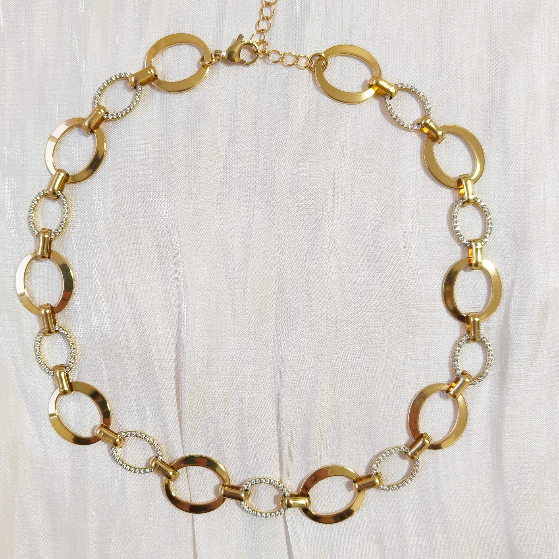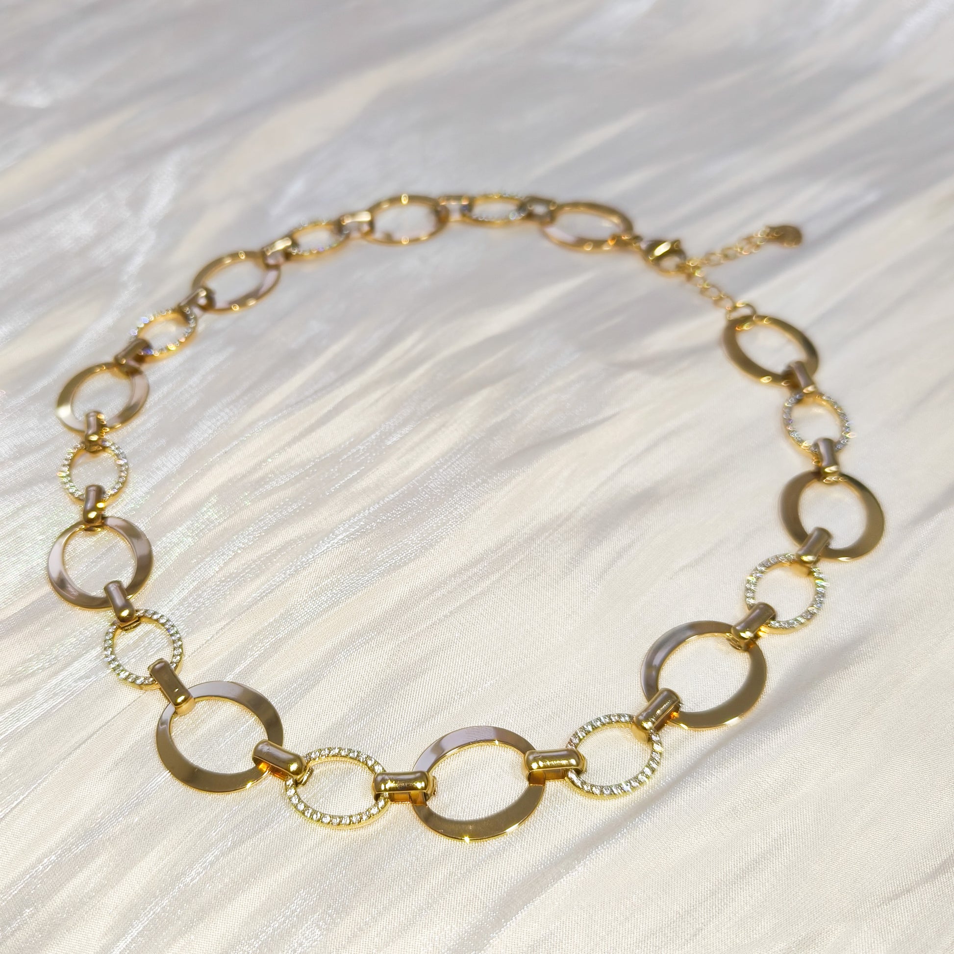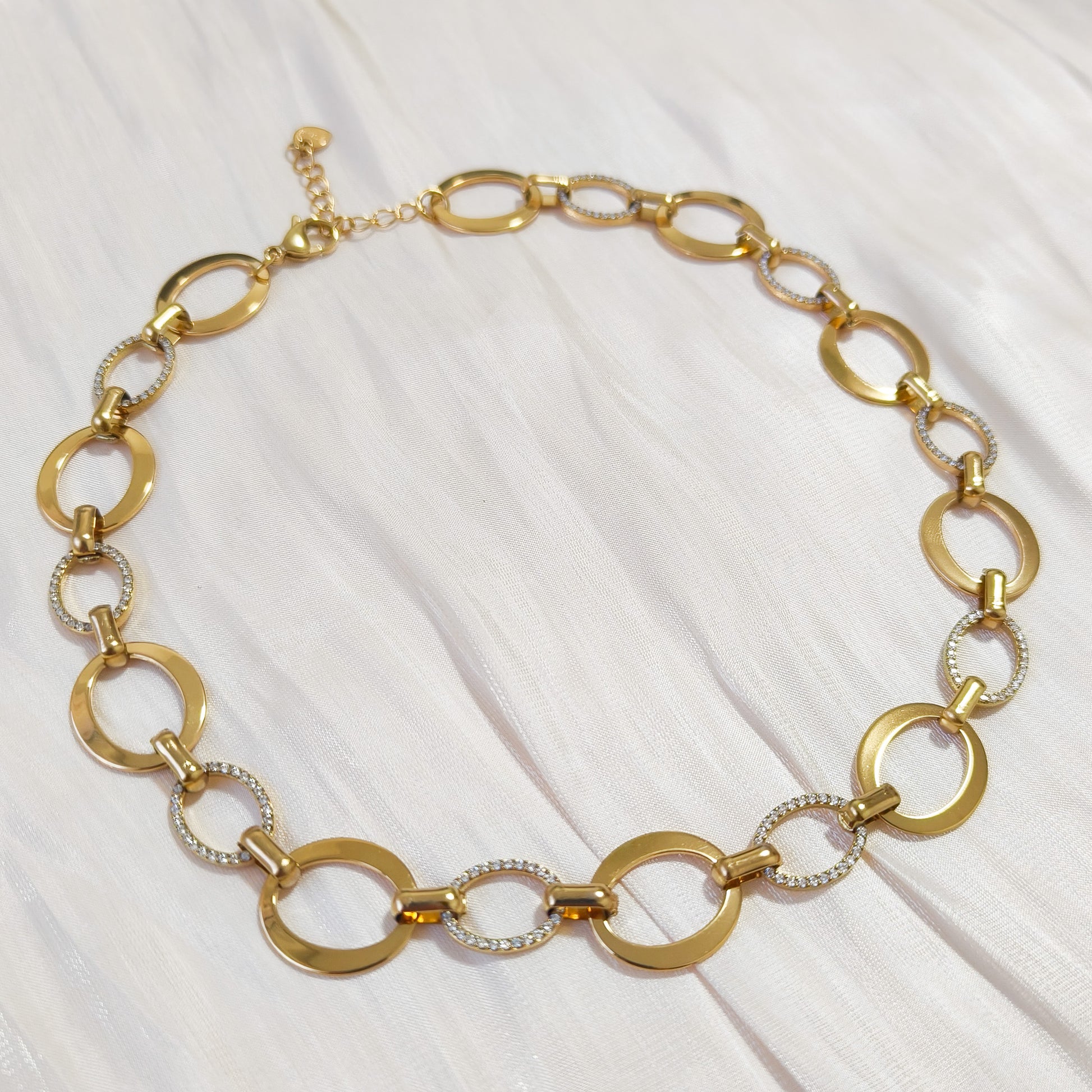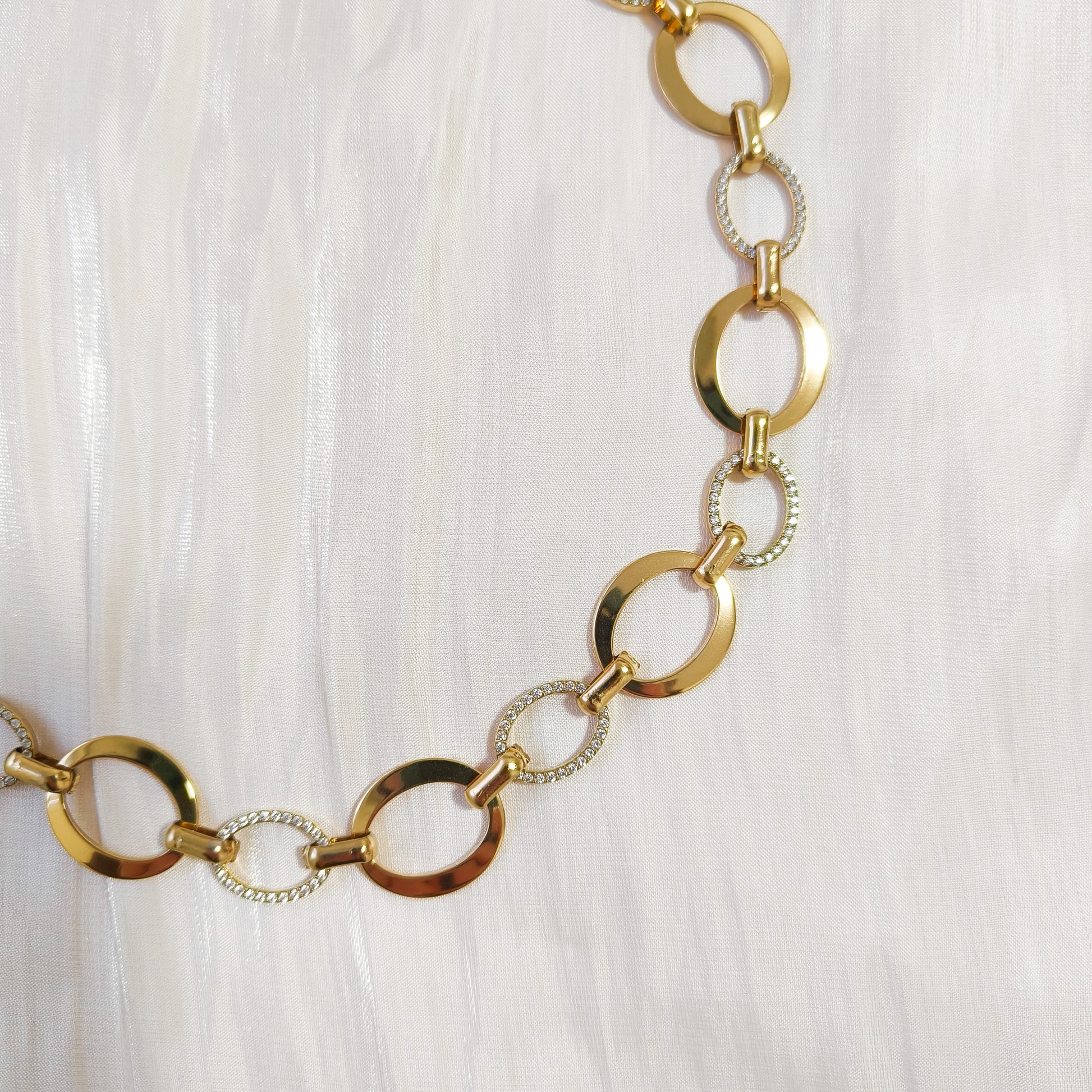 - Eslabones redondos alternados con aros pavé: luz y movimiento en cada paso.