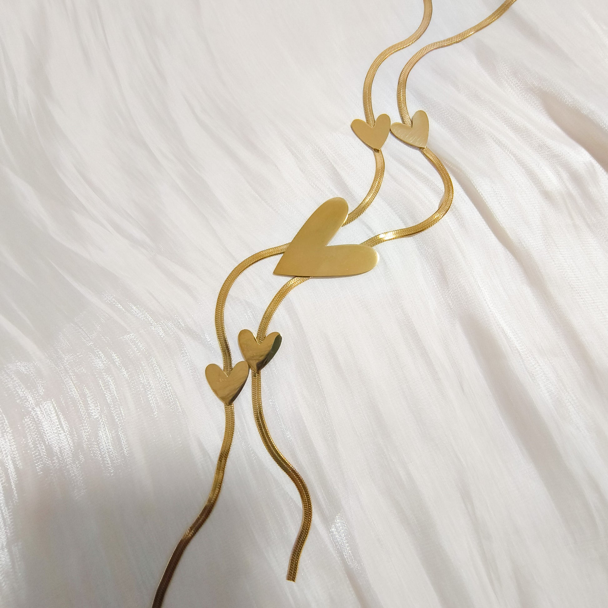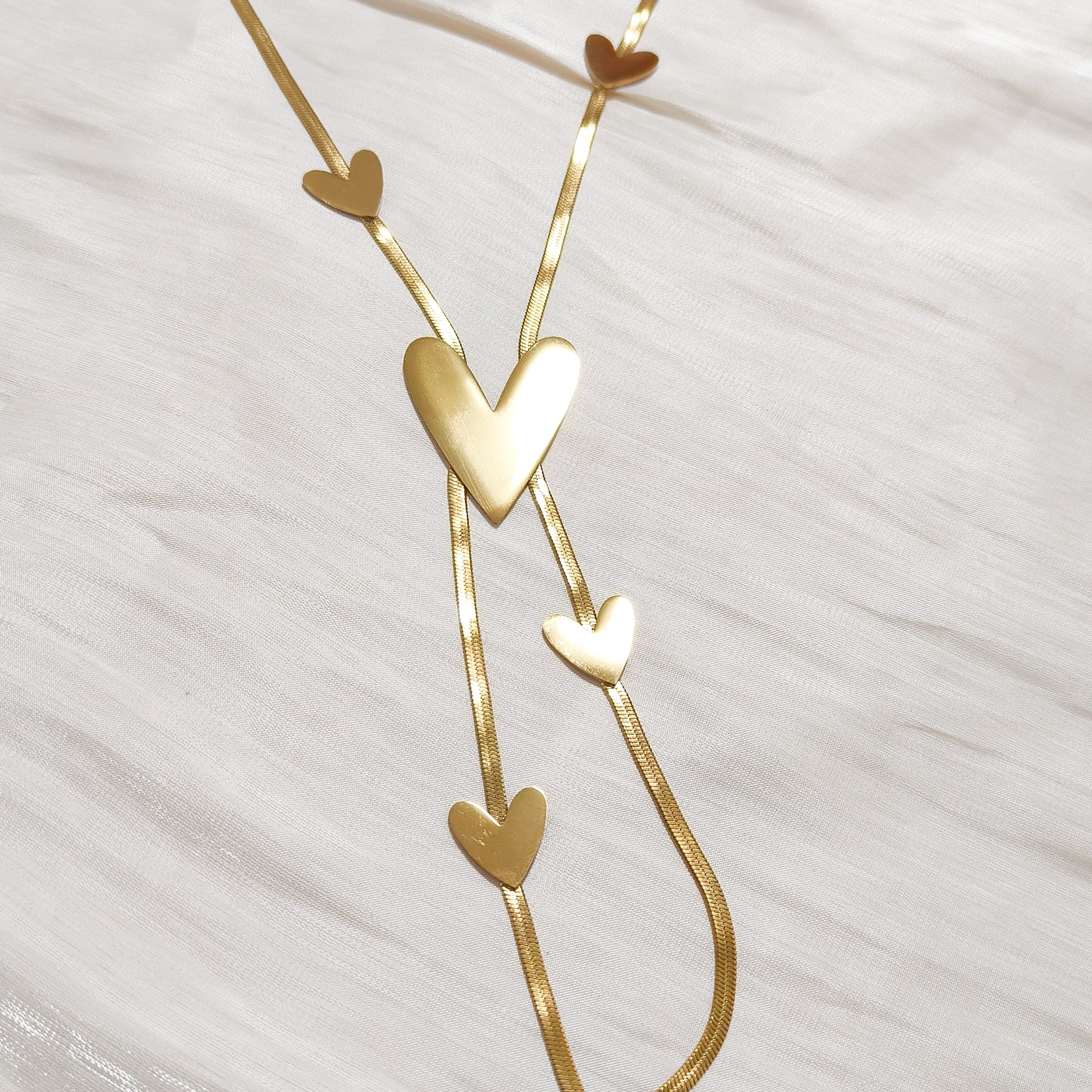 - Lariat minimalista con corazones pulidos que caen en V y estilizan.
