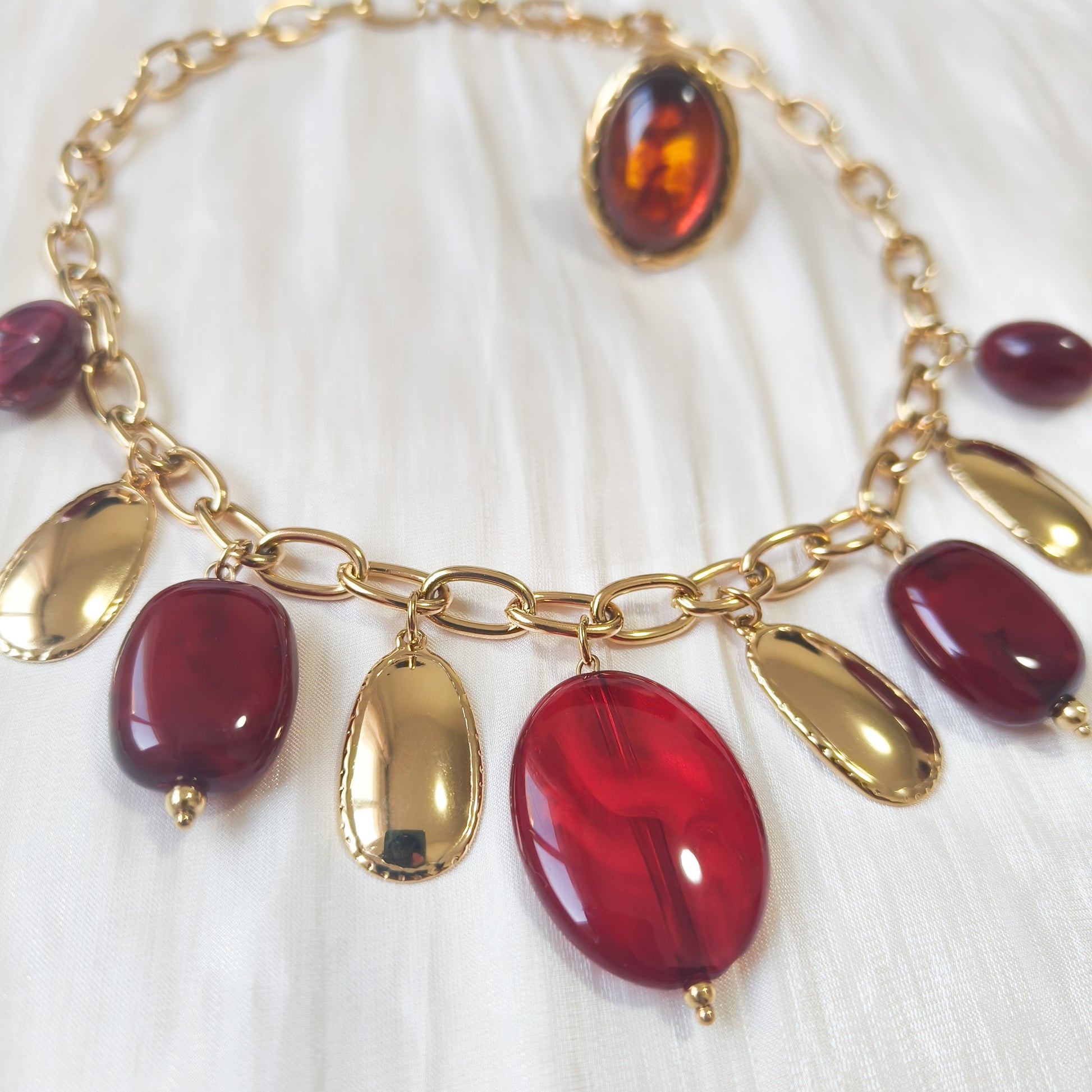 - Collar de eslabones dorados con colgantes en rojo profundo y dorado brillante.