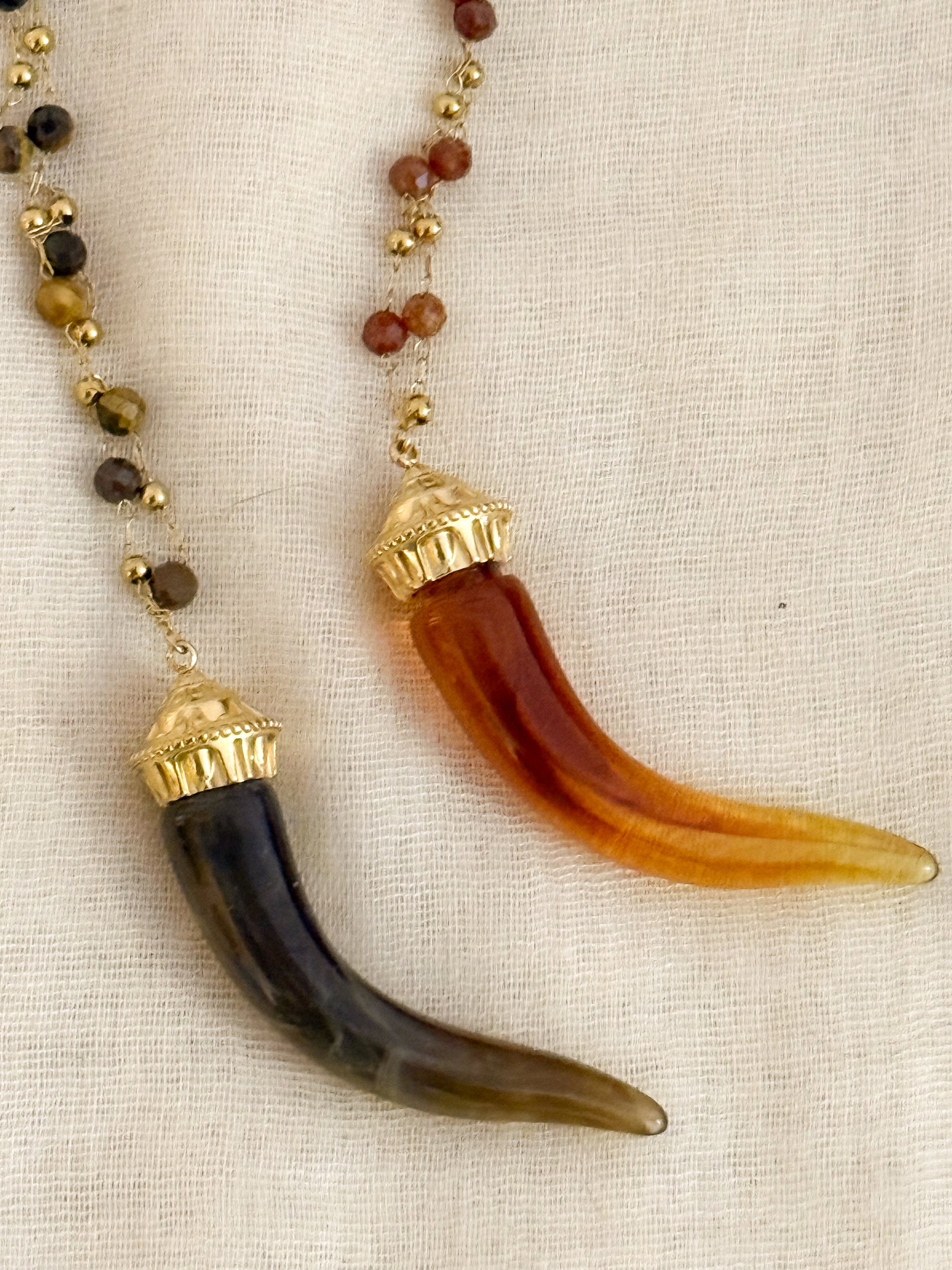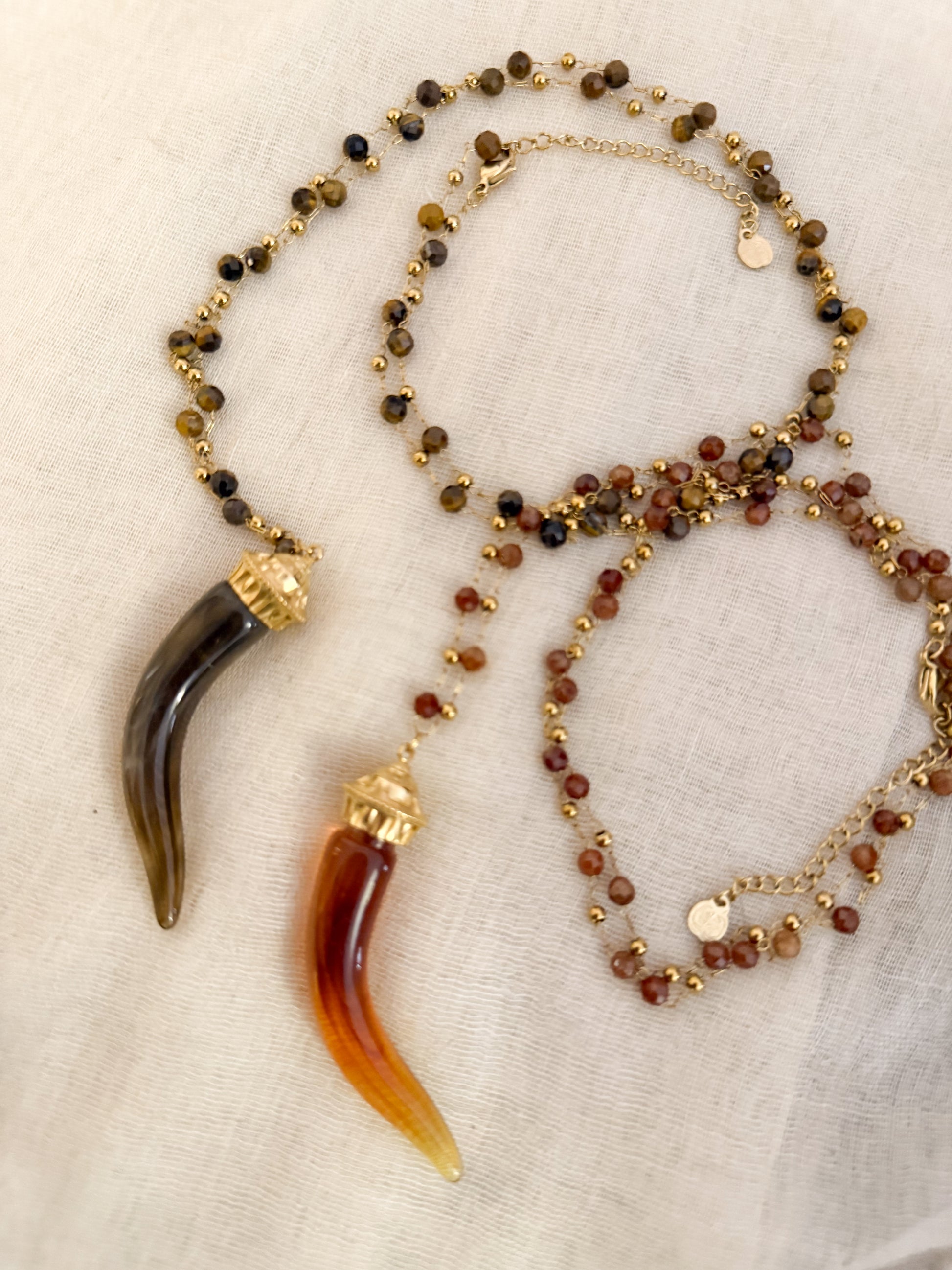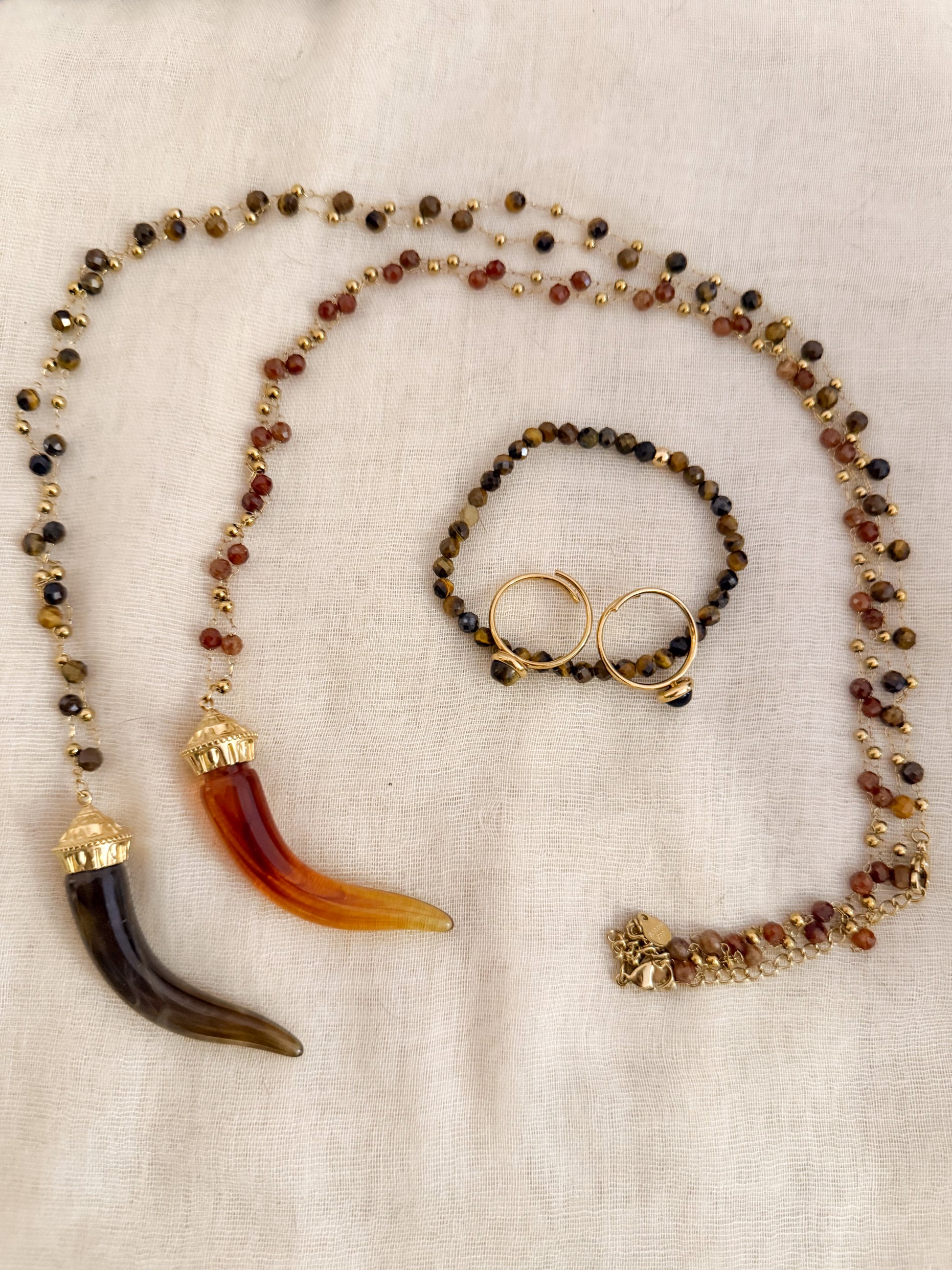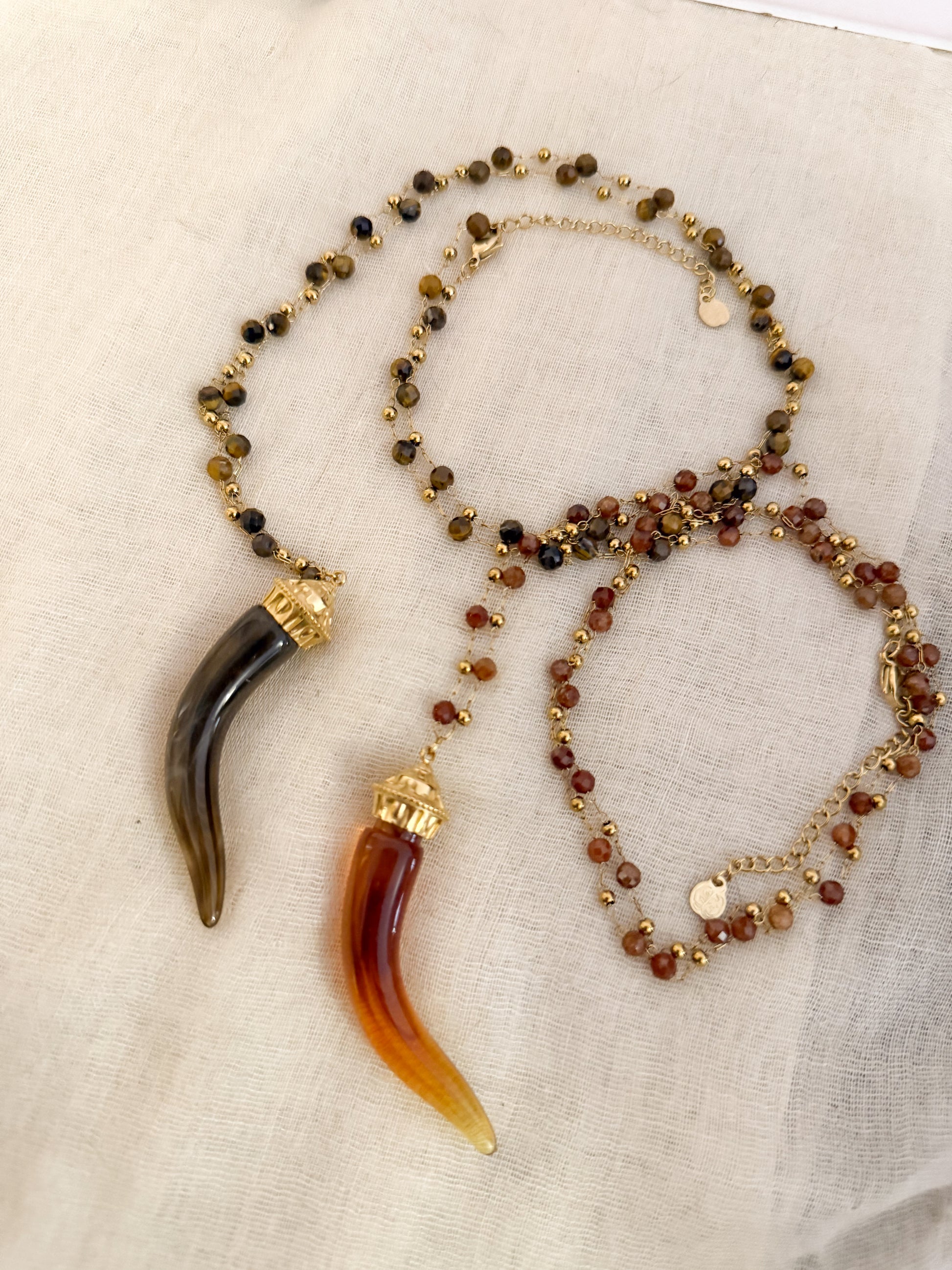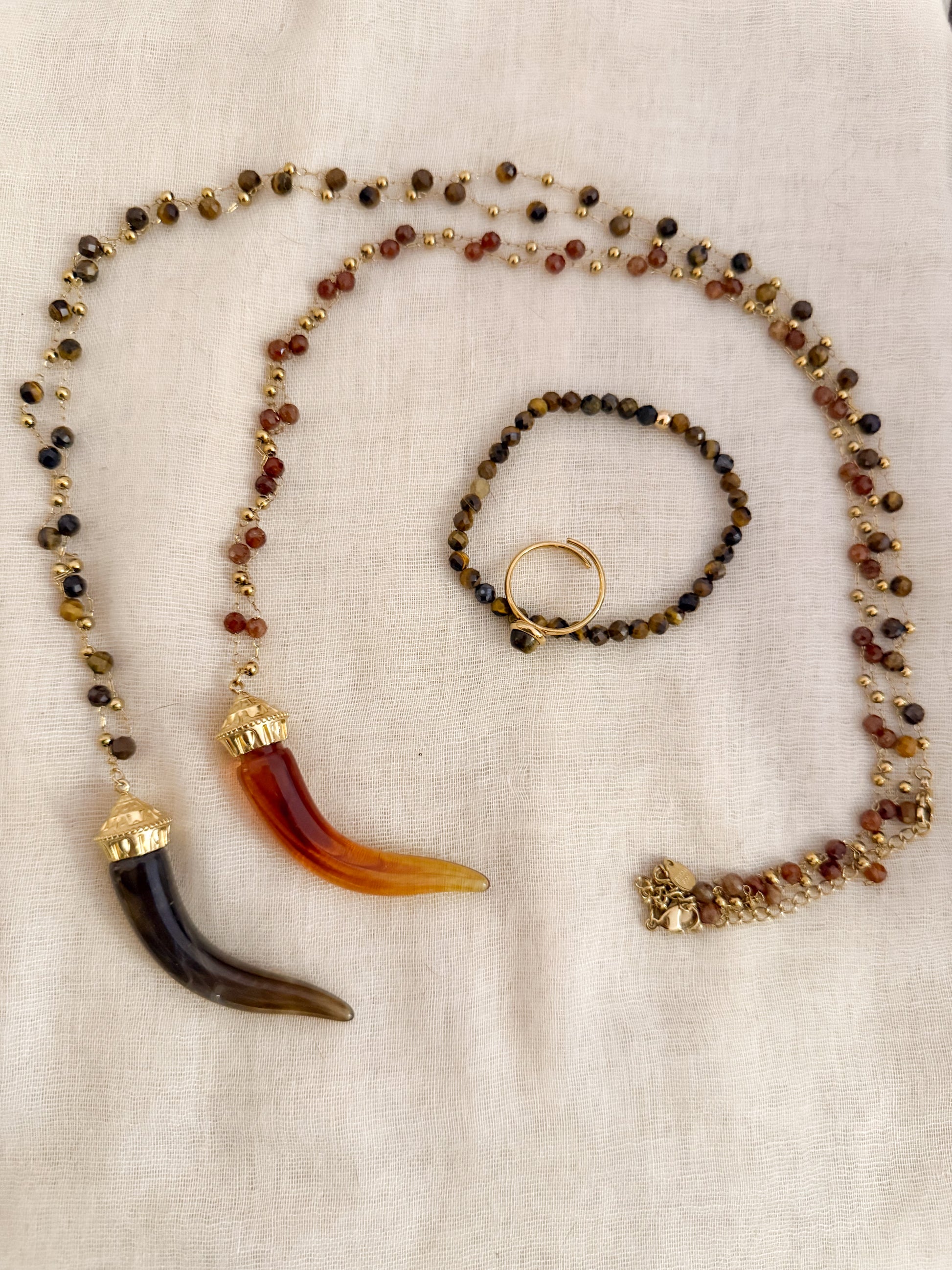 Su colgante en forma de colmillo estilizado simboliza fuerza y protección, mientras las cuentas facetadas de ojo de tigre reflejan la luz con un brillo cálido y magnético.