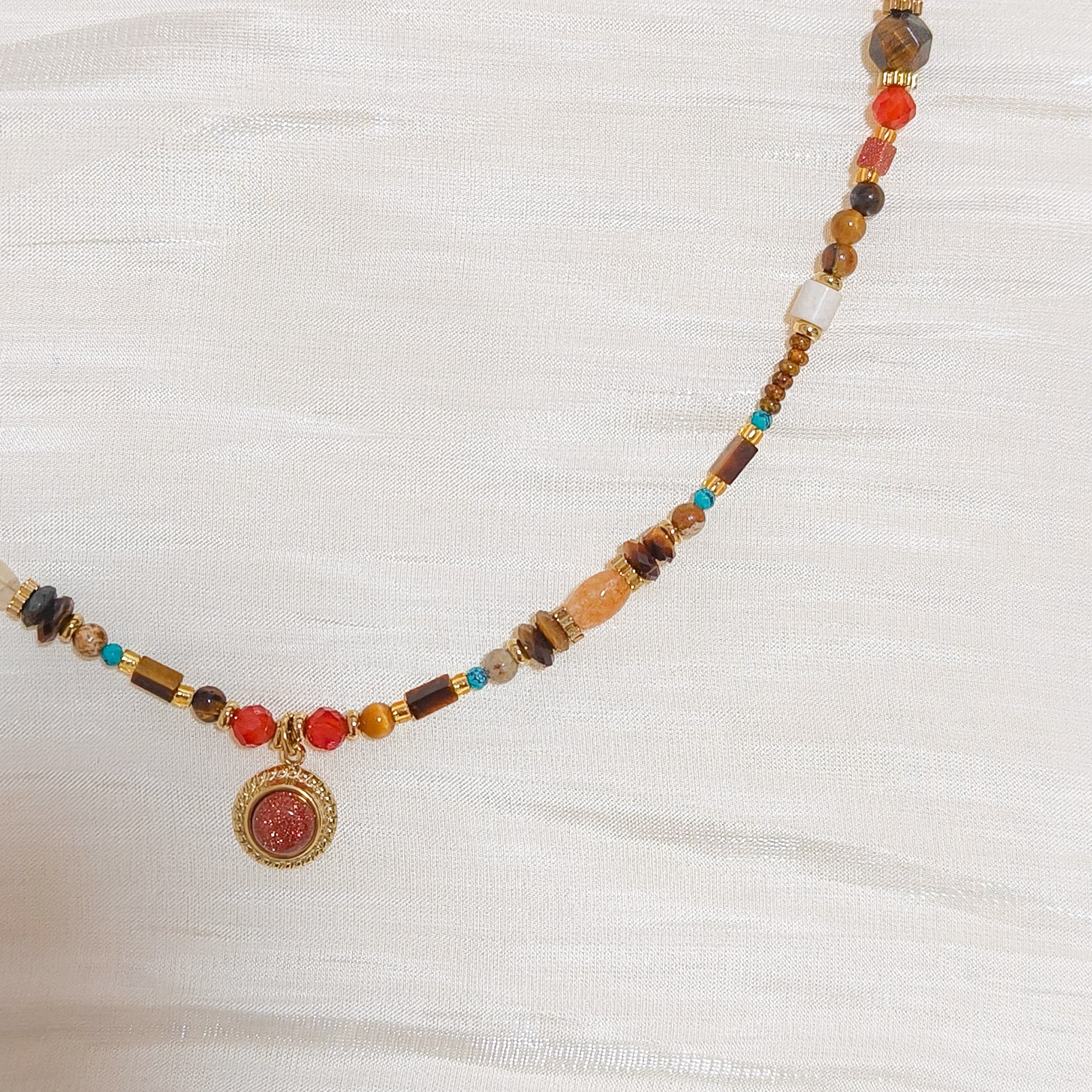 - Collar de cuentas en tonos tierra y toques turquesa con un charm redondo rojo enmarcado en dorado.