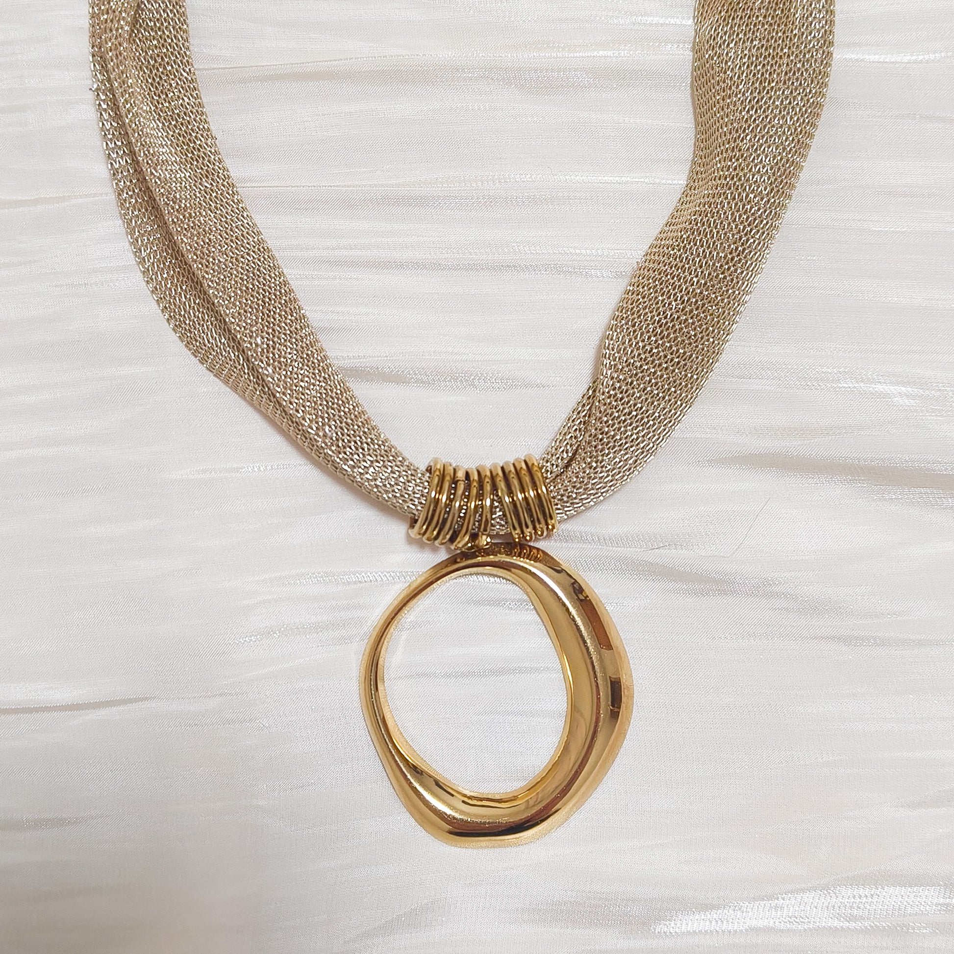 - Espectacular collar corto con tiras de malla dorada y colgante grande en forma de aro orgánico.