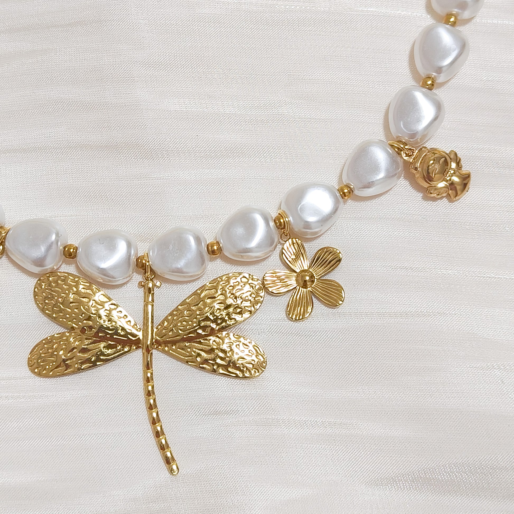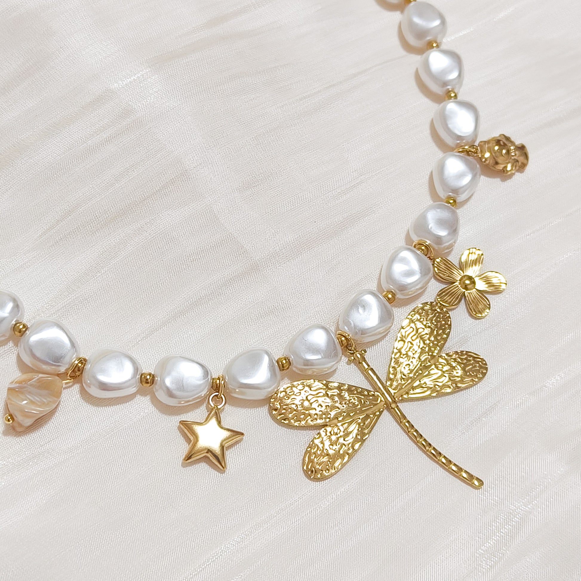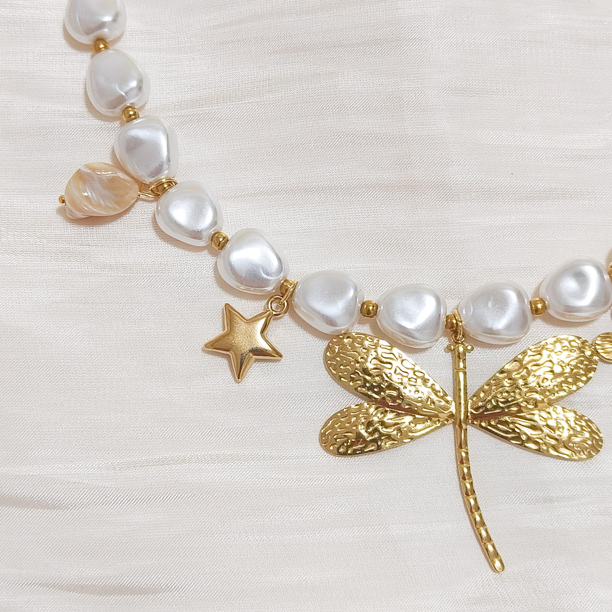 - Cuenta blancas con brillo de perla y detalles dorados y una libélula grande central acompañada de estrella y flores.