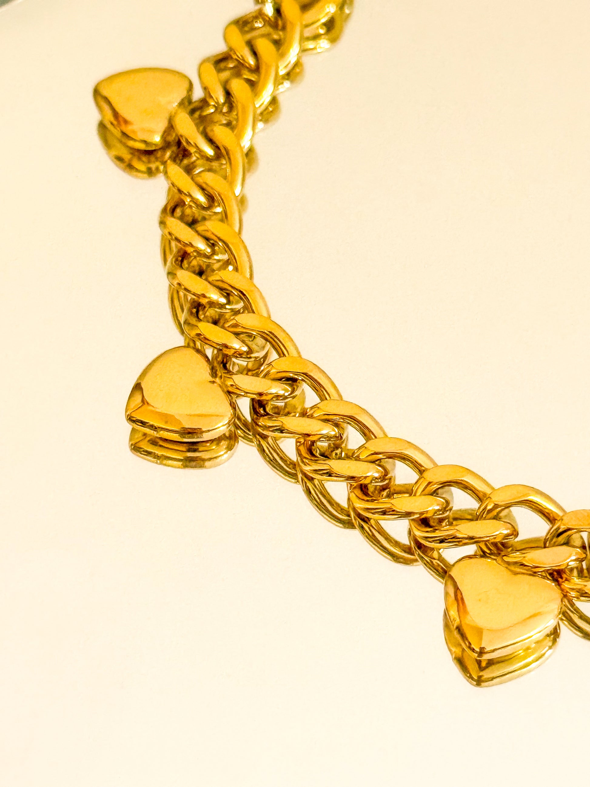 Collar de eslabones con pequeños corazones dorados. Minimalista y femenino, ideal para quienes buscan un accesorio sutil pero con personalidad.