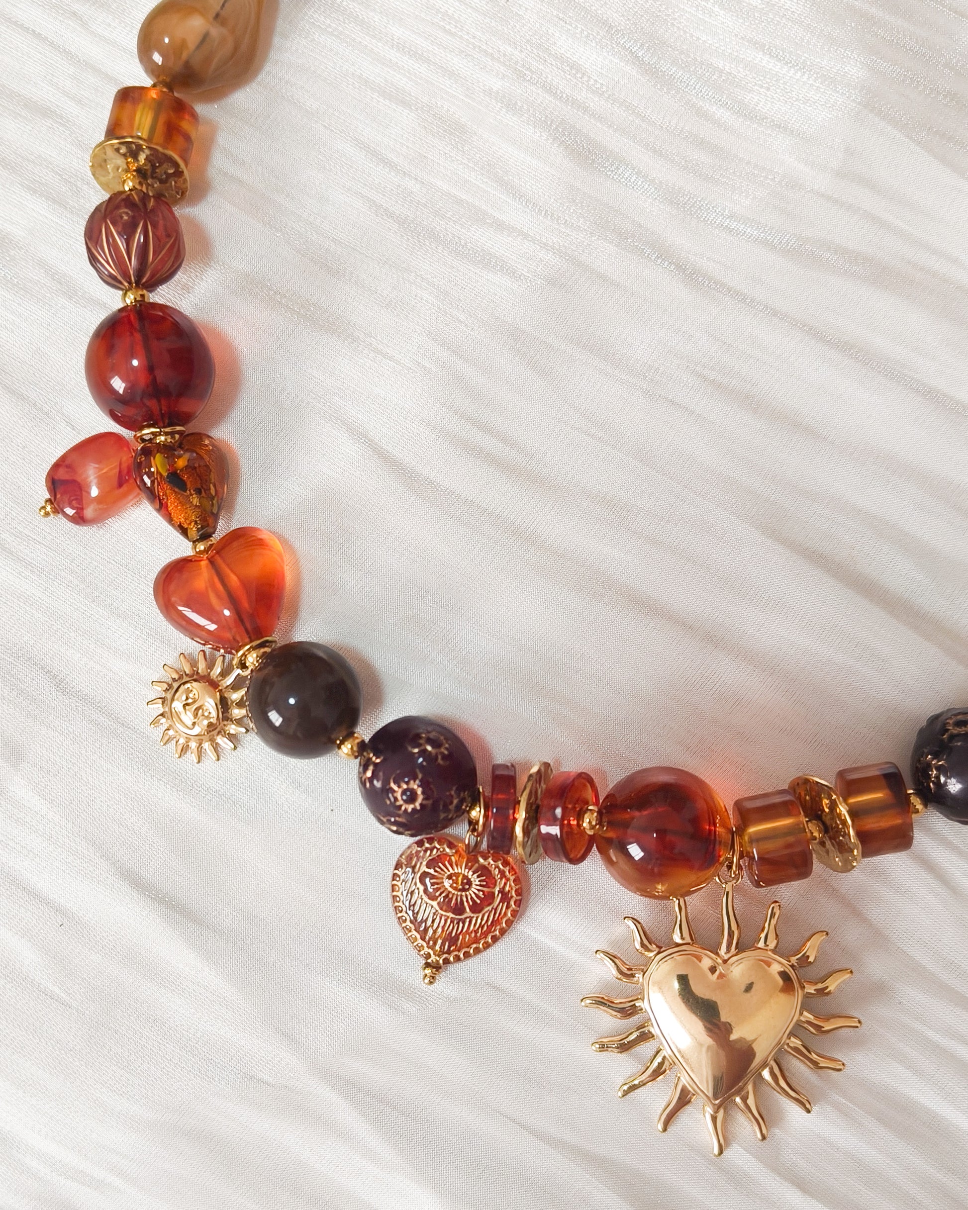 Cuentas con brillo y charms dorados: sol–corazón protagonista.