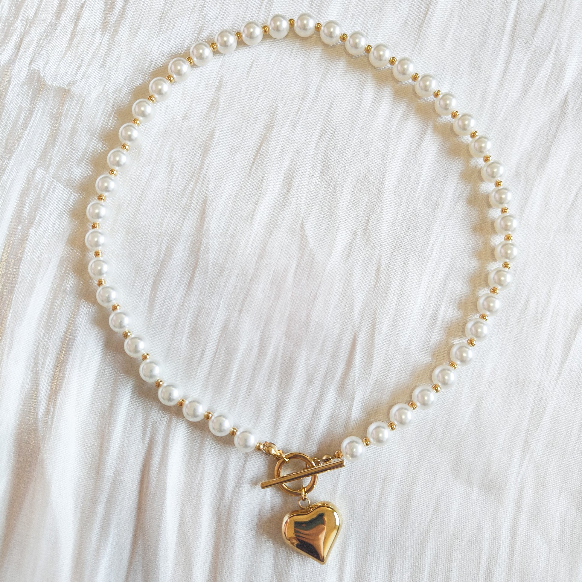 Collar de perlas sintéticas blancas con cierre delantero tipo barra y corazón dorado pulido.