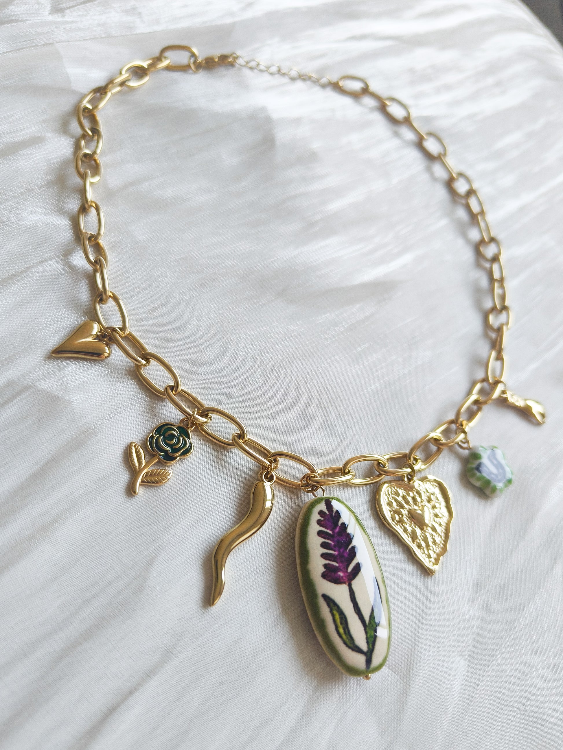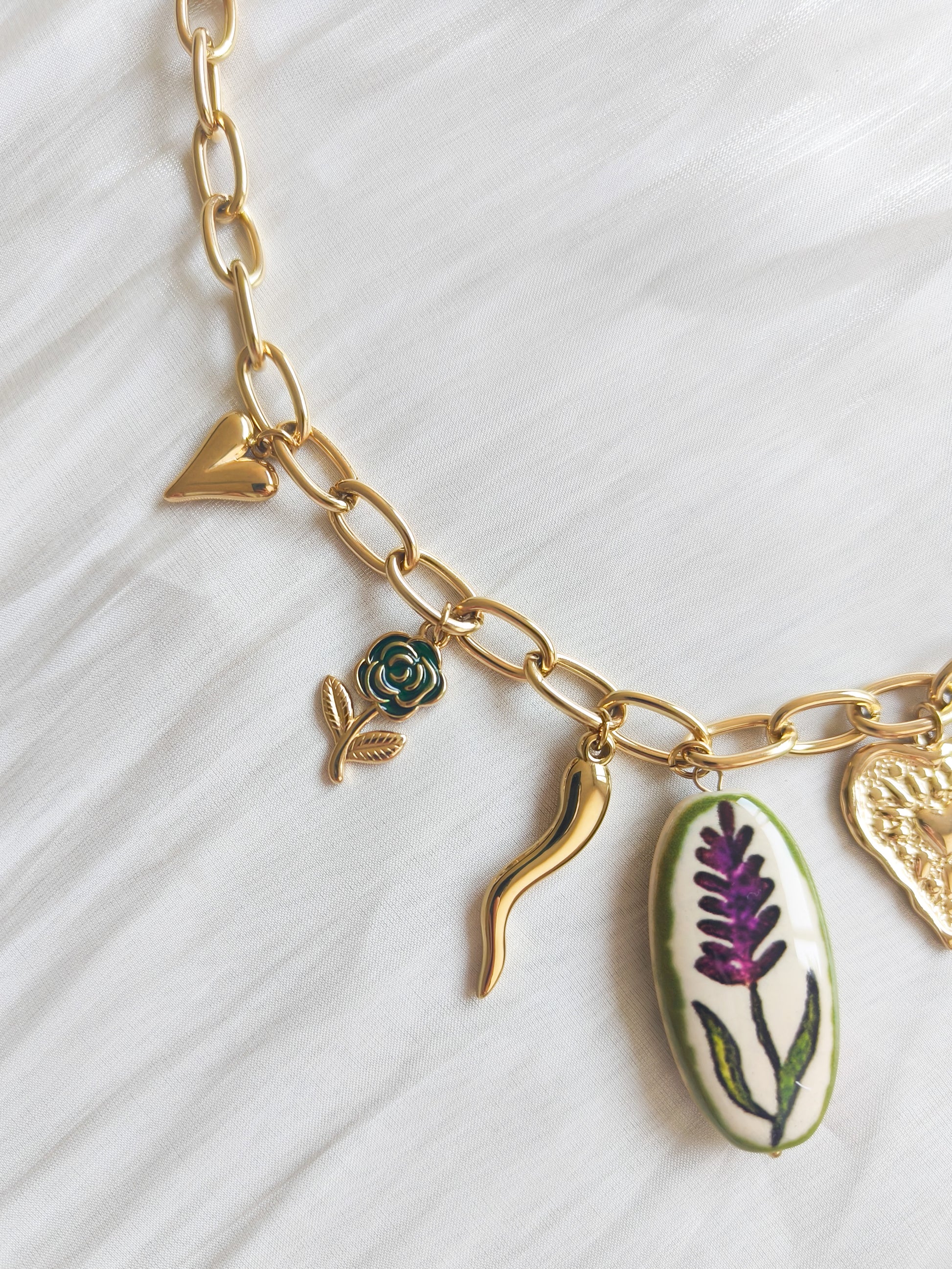 Descripción: Cadena eslabón con charms botánicos y medallas en acero inoxidable; elegante y original.