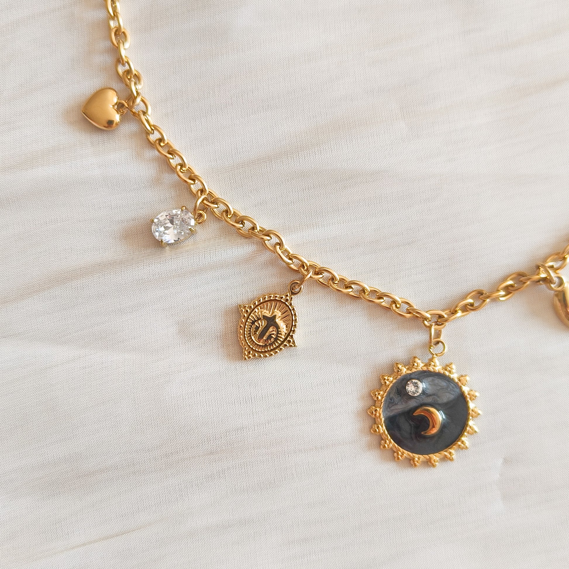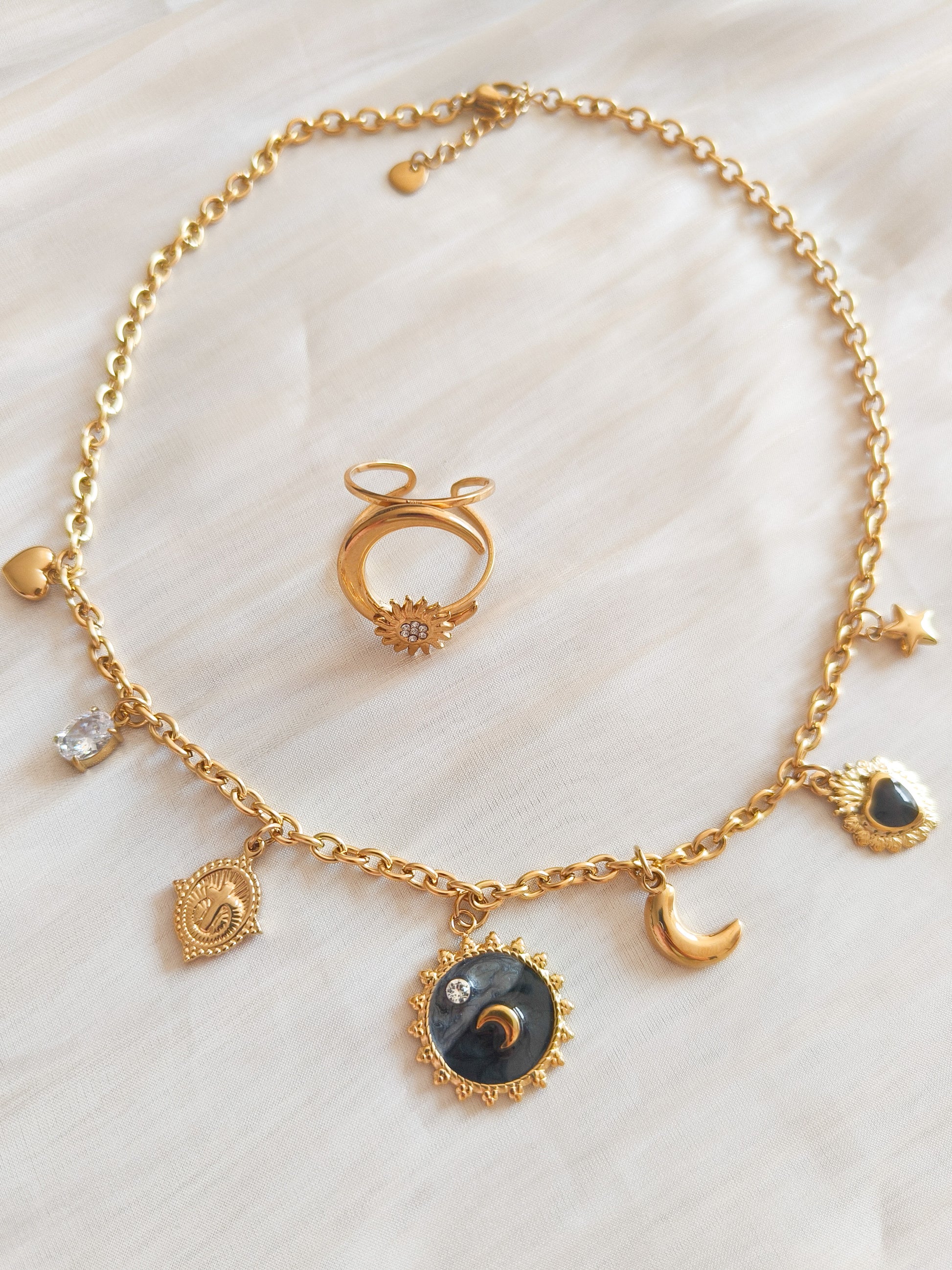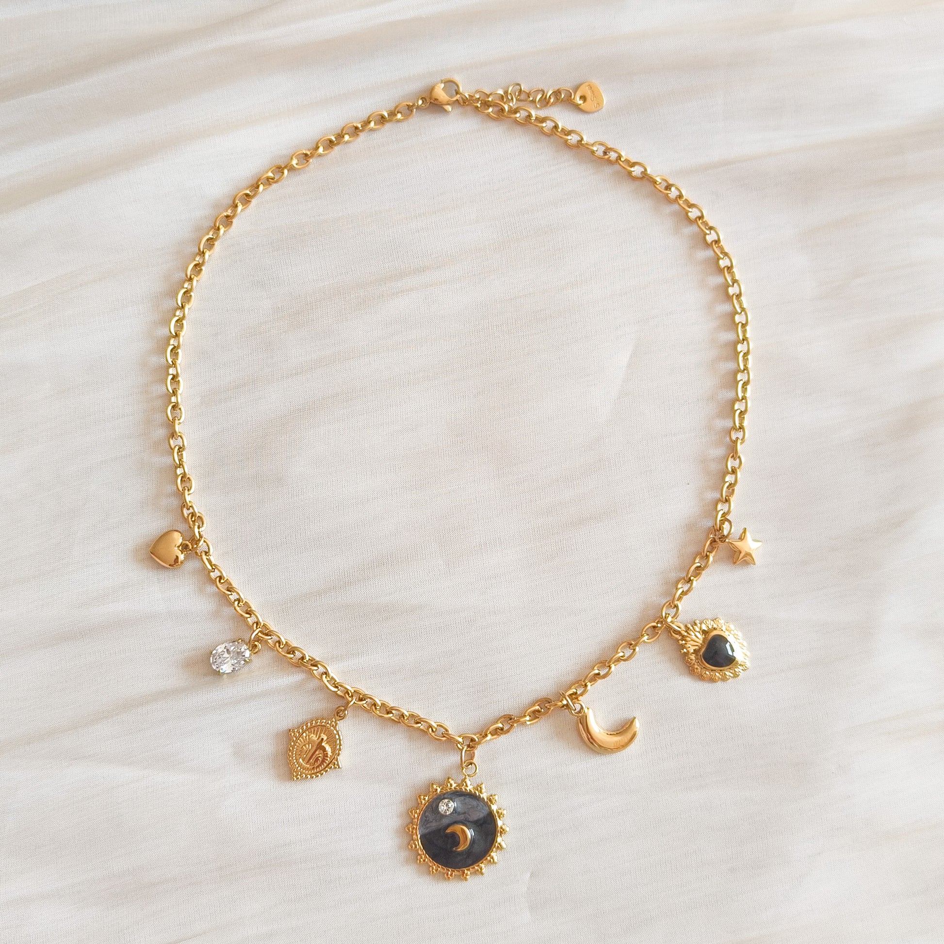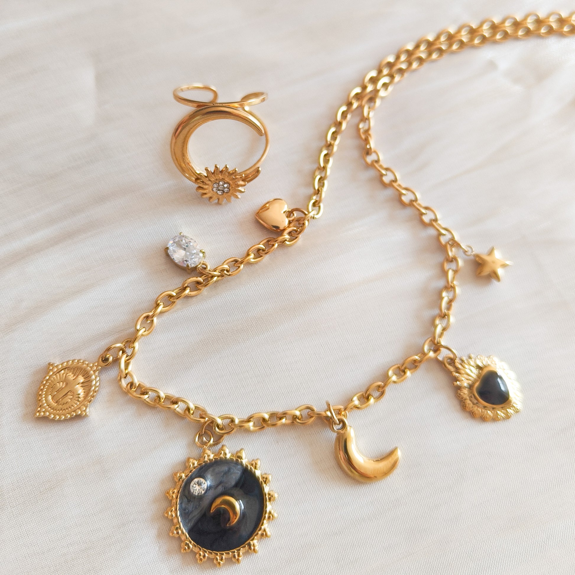 Descripción: Cadena dorada de acero inoxidable premium, con charms luna, corazón y medallas negras esmaltadas que capturan la luz. Ideal para elevar básicos; combínalo con aros dorados para un toque místico.
