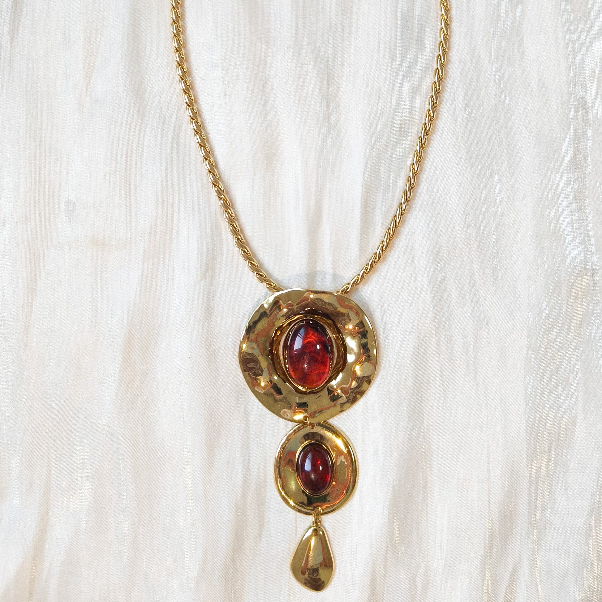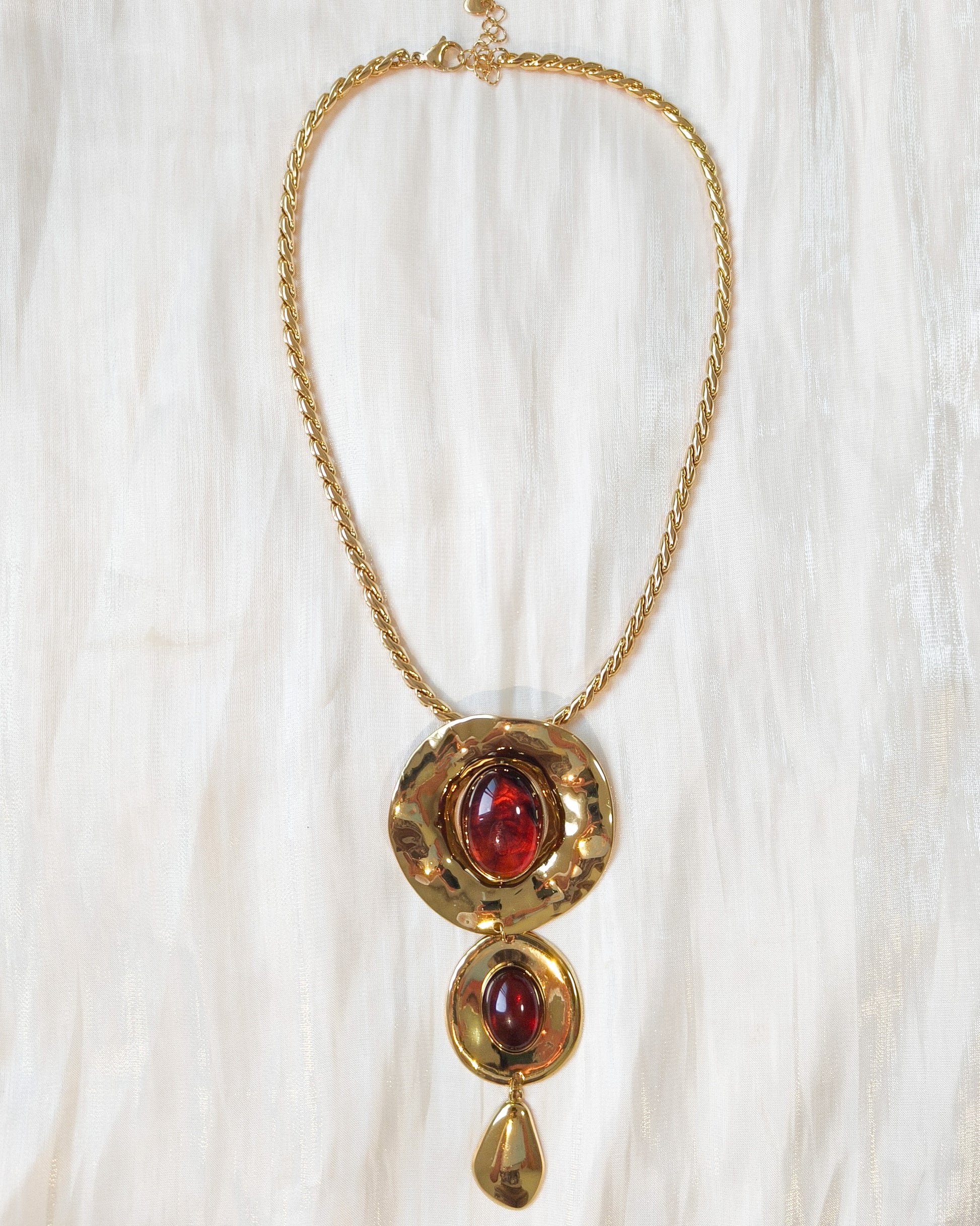 - Colgante escalonado con cabujones marrones sobre metal martillado: glam total.