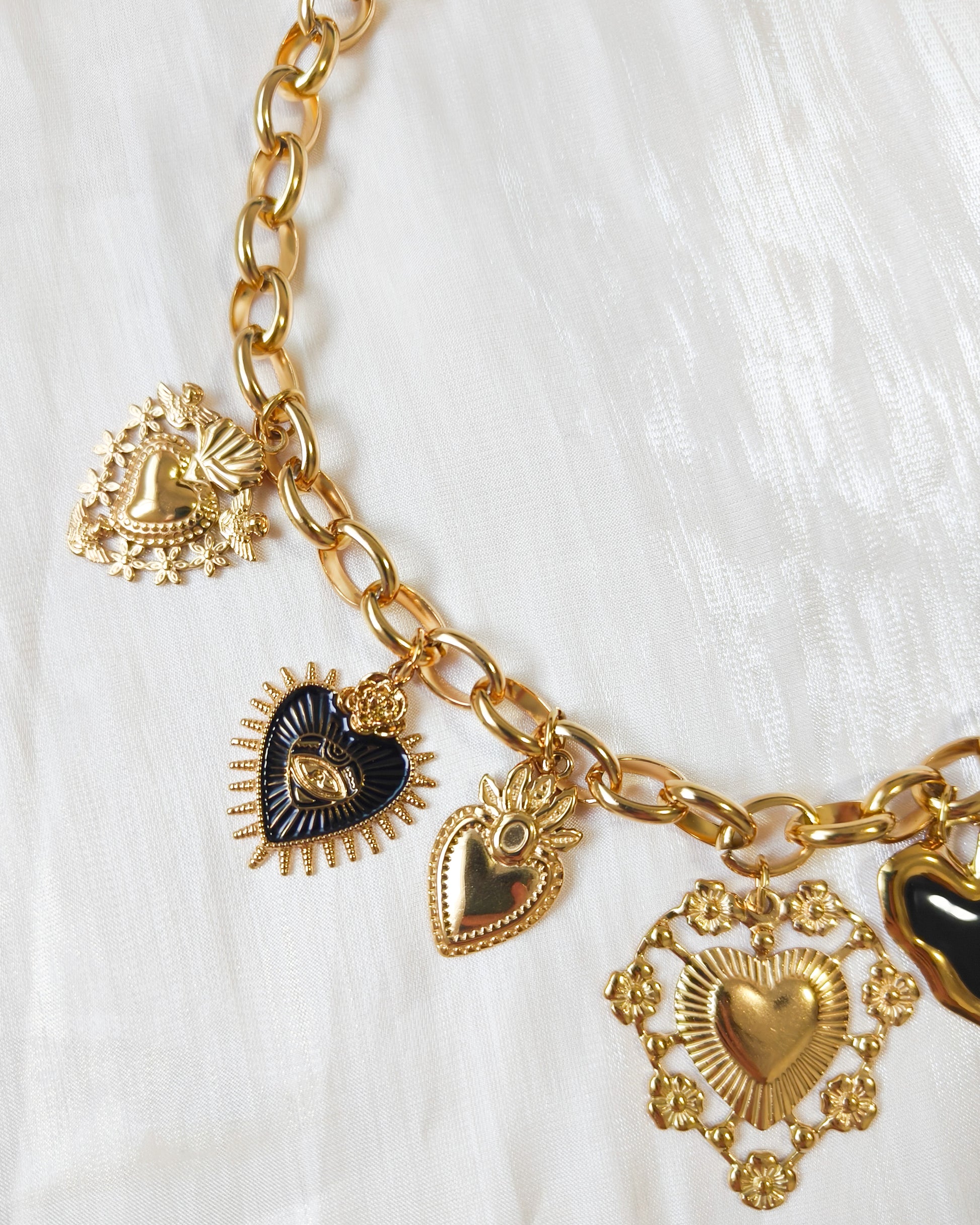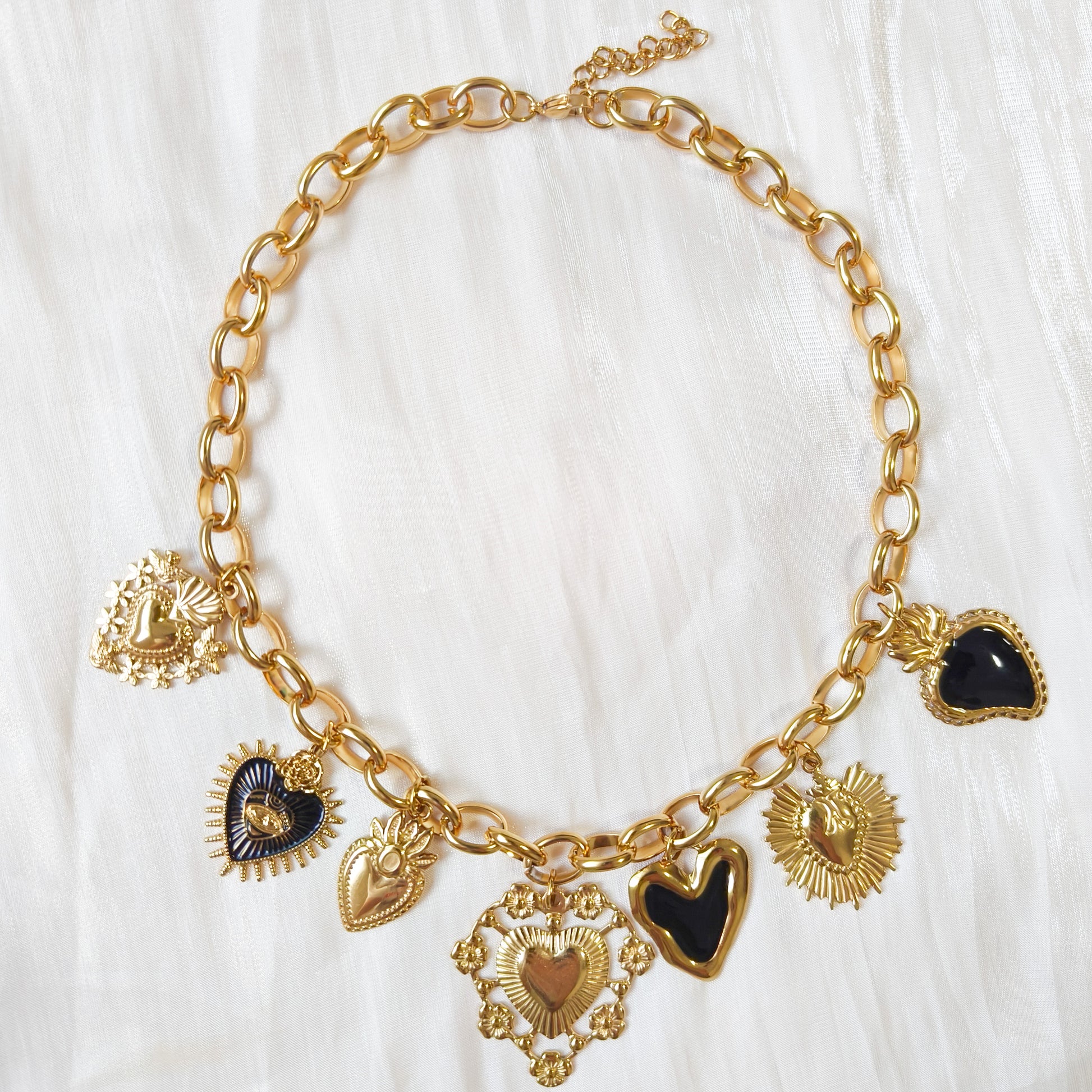 - Corazones de diferentes formas dorados en cadena gruesa: romántico, audaz y muy favorecedor.