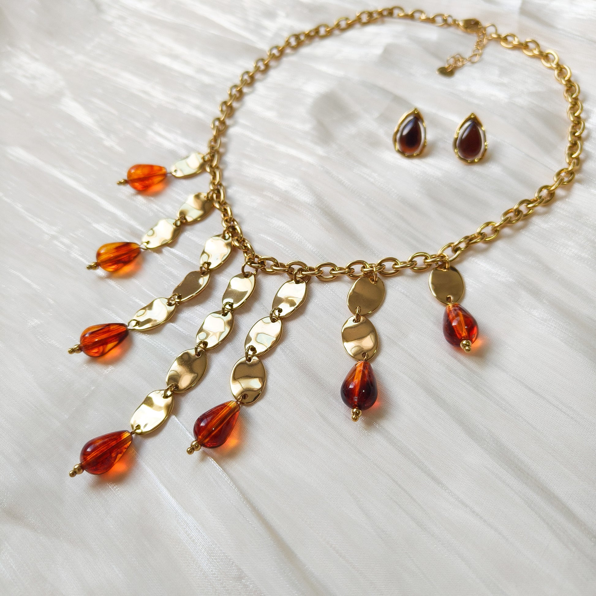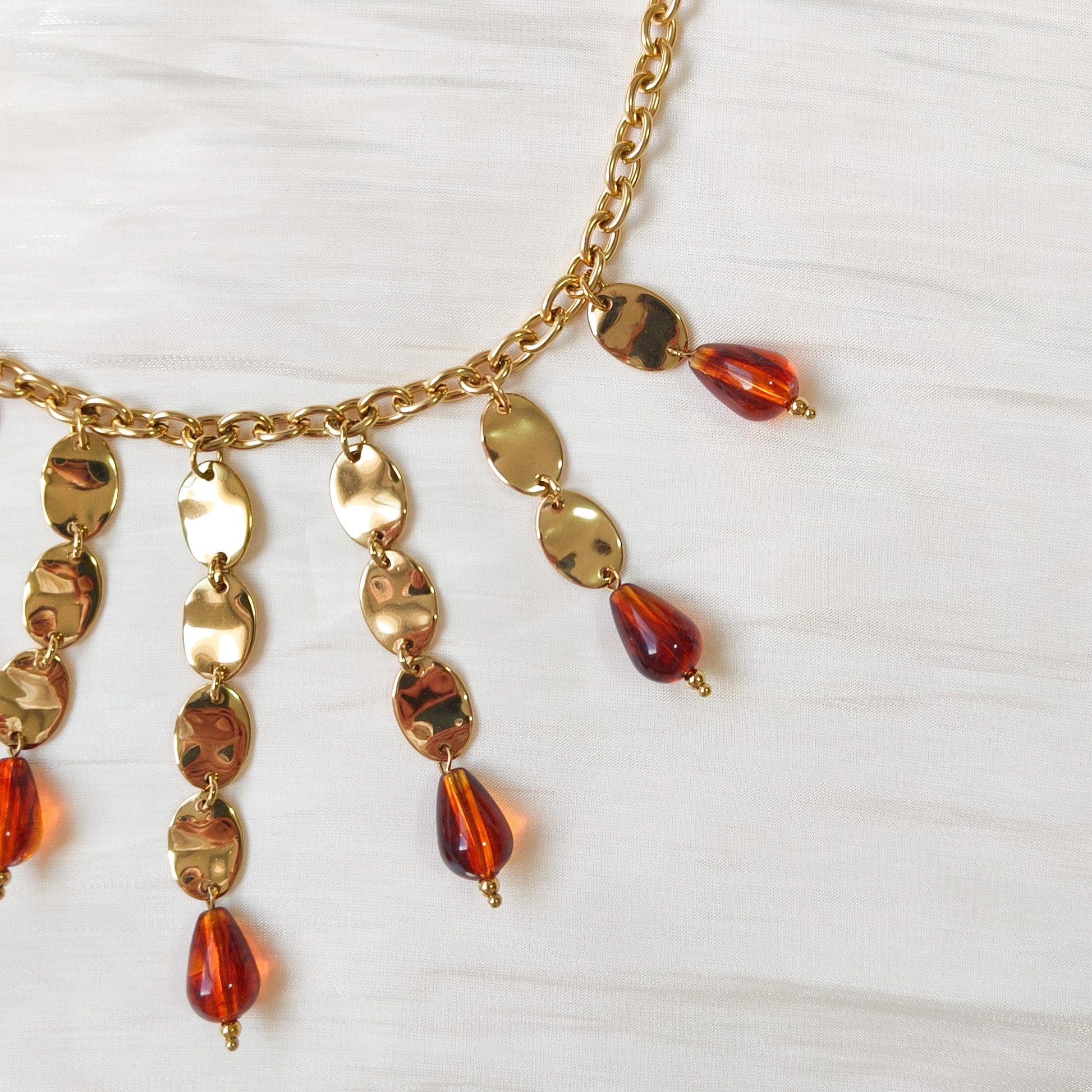 - Cadenita dorada con discos martillados y gotas color miel que bailan con la luz: elegantísimo.