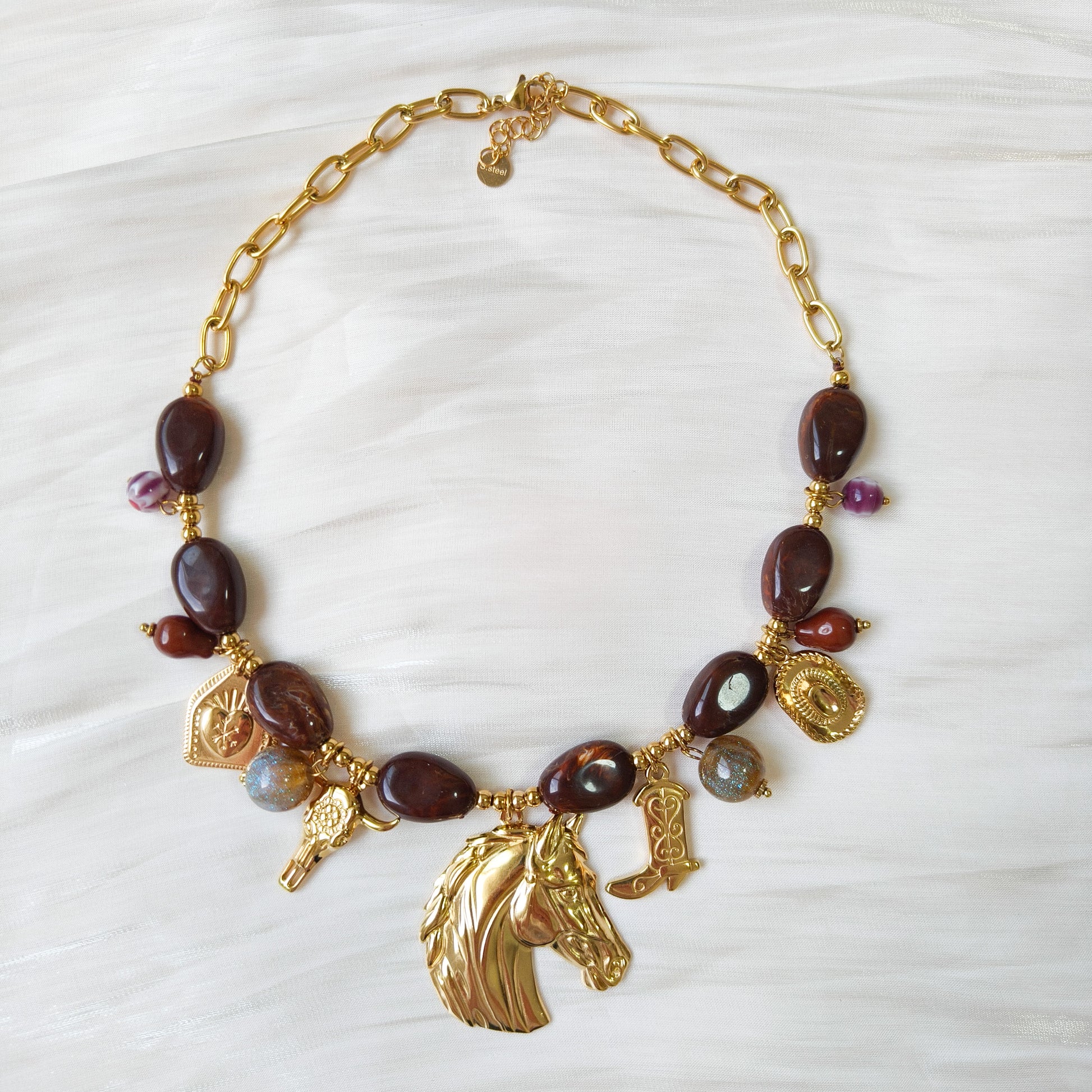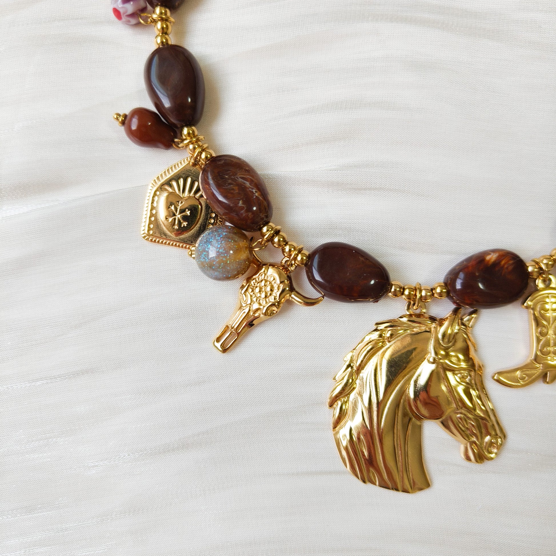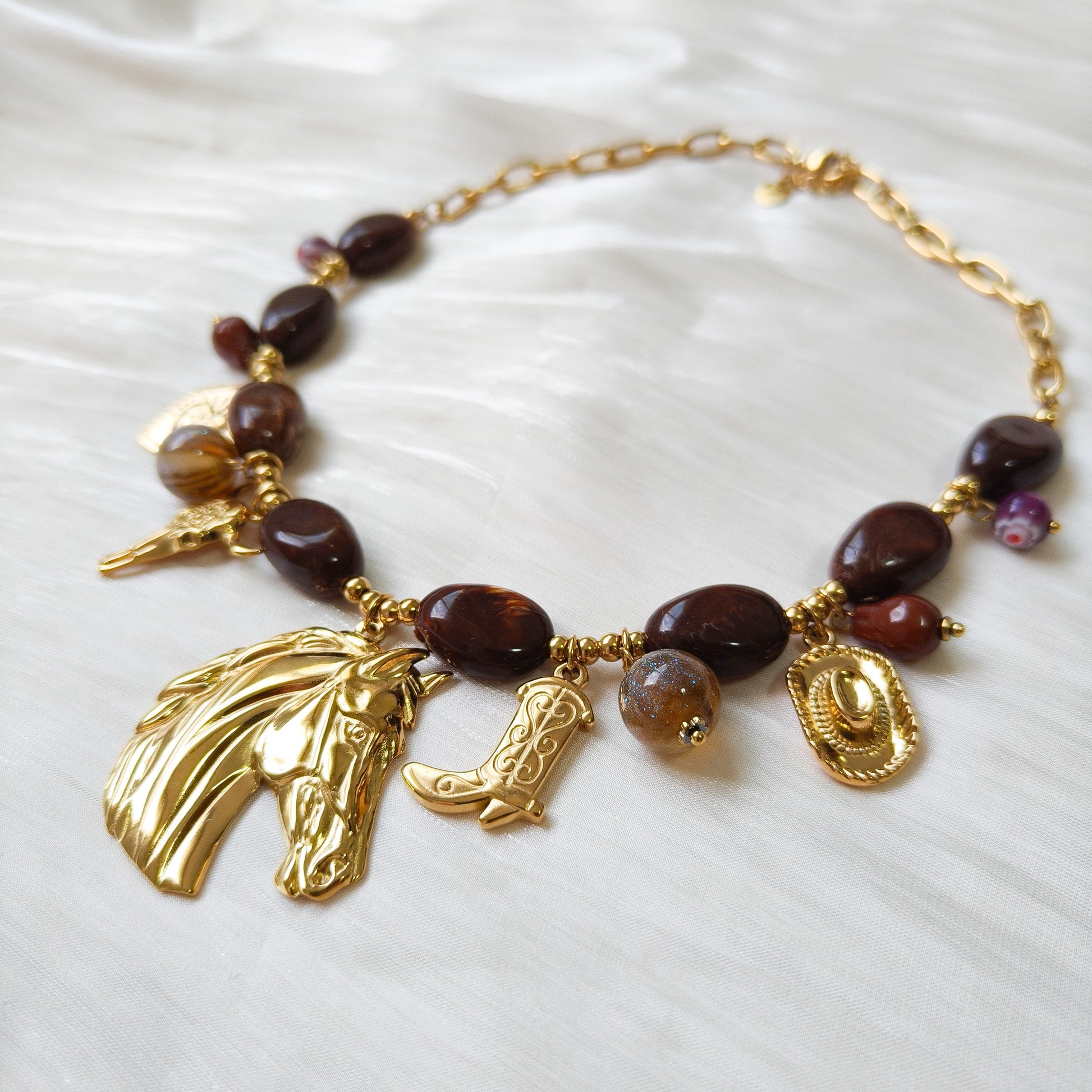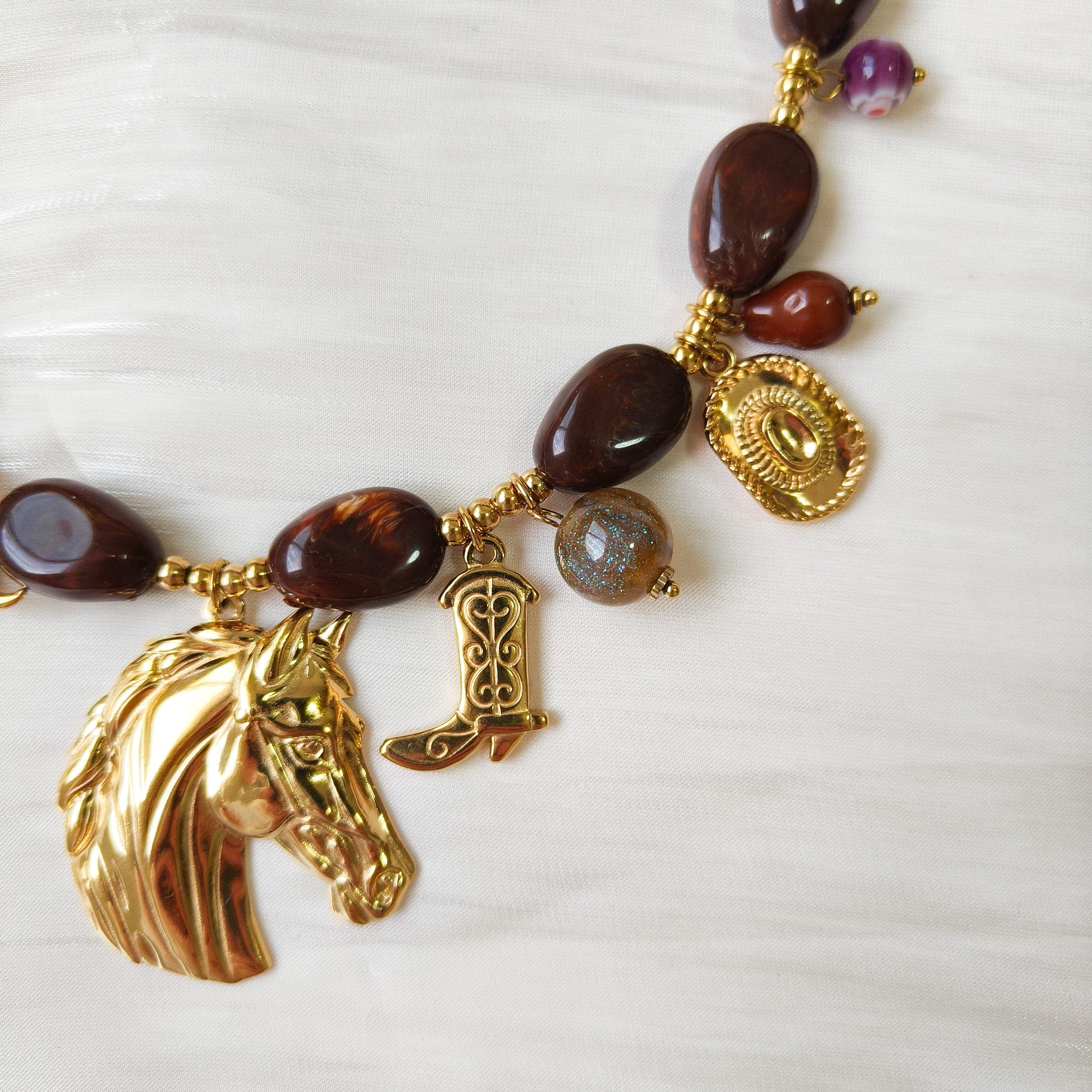 - Mitad cadena dorada, mitad cuentas marrón con charms ecuestres y medallitas.