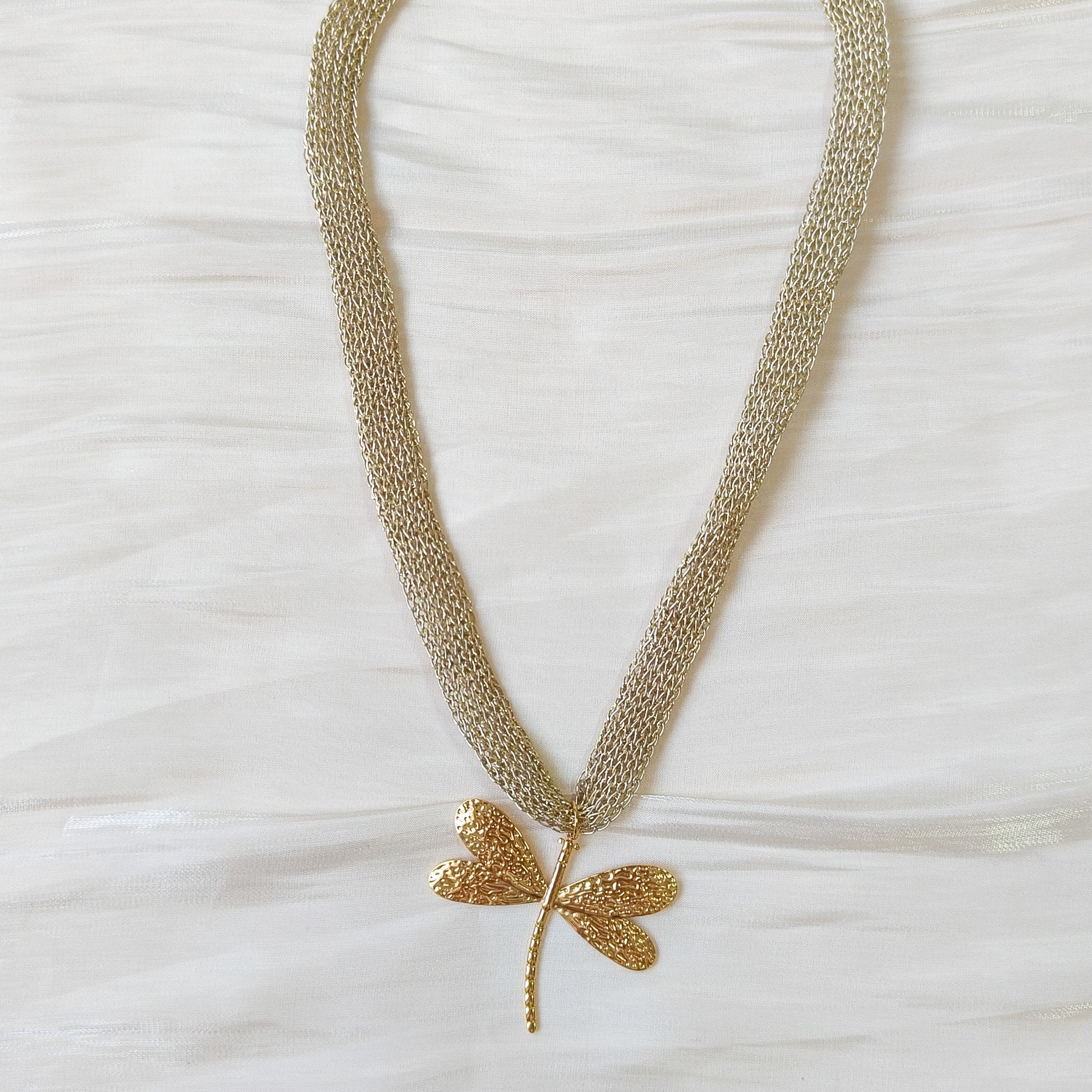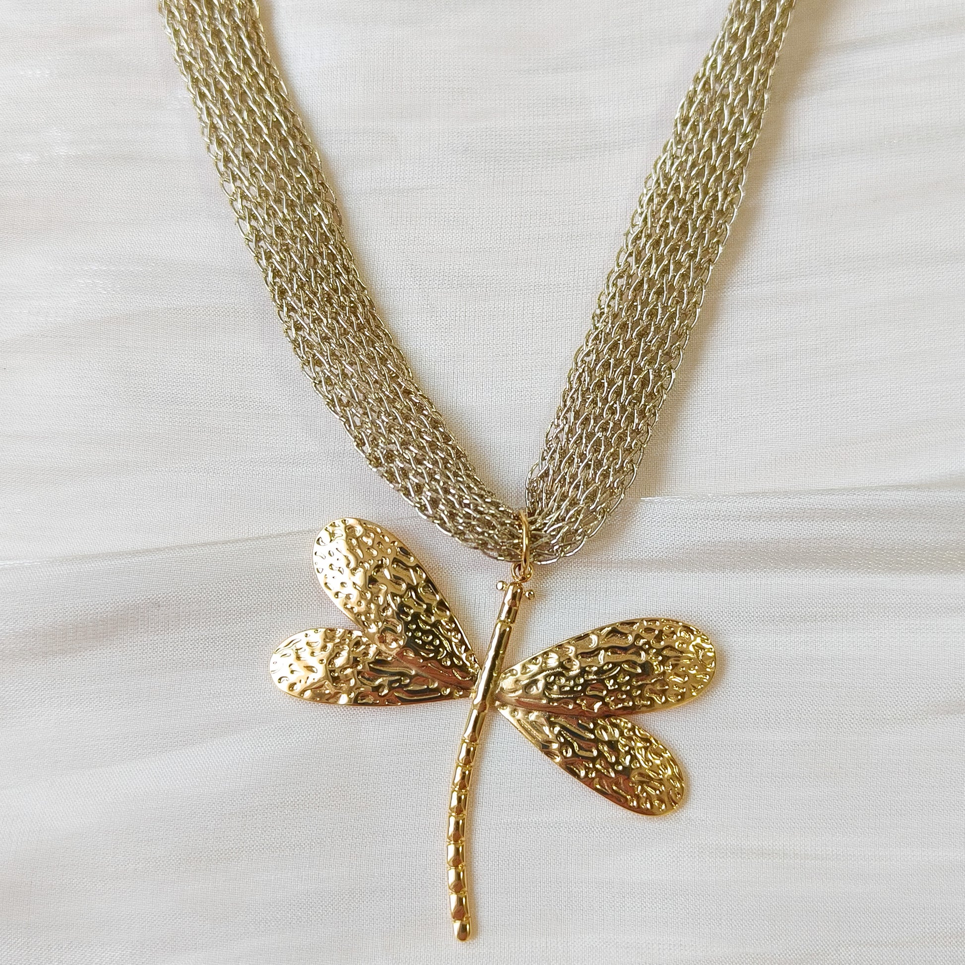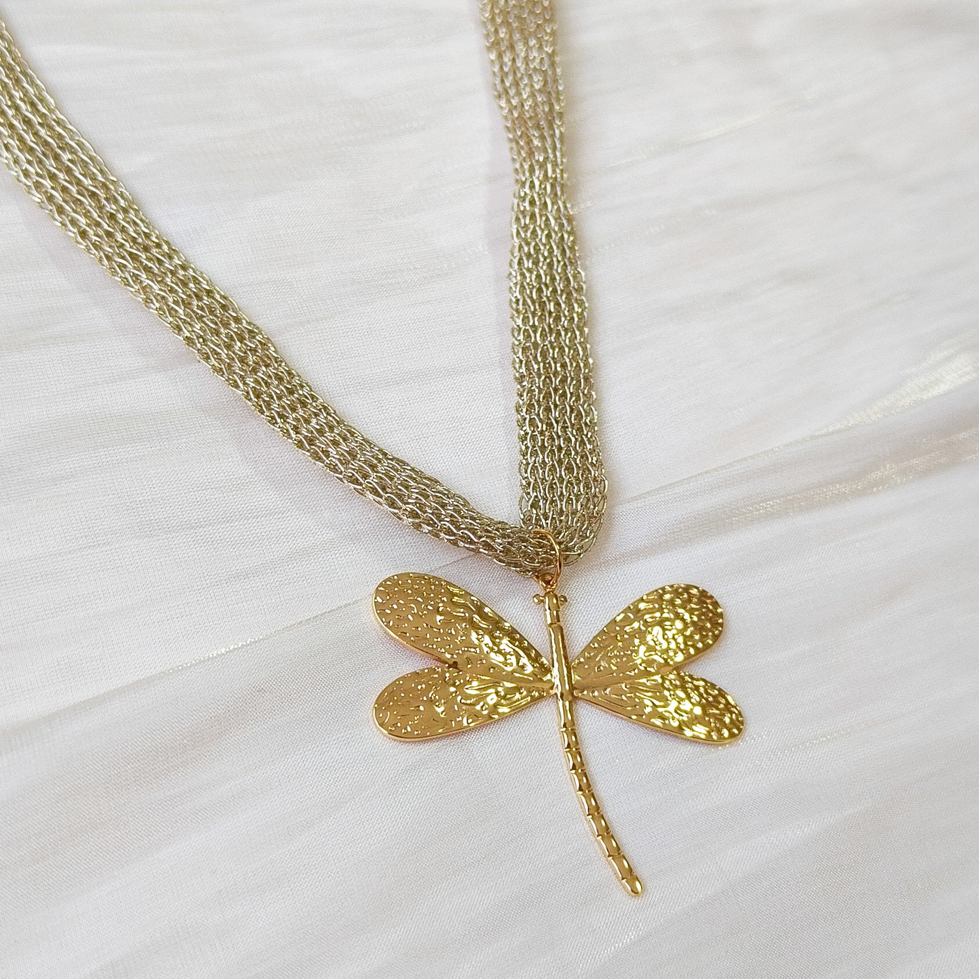 - Malla doble dorada con colgante de libélula texturada: delicado y artístico.