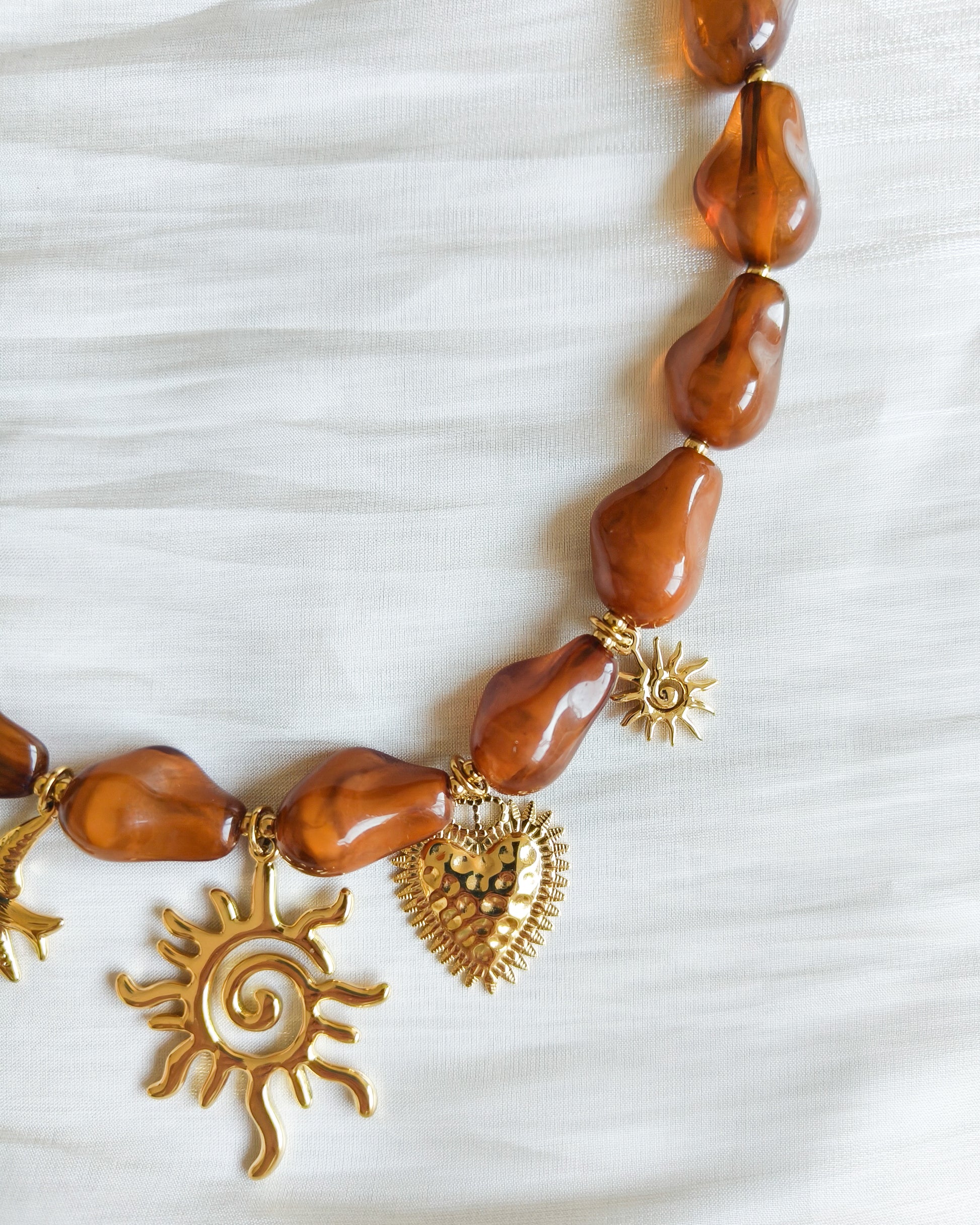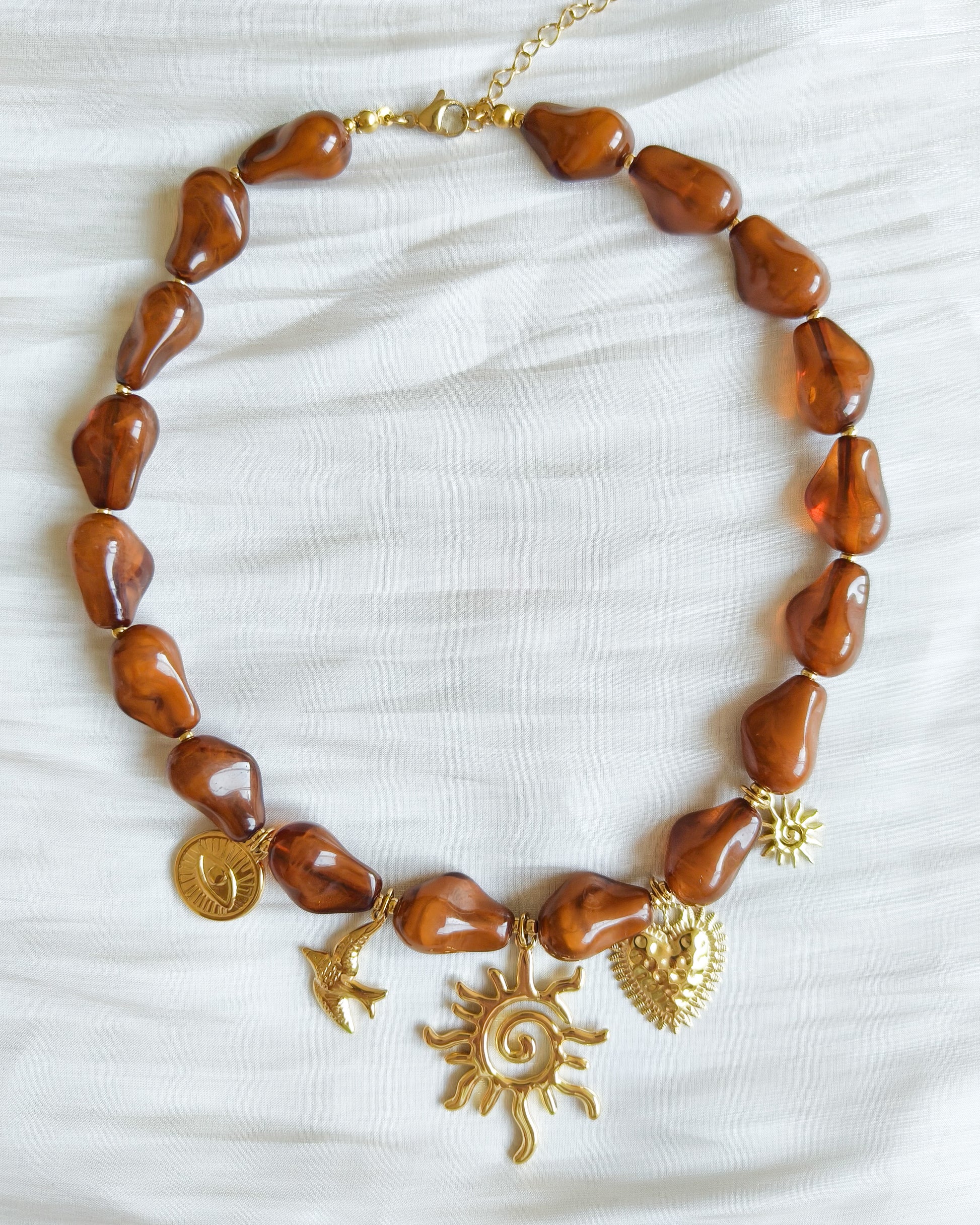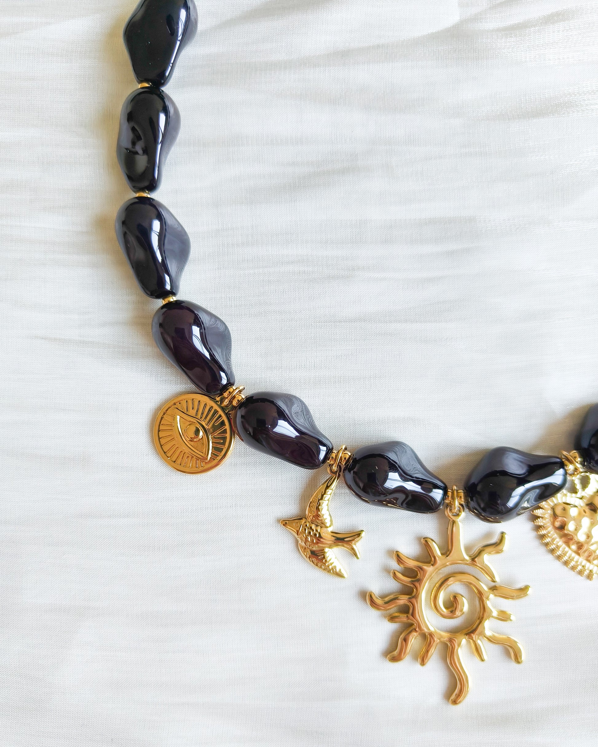 Descripción: Cuenta de la forma de gota irregulares con charms dorados del sol, corazón, moneda y golondrina, en acero inoxidable; diseño potente y precioso. Brilla muchísimo y enmarca el cuello con estilo boho-chic.