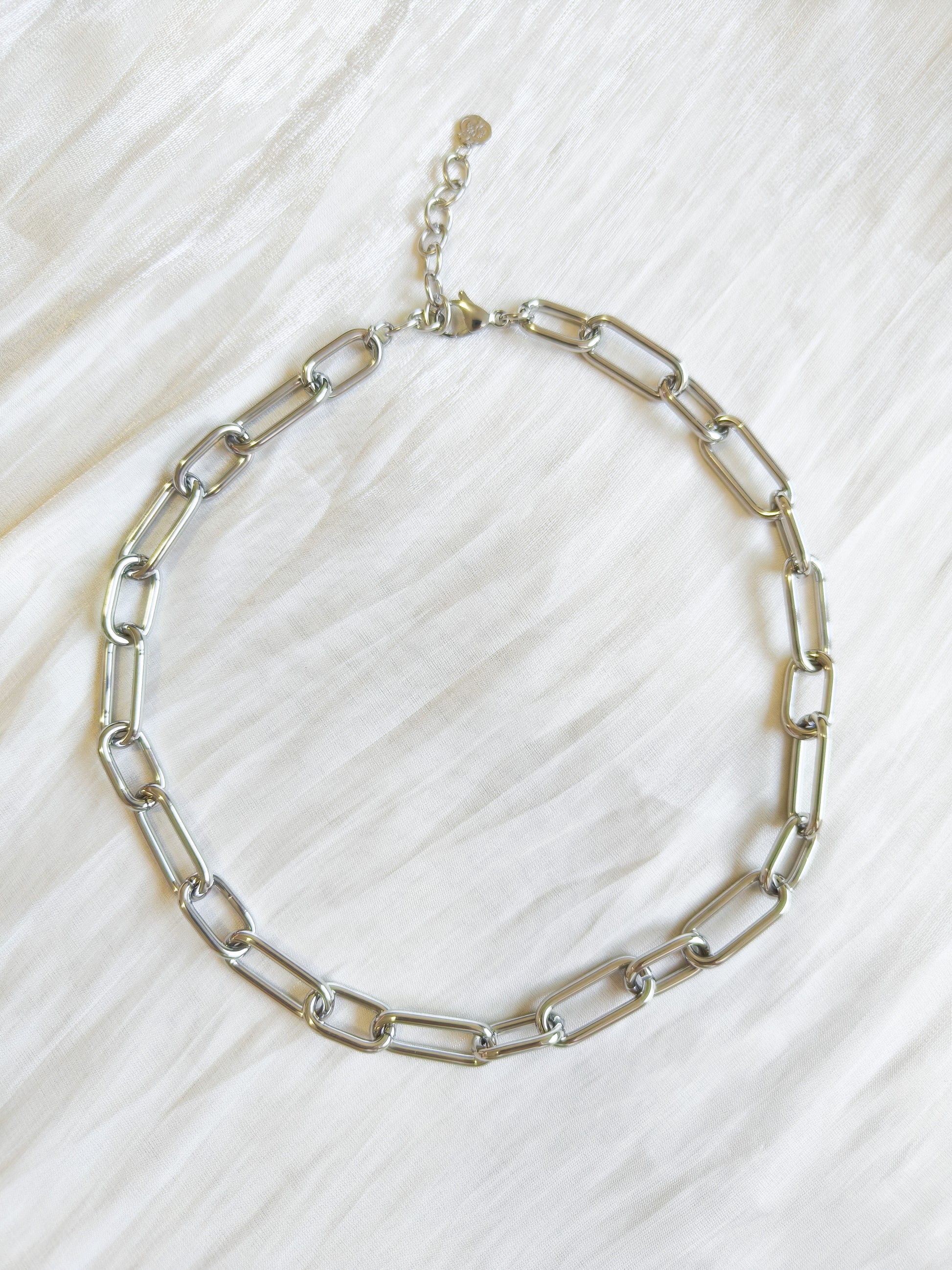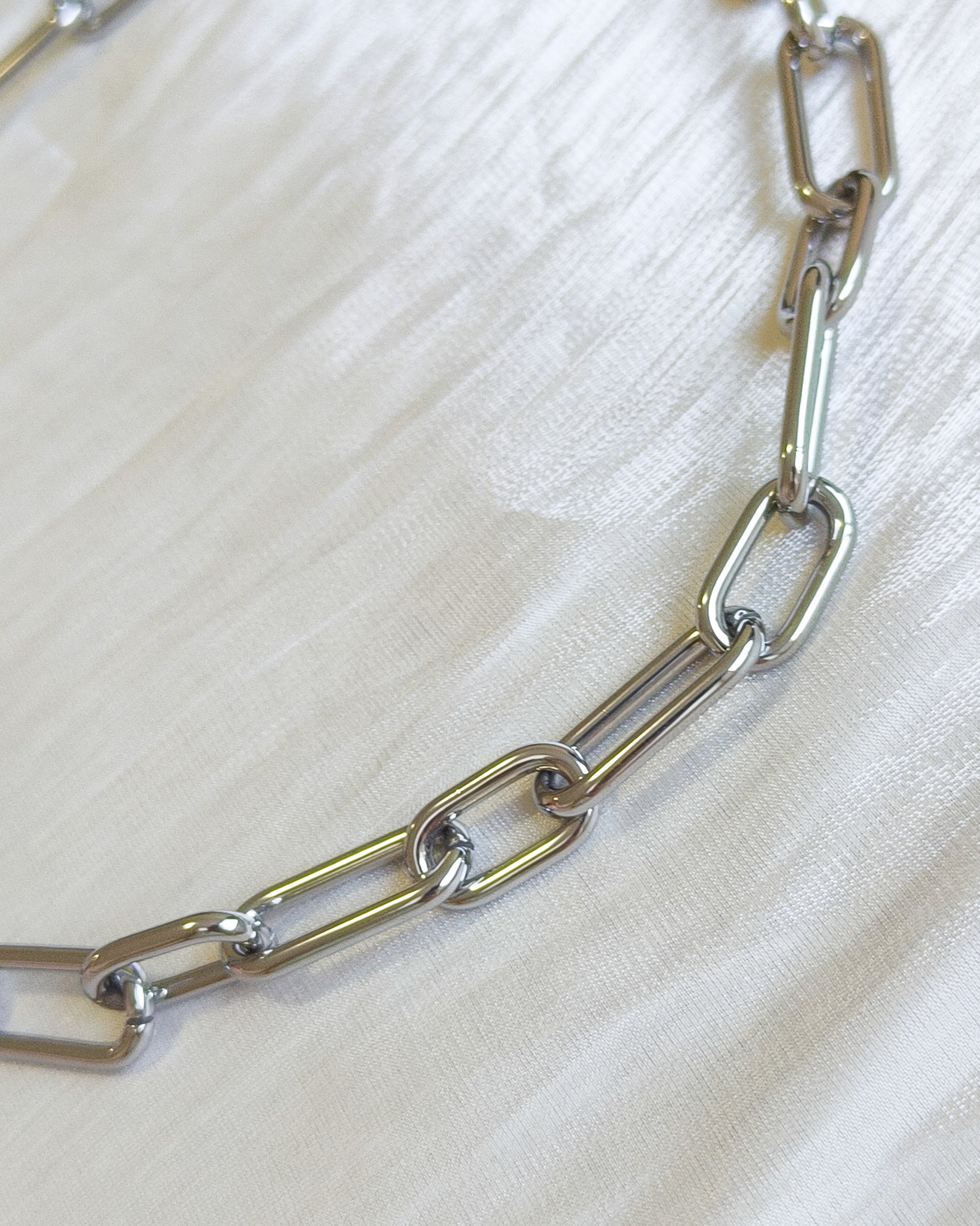 Descripción: Cadena de eslabón grande en acero inoxidable; pulido y con carácter. Se ve limpio, elegante y muy combinable.