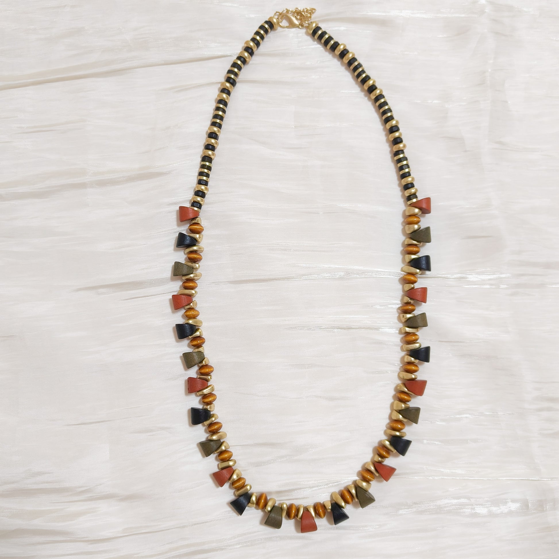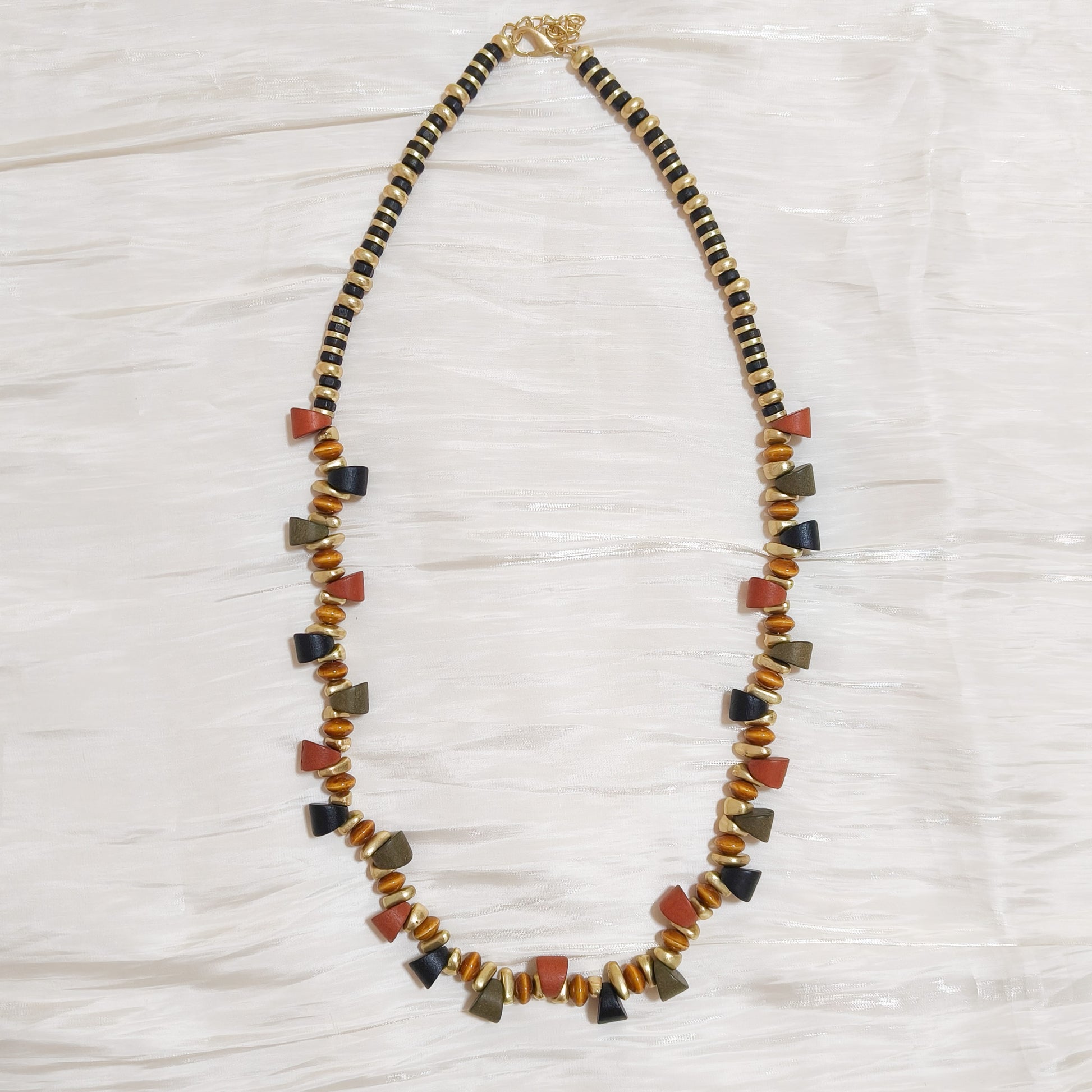 - Collar de cuentas en tonos negros, dorados y terracota que da un toque étnico y muy estiloso. Cuentas movibles para que salgan diferentes modelos.