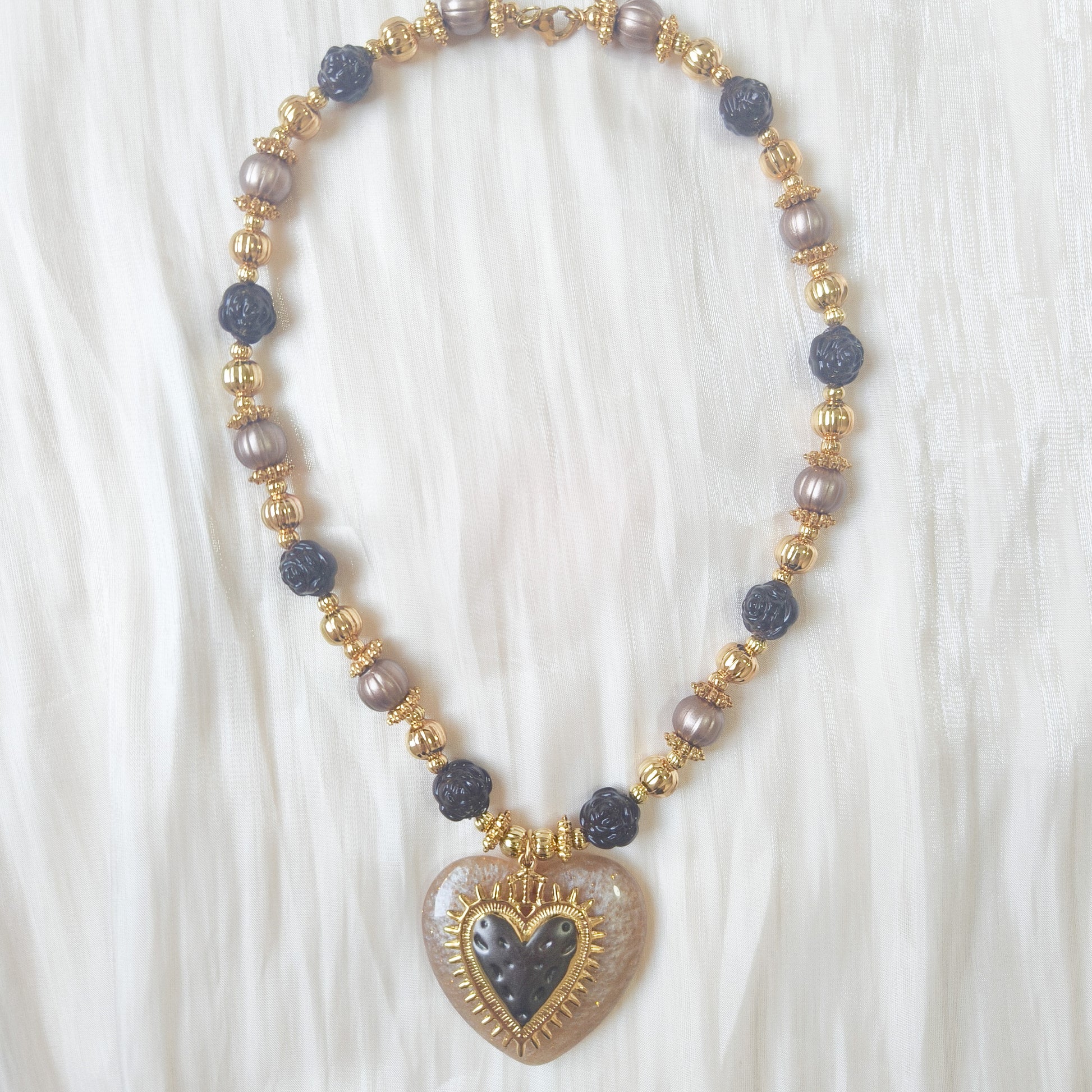 - Cuentas de efecto vintage y talladas con gran colgante de corazón estilo ex-voto.