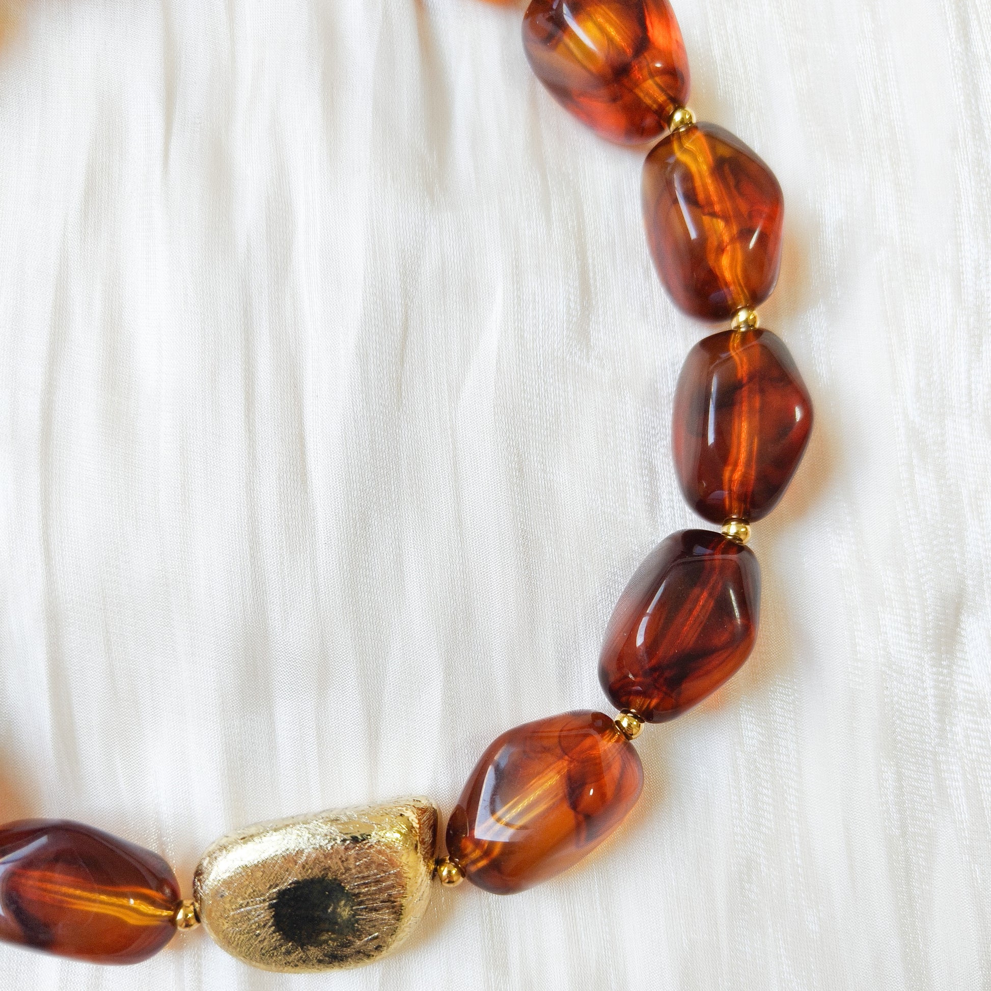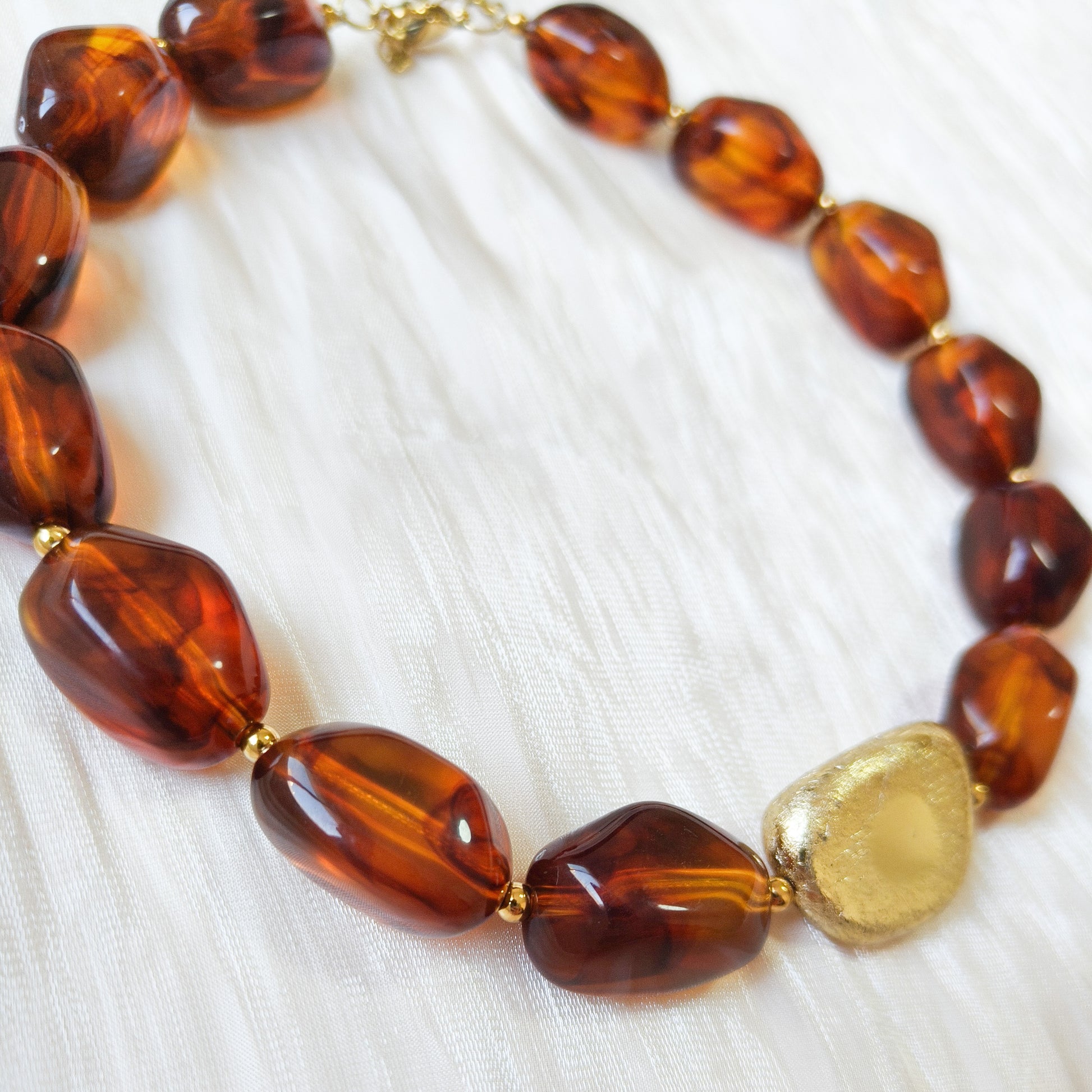 - Grandes cuentas de efecto piedra y color marrón con pieza central dorada que roba miradas.