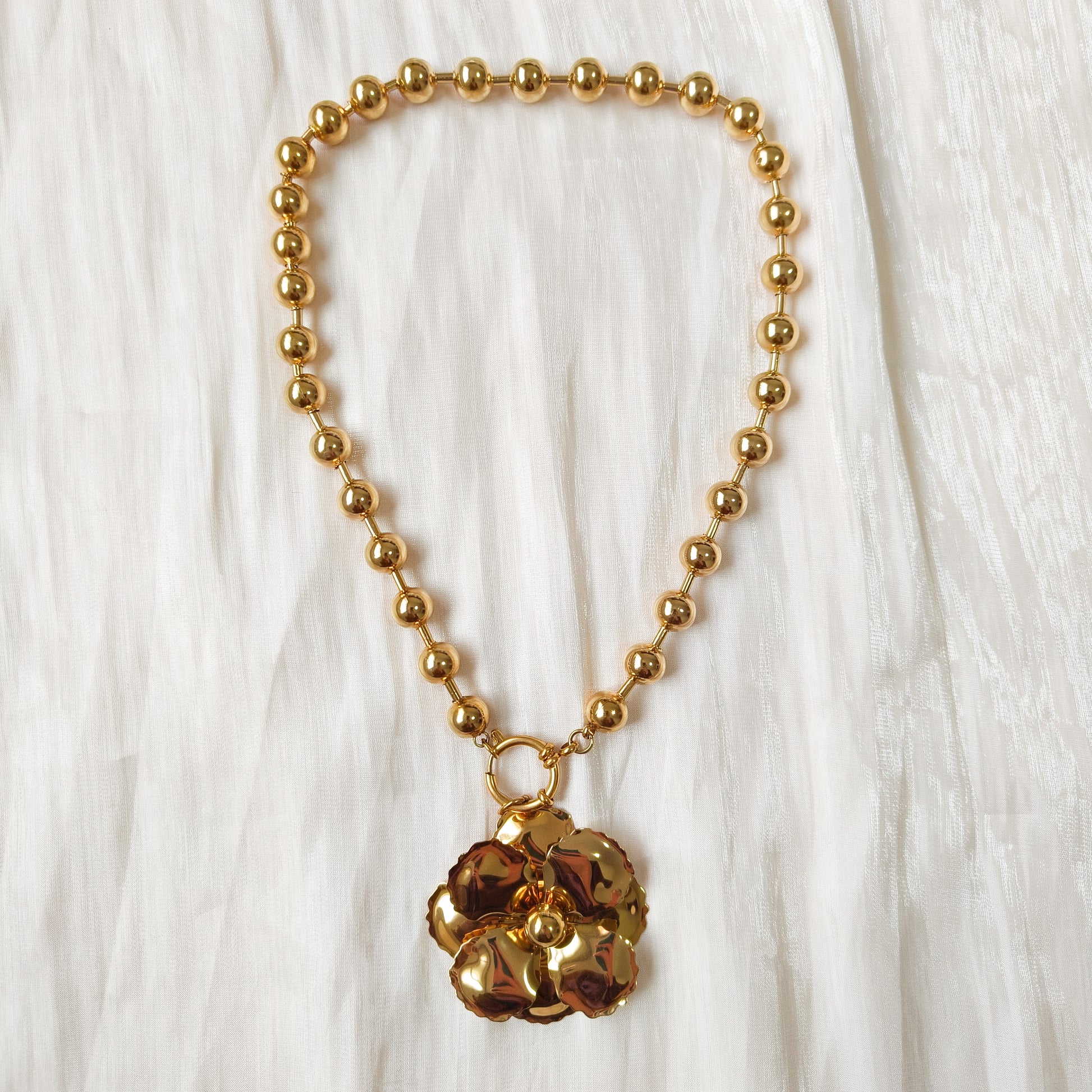 - Collar con bolitas doradas con gran flor metálica, femenino y muy luminoso.