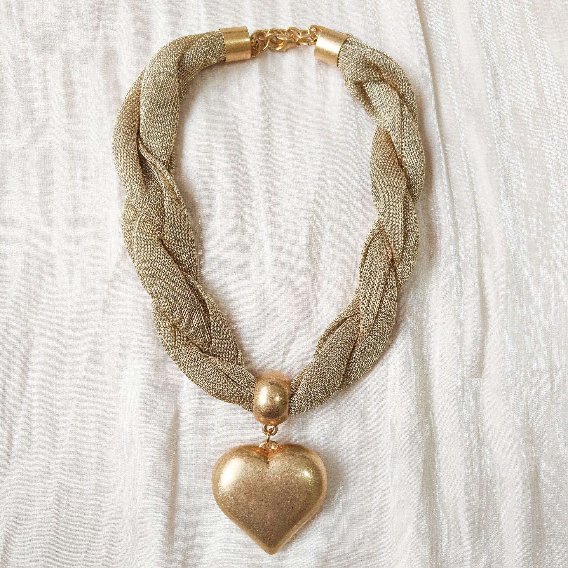 - Collar de malla trenzada con gran corazón, estilo vintage glam.