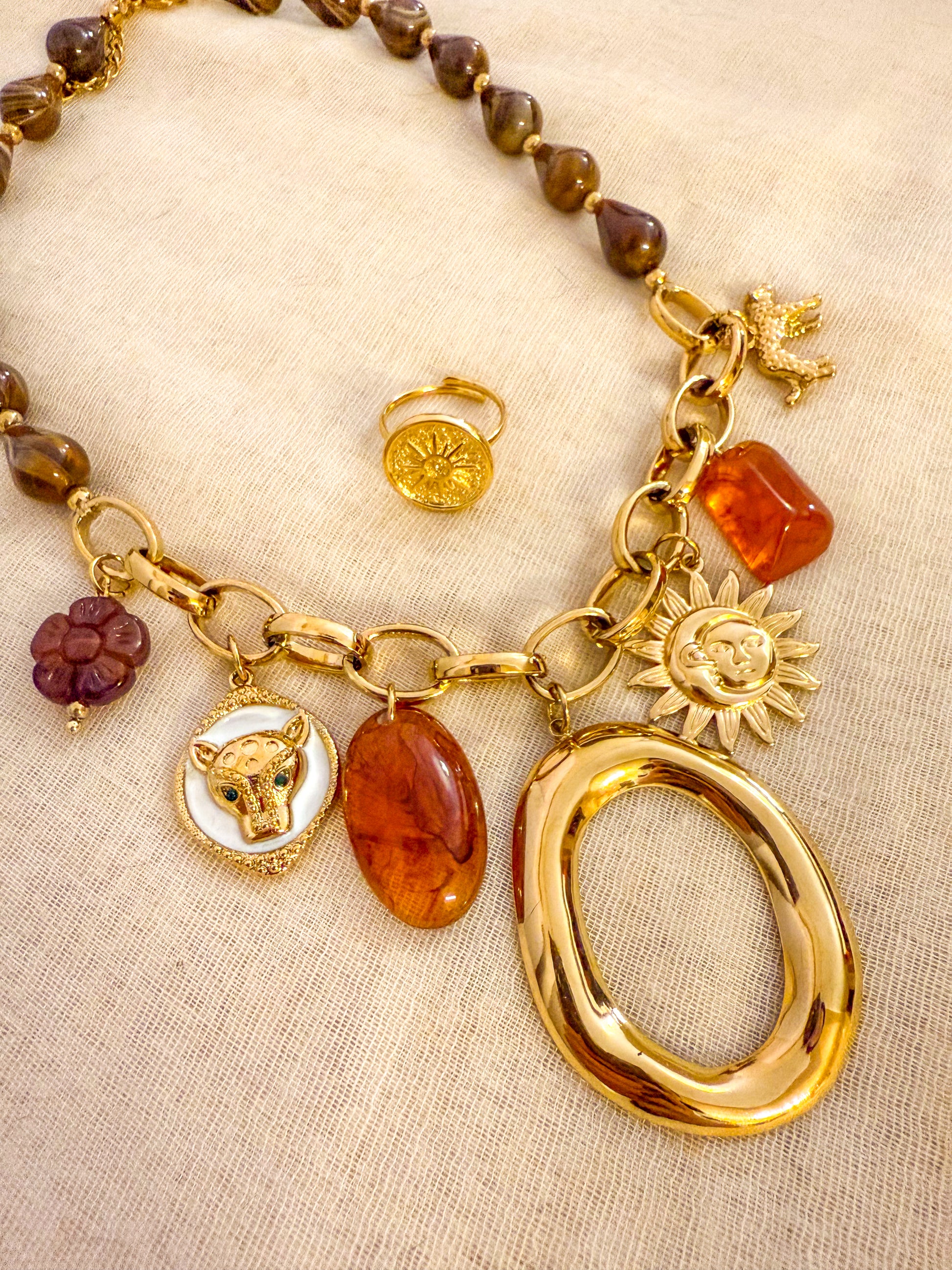Collar de eslabones dorados con colgantes inspirados en el sol, la naturaleza y la fuerza animal. Una pieza llamativa que combina textura, brillo y simbolismo en cada detalle.