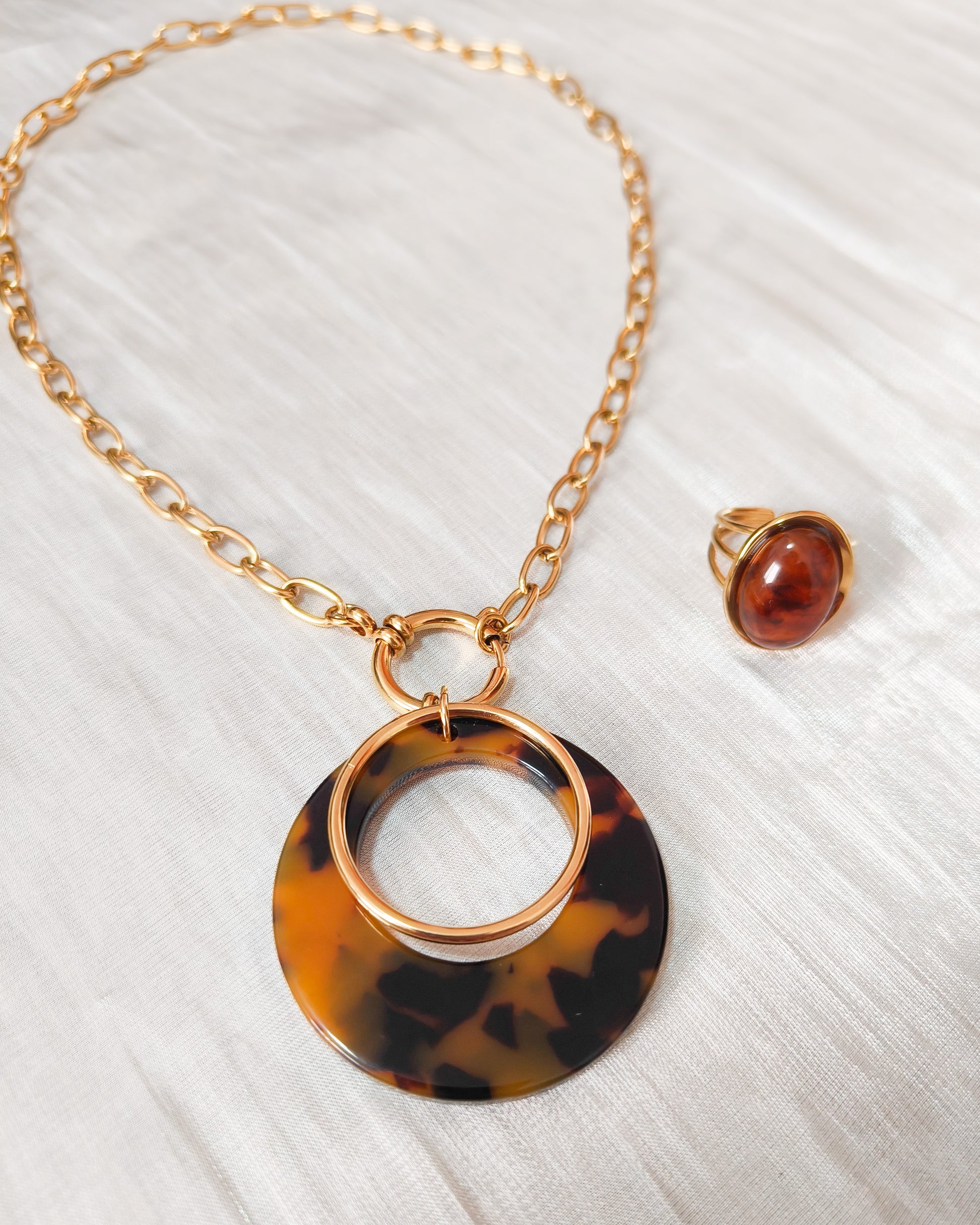 • Cadena dorada de acero inoxidable con colgante doble de círculos efecto carey, moderno y versátil.