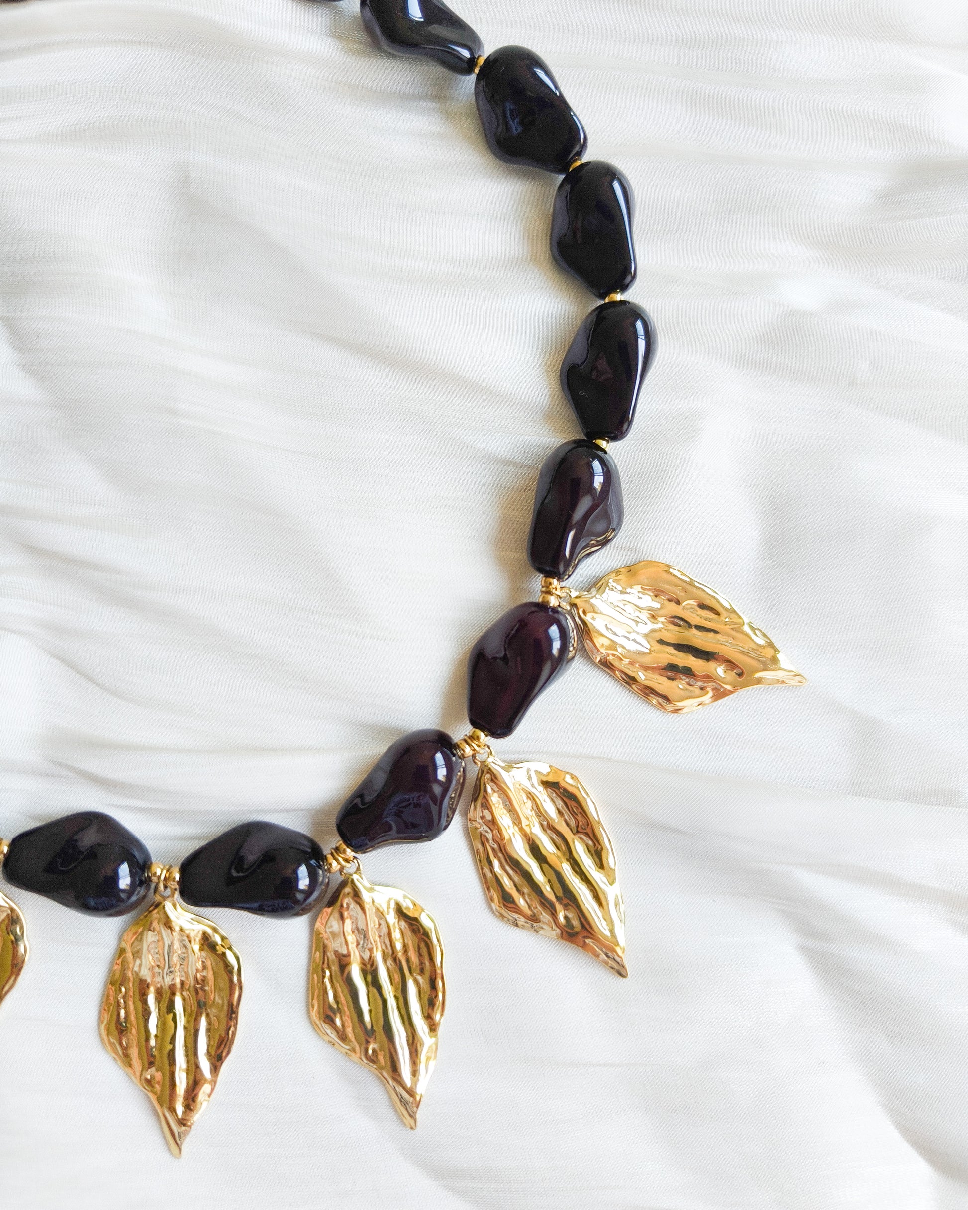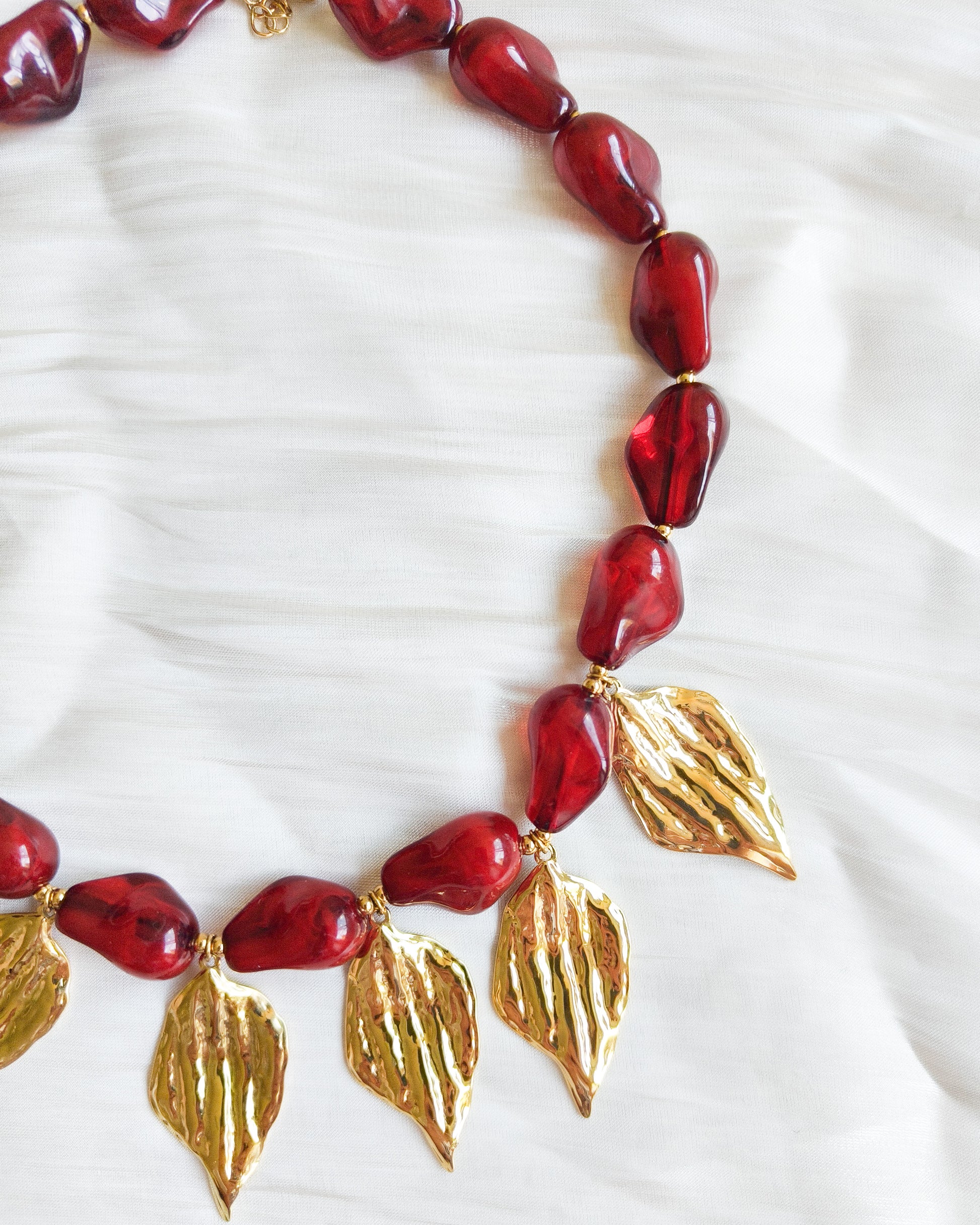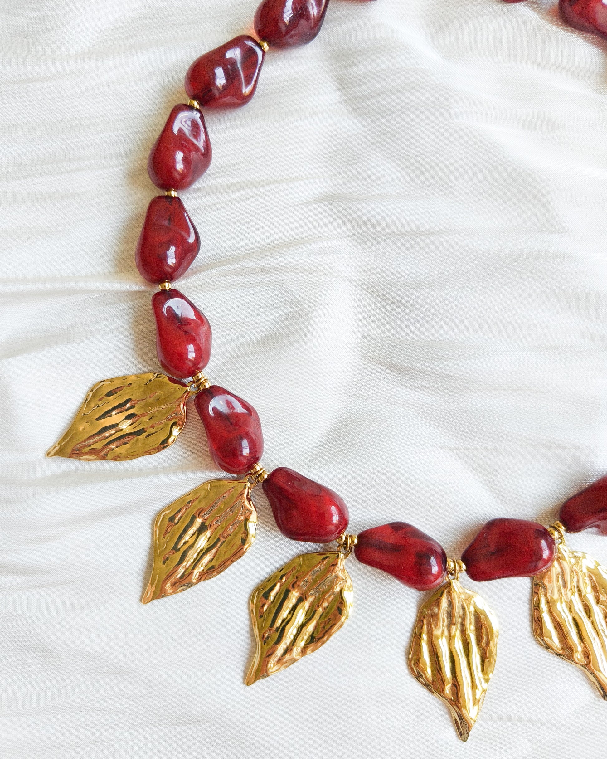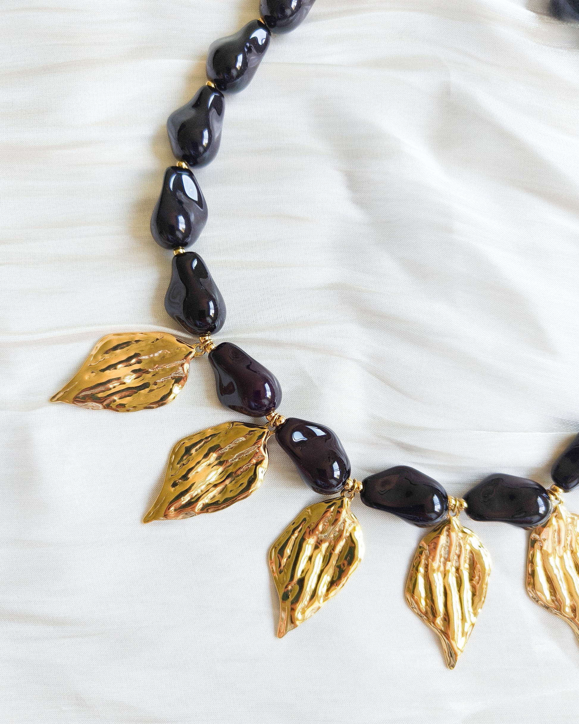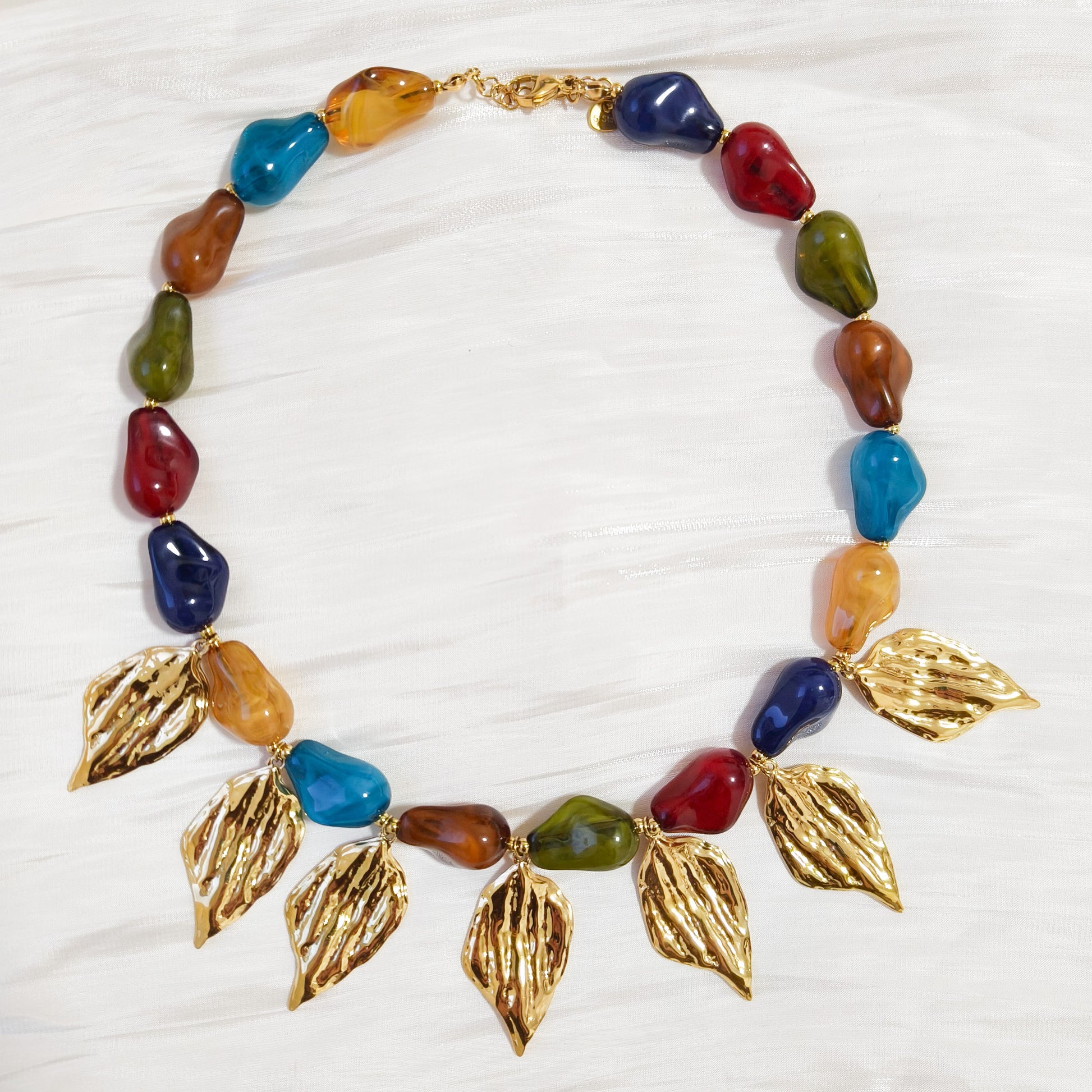 Collar con cuentas irregulares en tonos intensos, acompañado de hojas doradas que aportan un aire sofisticado y atrevido. Hecho en acero inoxidable, combina la fuerza del diseño con un toque natural y elegante. Perfecto para destacar en ocasiones especiales o elevar tu look diario.