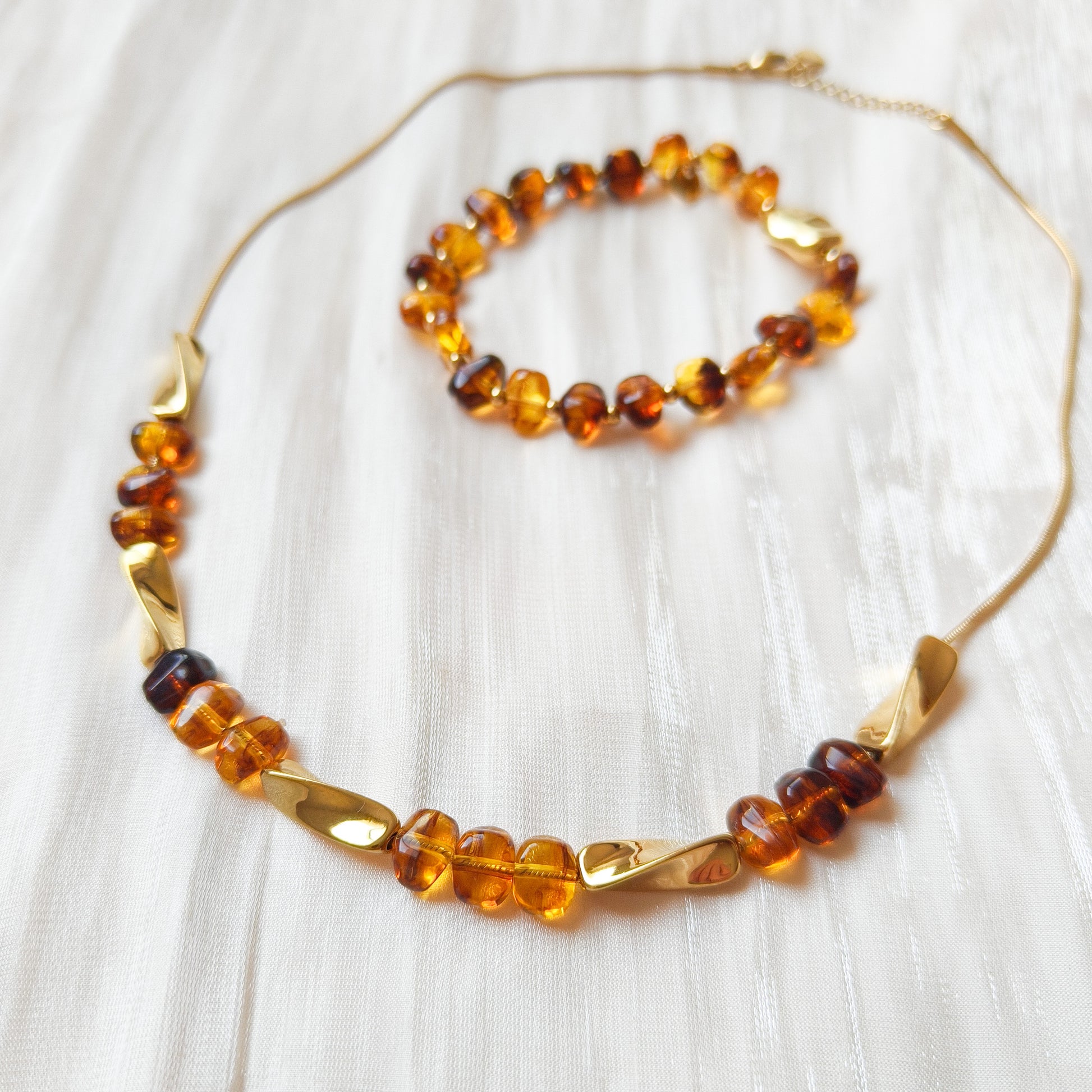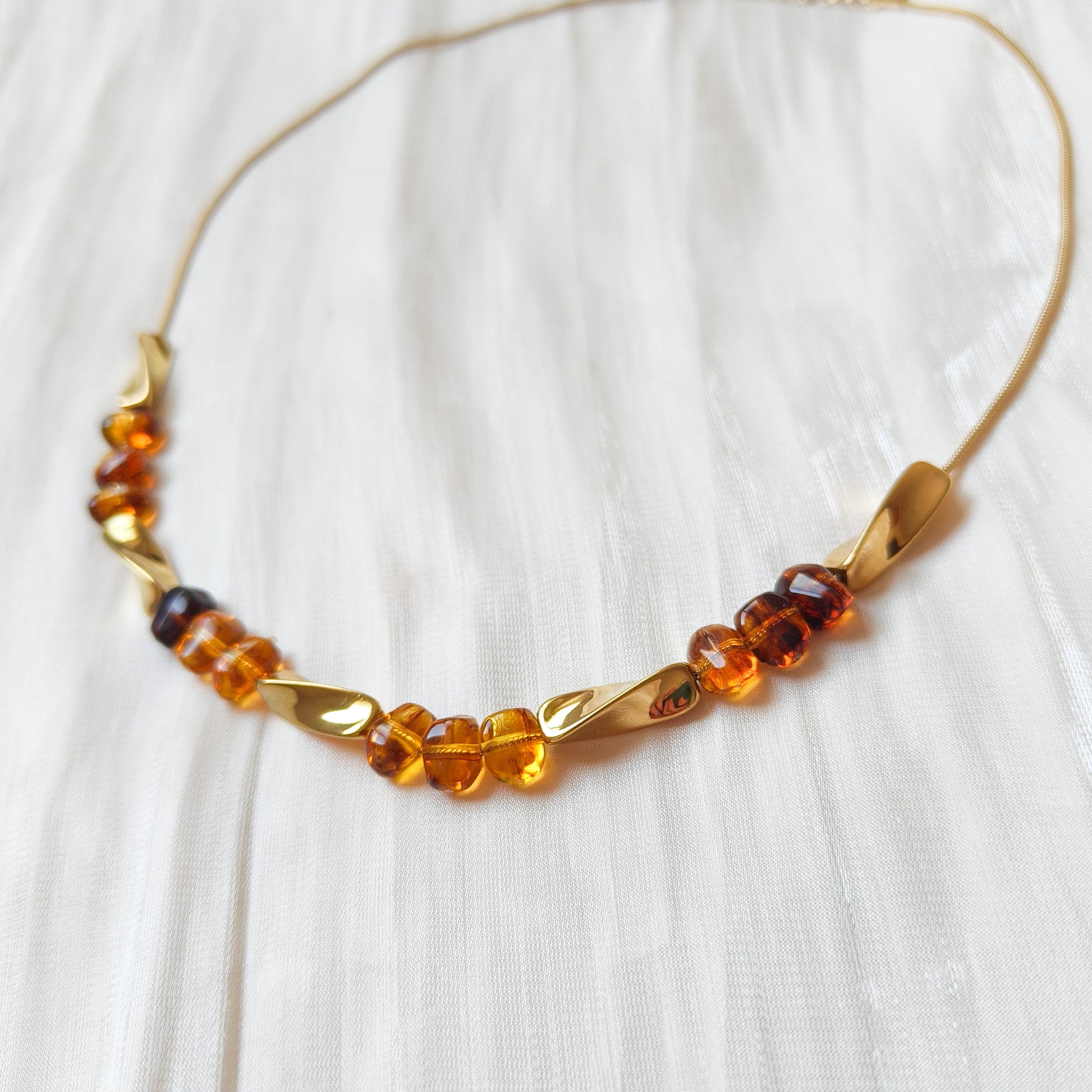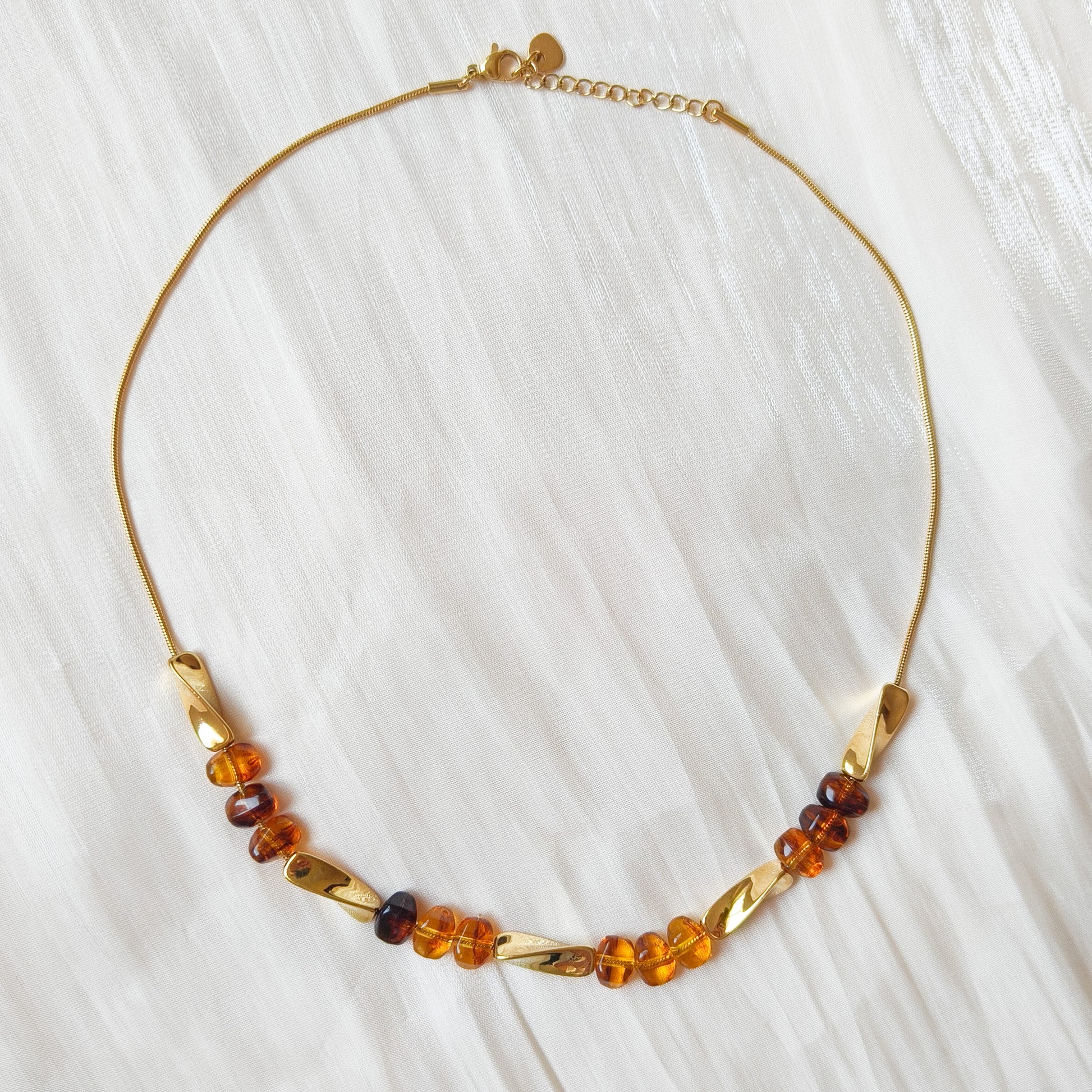 - Cadena tipo serpiente con cuentas efecto ámbar y módulos dorados que iluminan el escote.