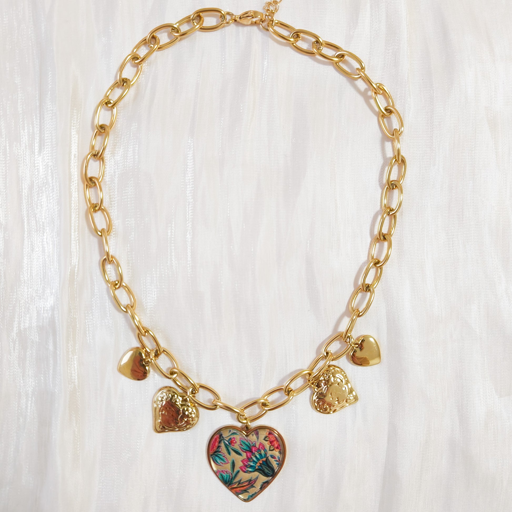 - Cadena de eslabones dorados con colgantes de corazones y pieza central estampada de flores en colores vivos, súper alegre y romántica.