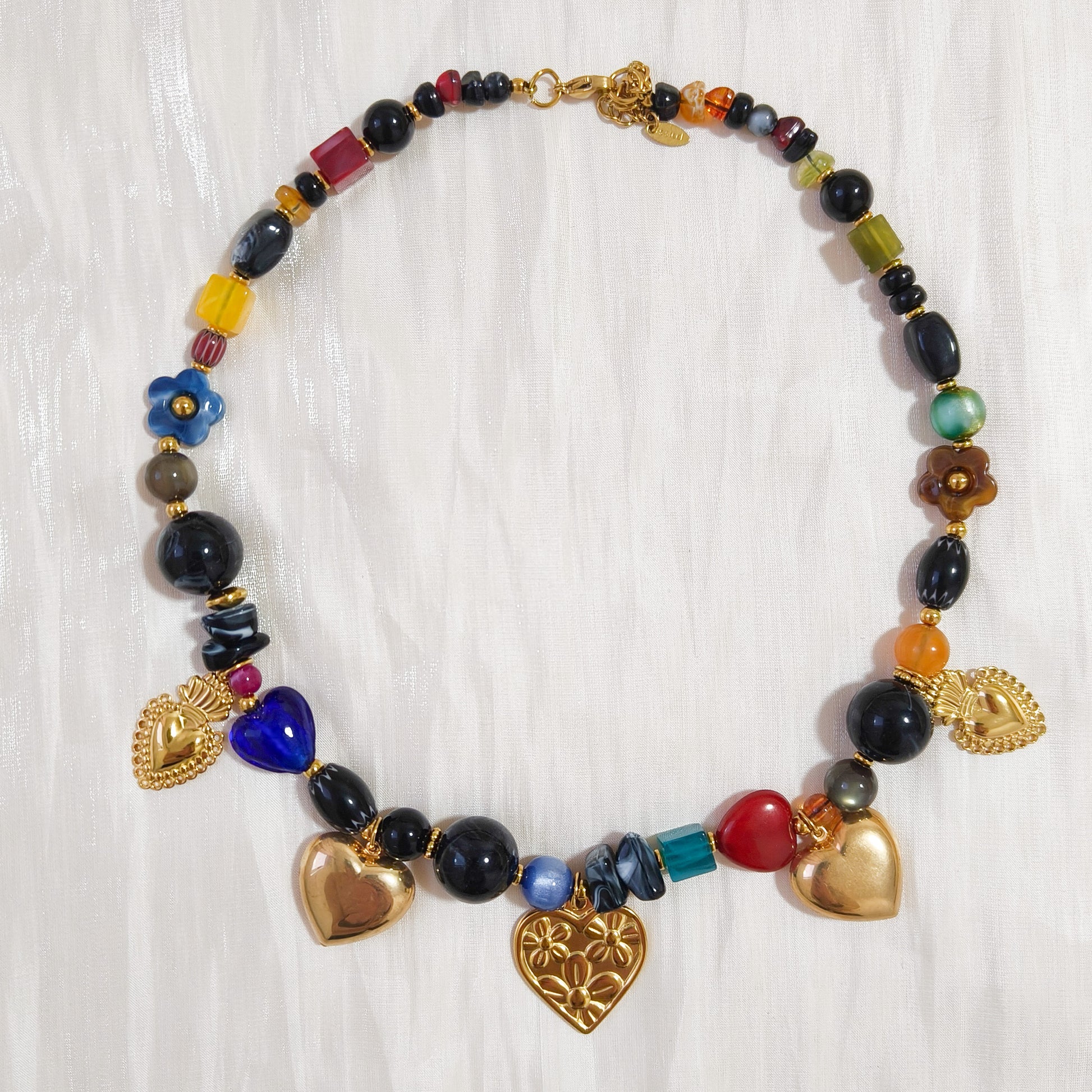 - Collar de cuentas multicolor con corazones dorados y detalles en forma de flor y corazón que llenan el cuello de alegría.
