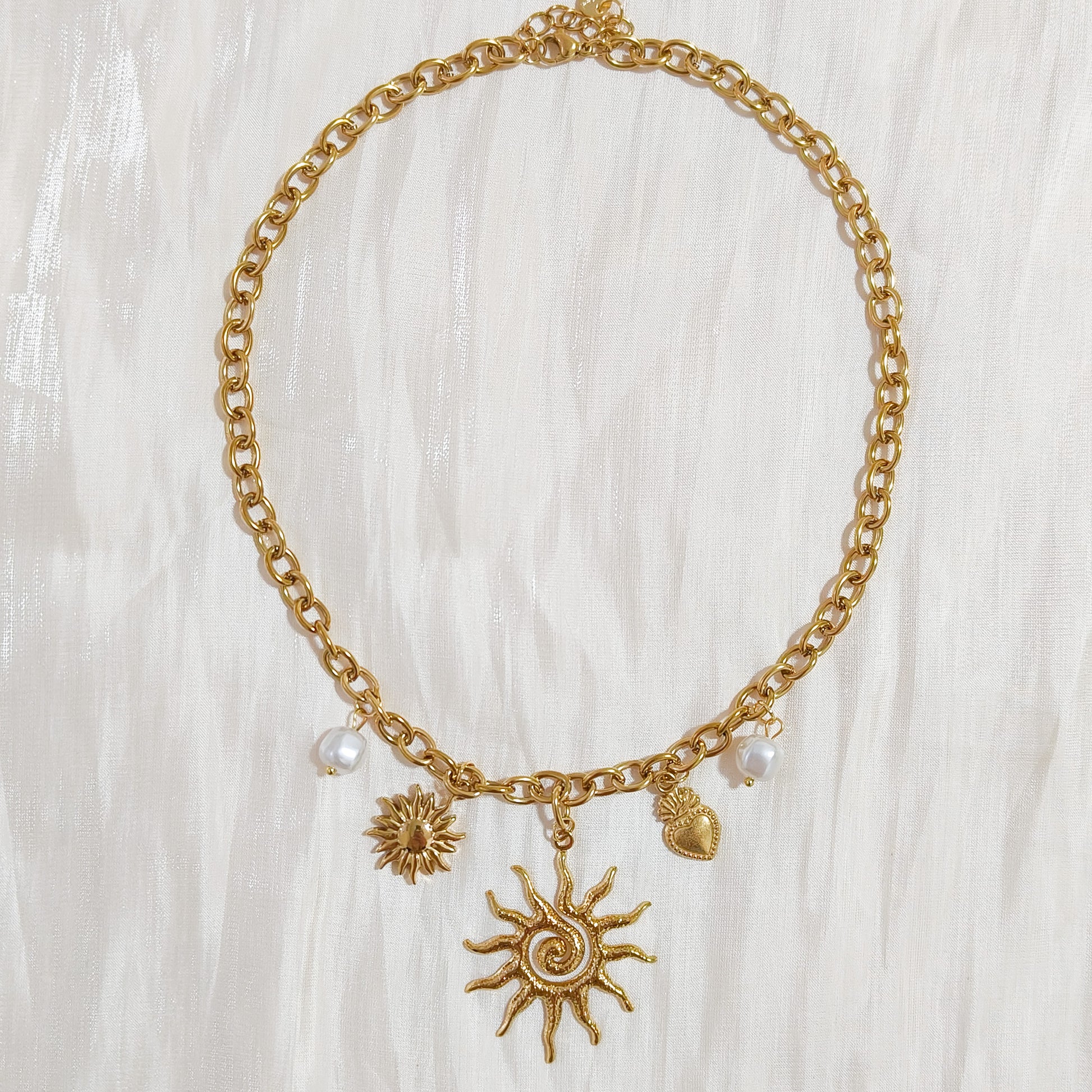 - Cadena gruesa con colgante de sol grande en el centro y pequeños charms de corazón y perlita de fantasía.
