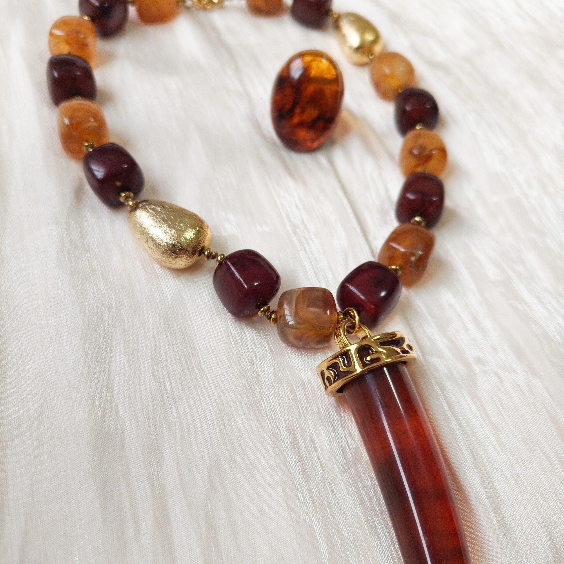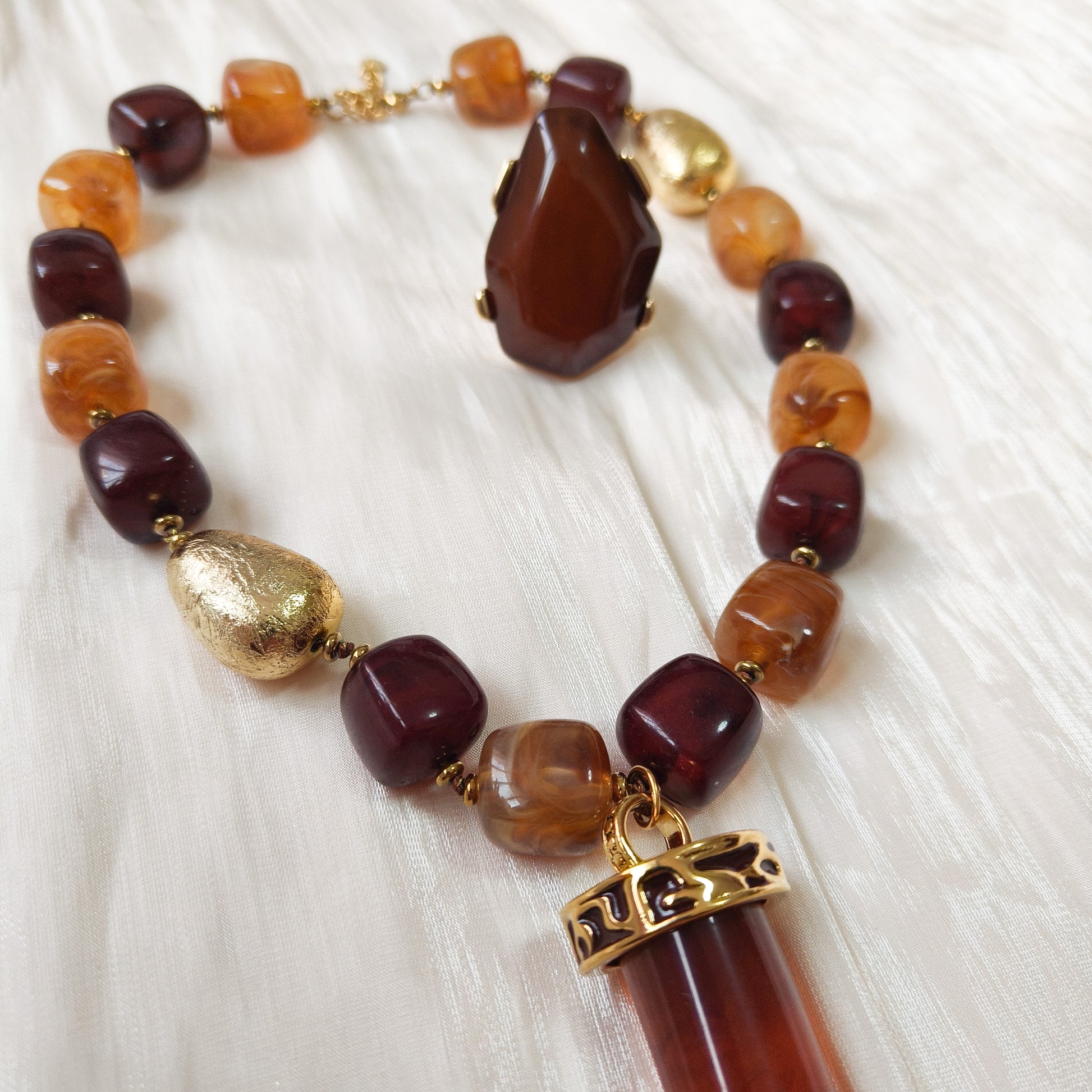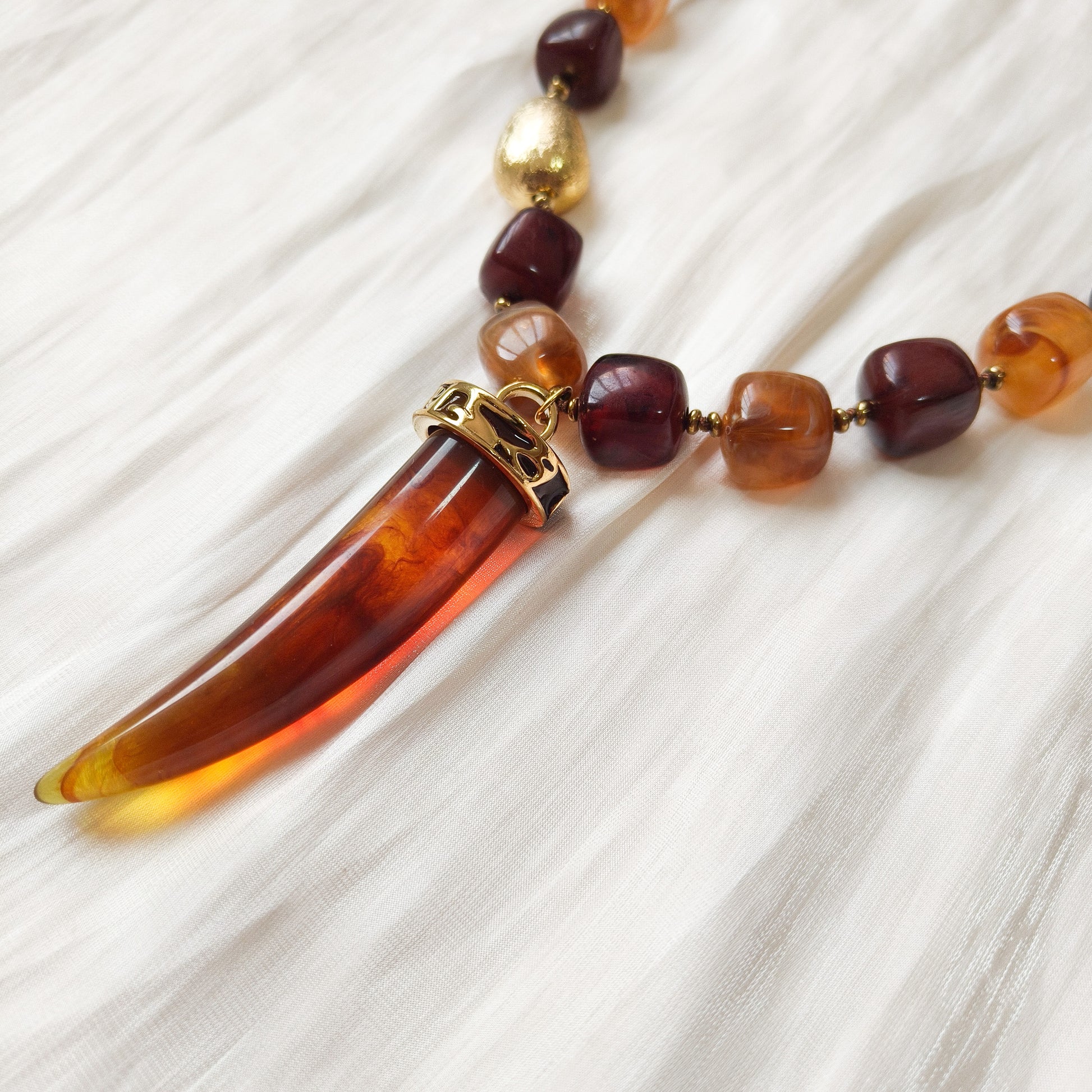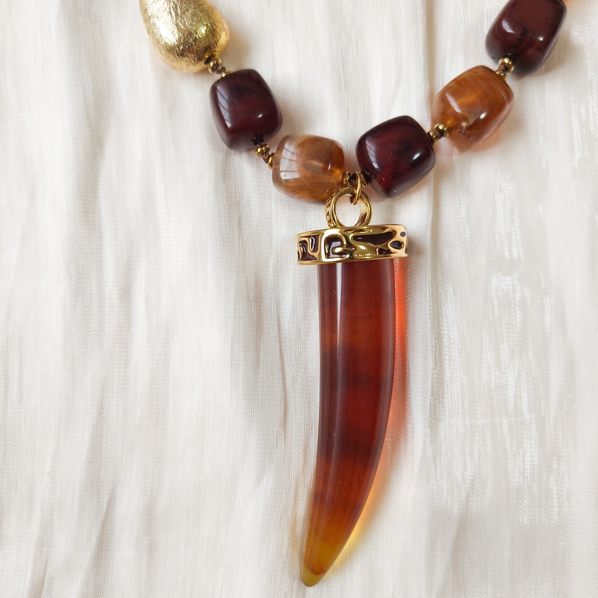- Collar artesanal con cuentas en tonos miel y chocolate, acompañado de un colgante alargado de la forma del diente de lobo que aporta un toque audaz y exótico.