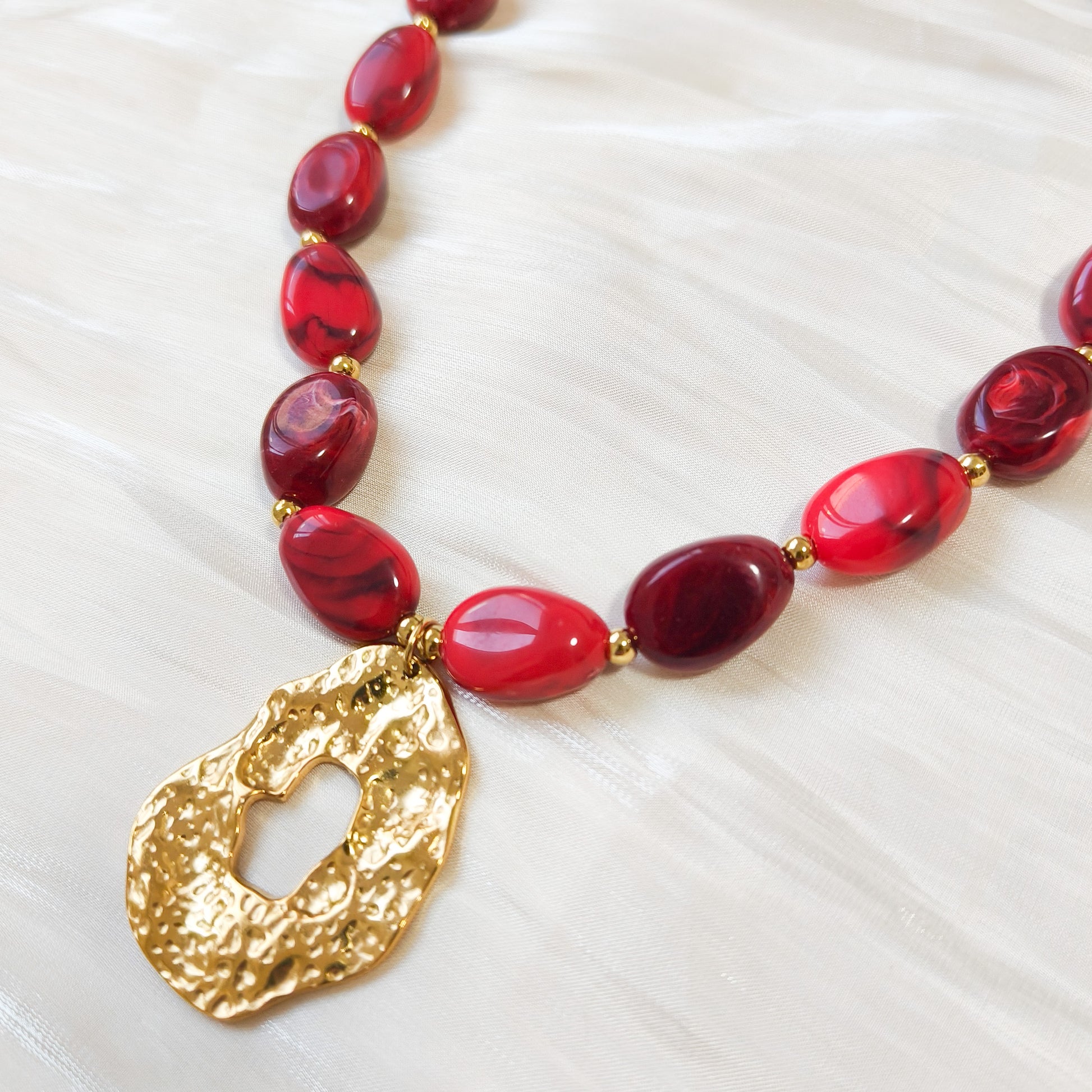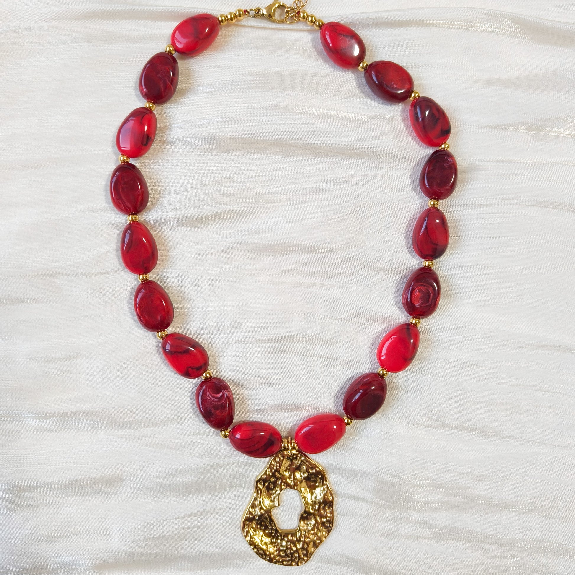 - Cuentas ovaladas en rojo intenso efecto mármol con un colgante dorado orgánico en el centro.