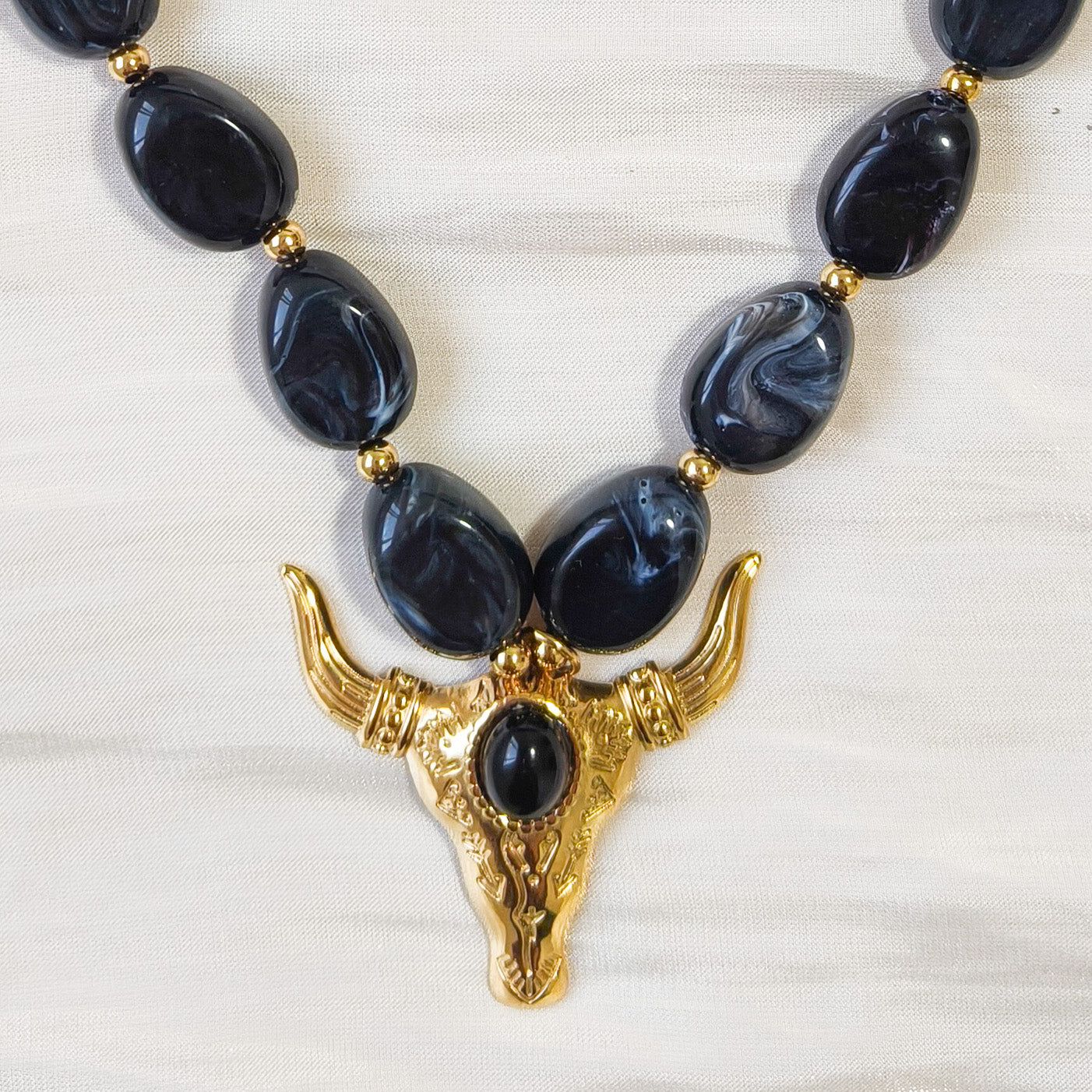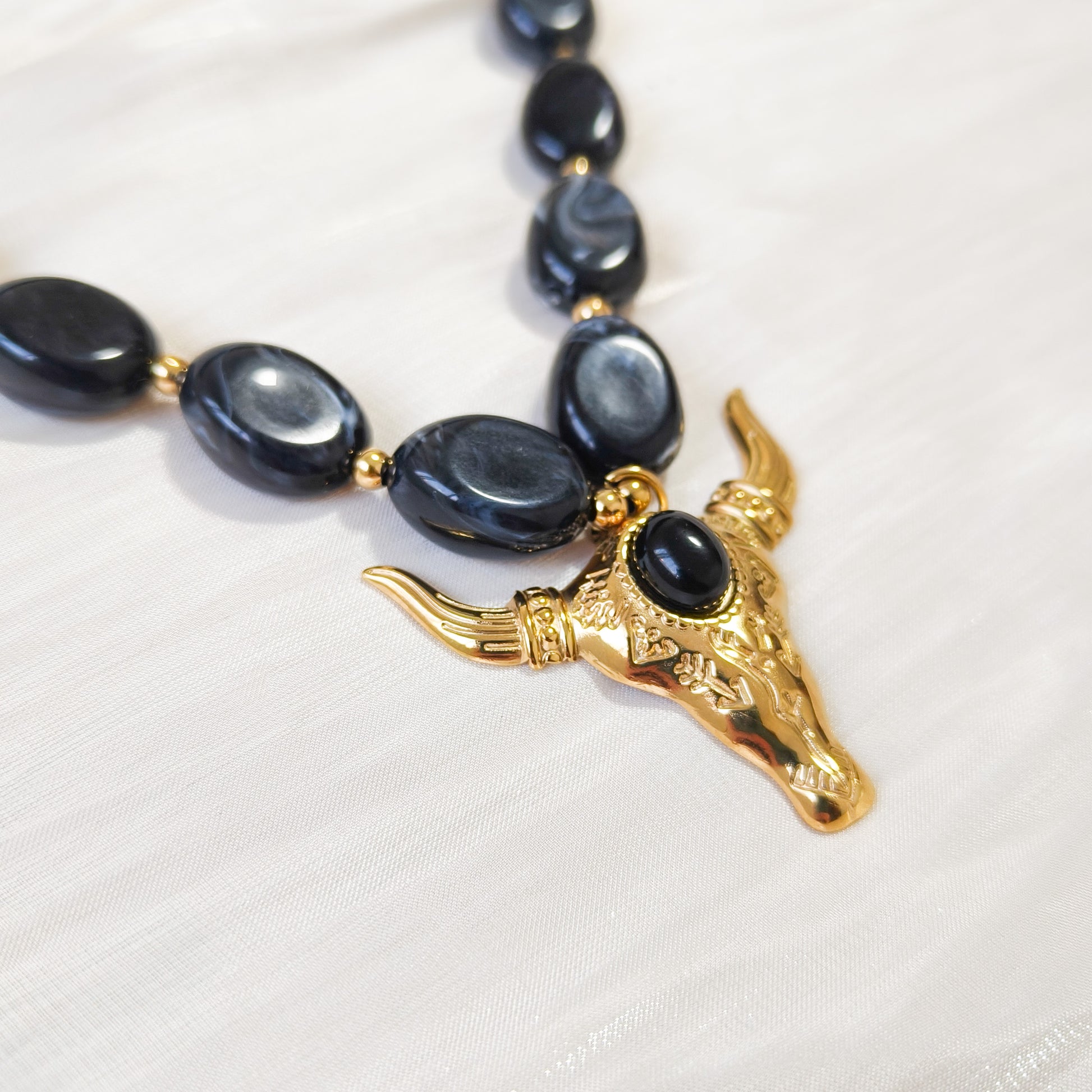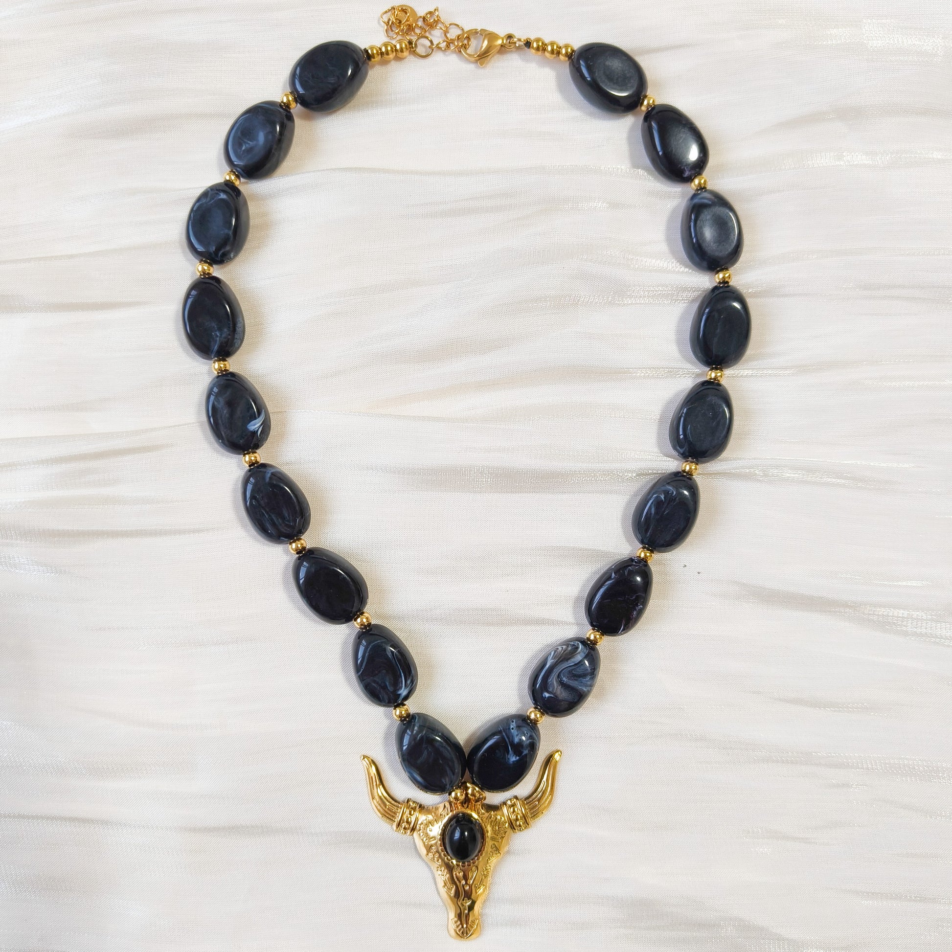 - Collar de cuentas negras efecto piedra con un colgante de cabeza de toro dorado muy vistoso.