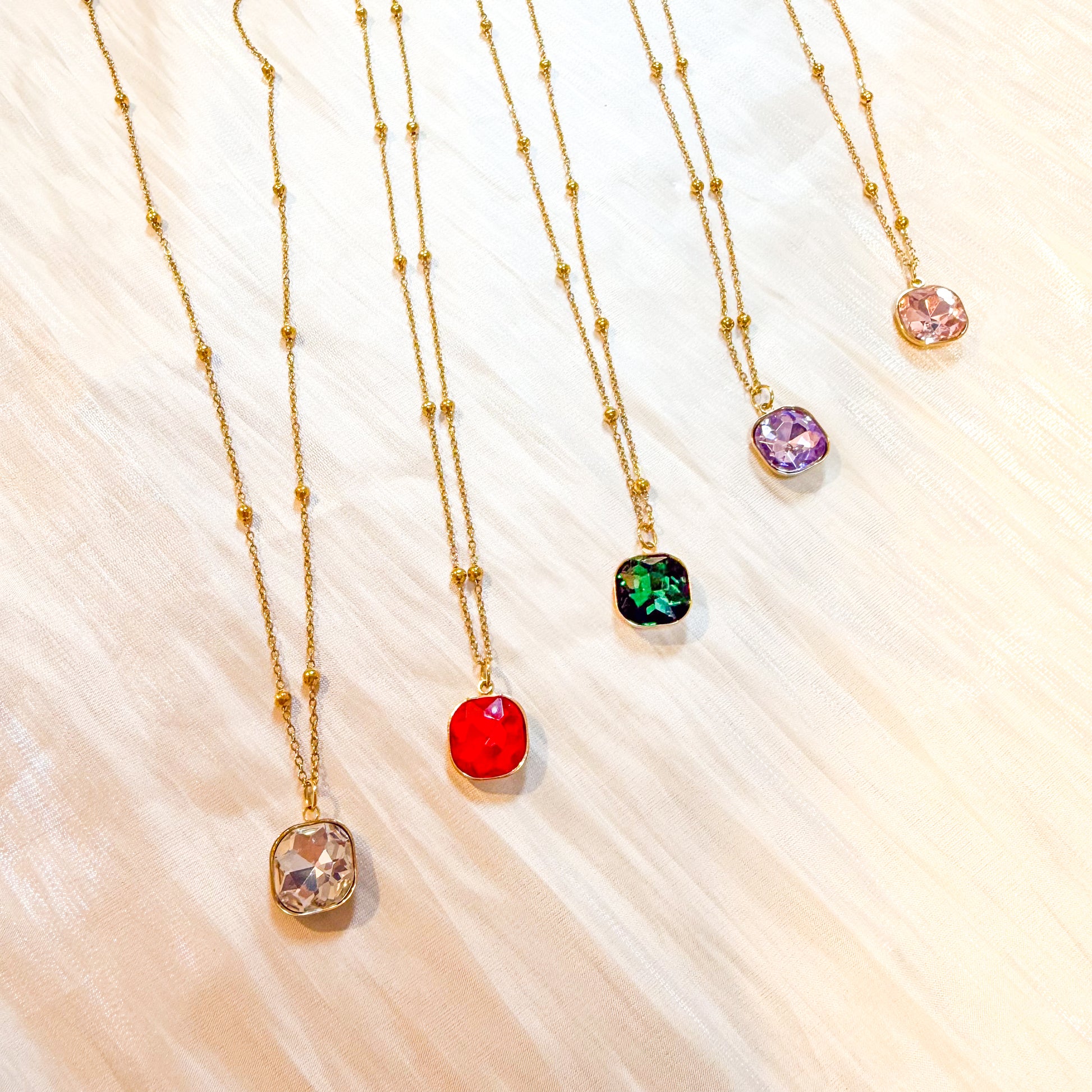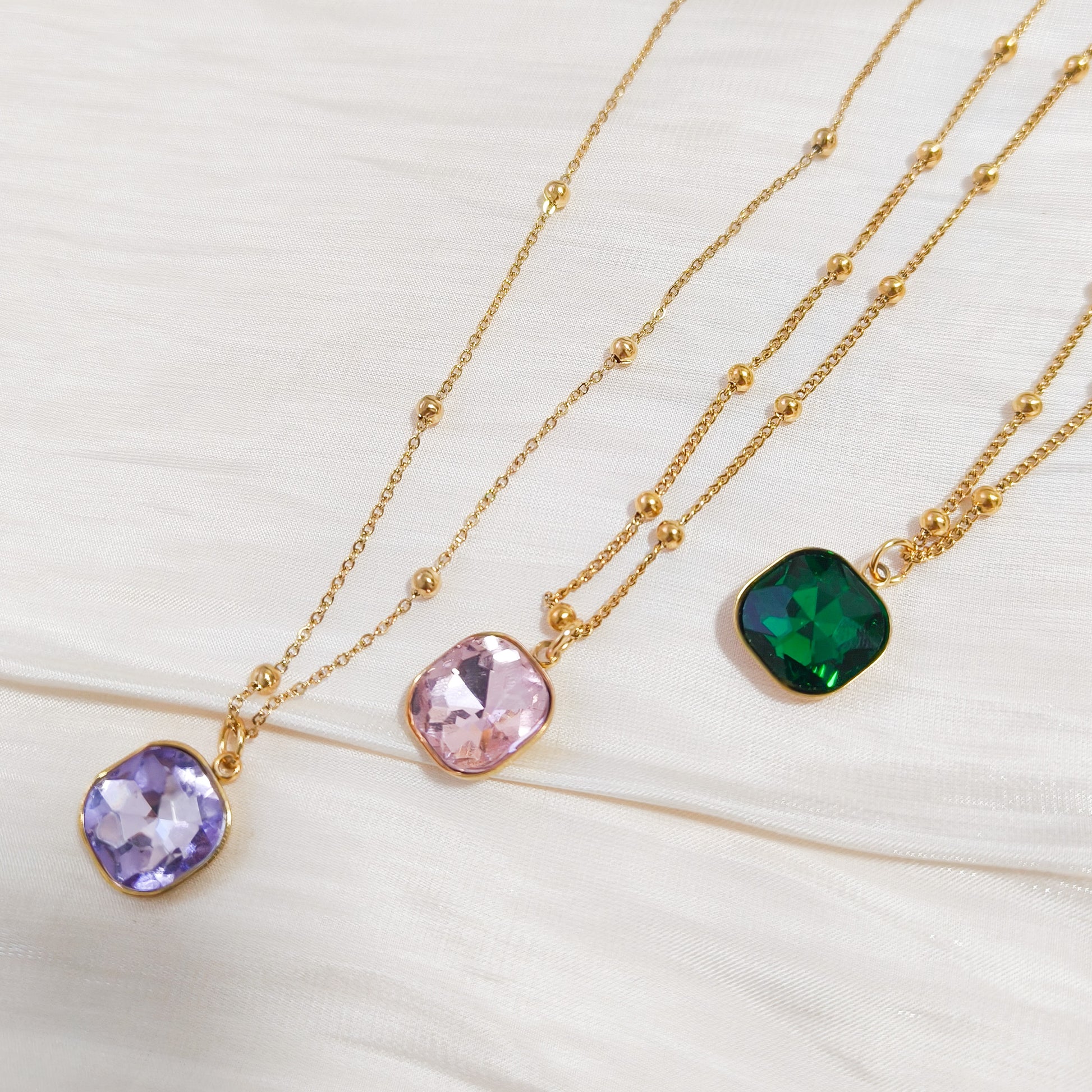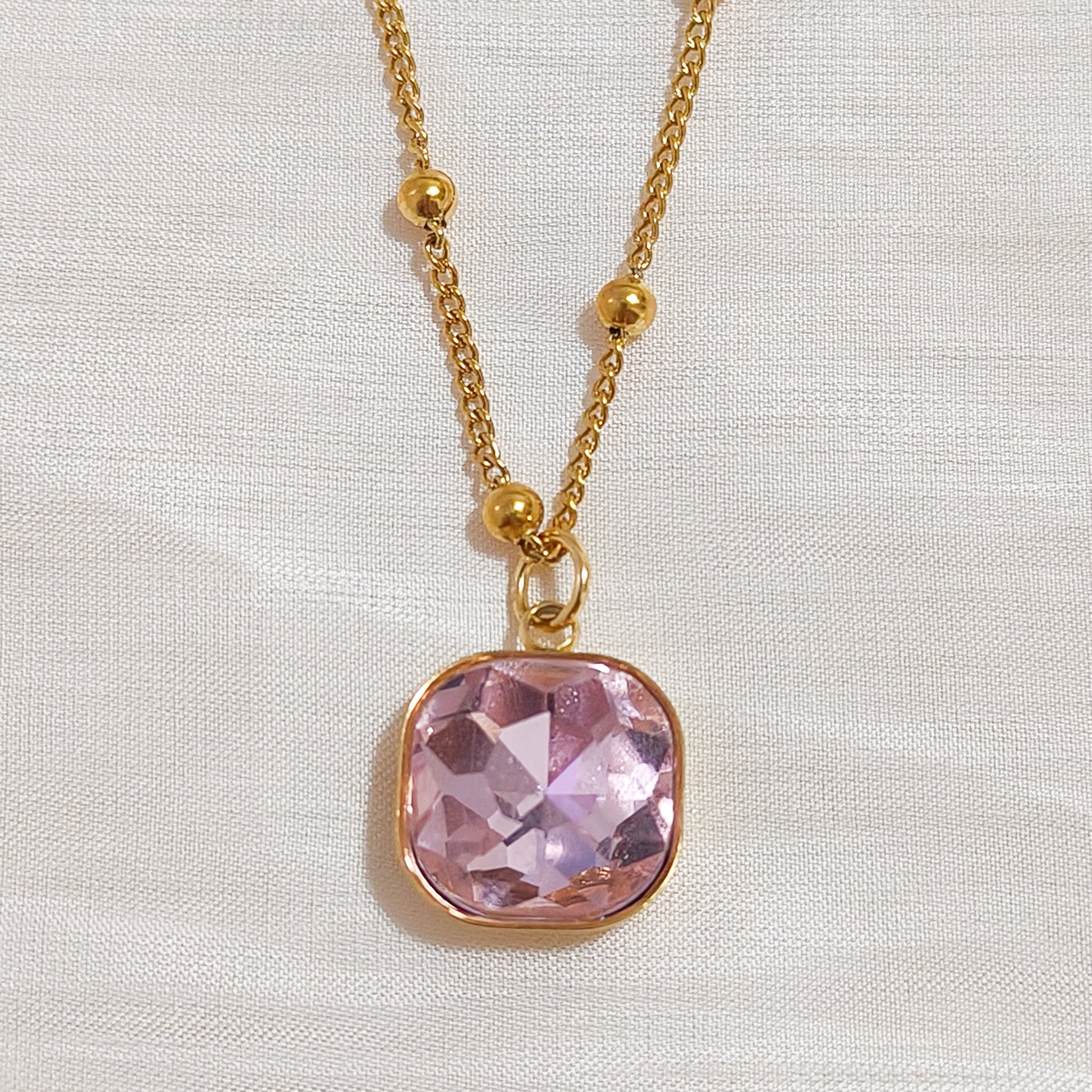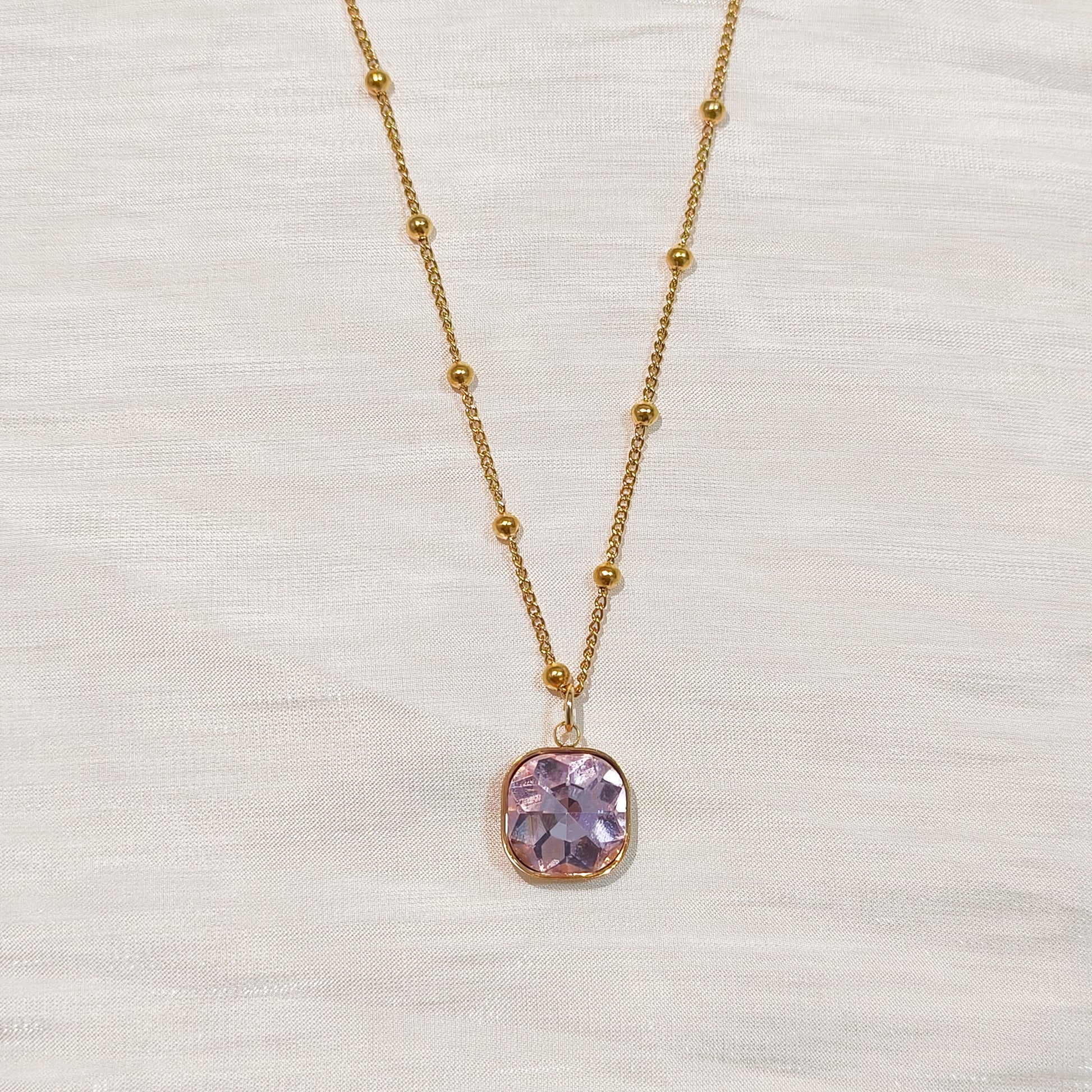 - Cadena finita con bolitas doradas y un cristal de fantasía cuadrado disponible en lila, rosa o verde.